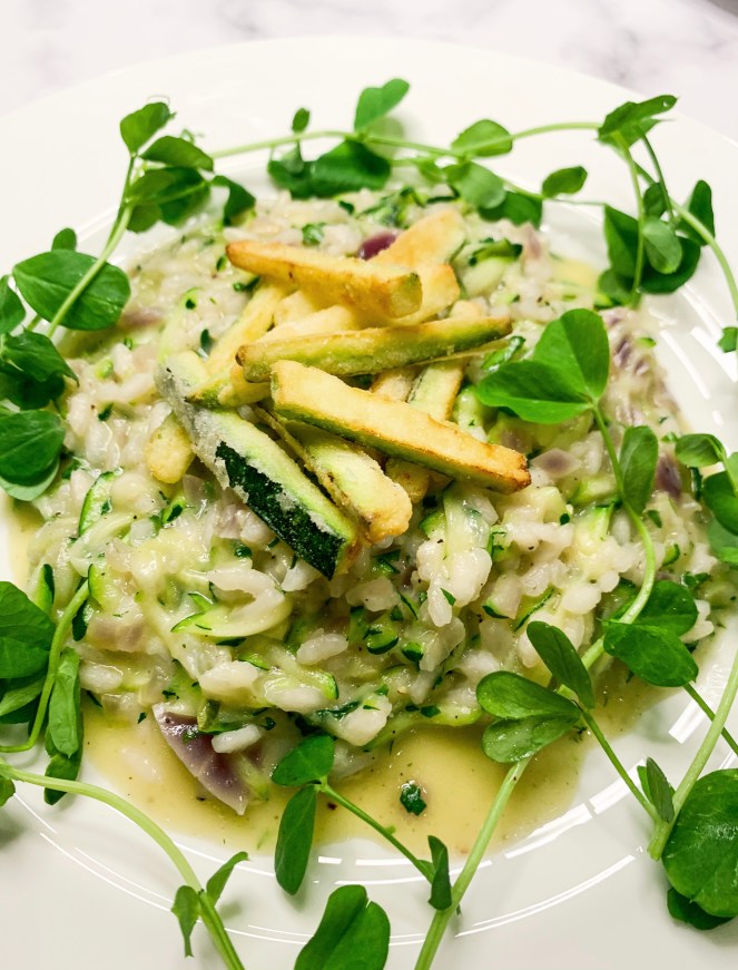 - Set a large saucepan over a medium-to-high heat with 3 spoons of olive oil. Add the chopped courgettes and tomatoes. Season with salt & pepper, cover (leaving a gap) and cook for 10 mins. Mix every so often. Stir in the 6 cloves of chopped garlic and cook for another 5 mins. Wash the chickpeas under cold water, drain and add to the pot. Season and simmer for another 5 mins. Stir in the peas and basil.