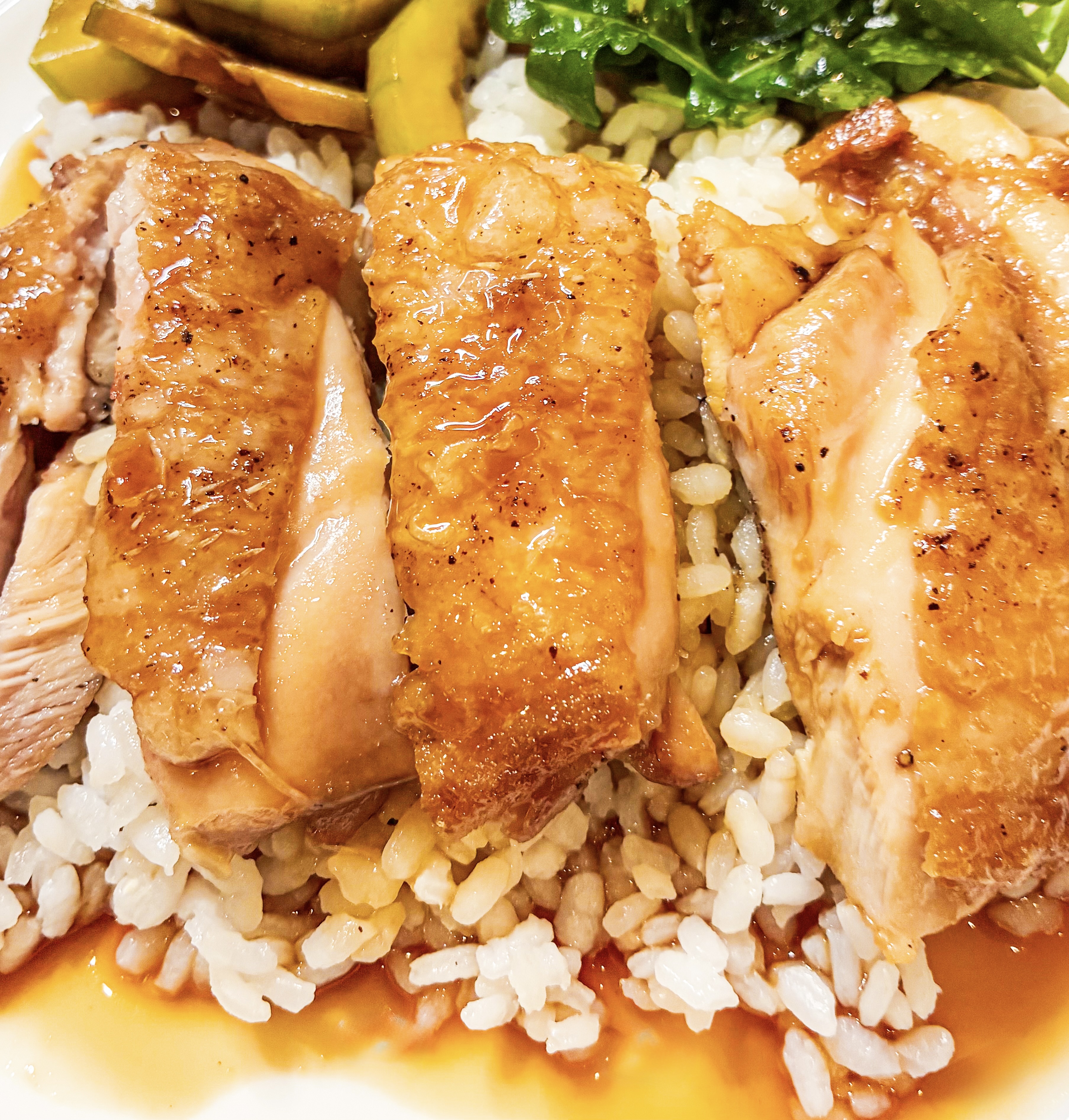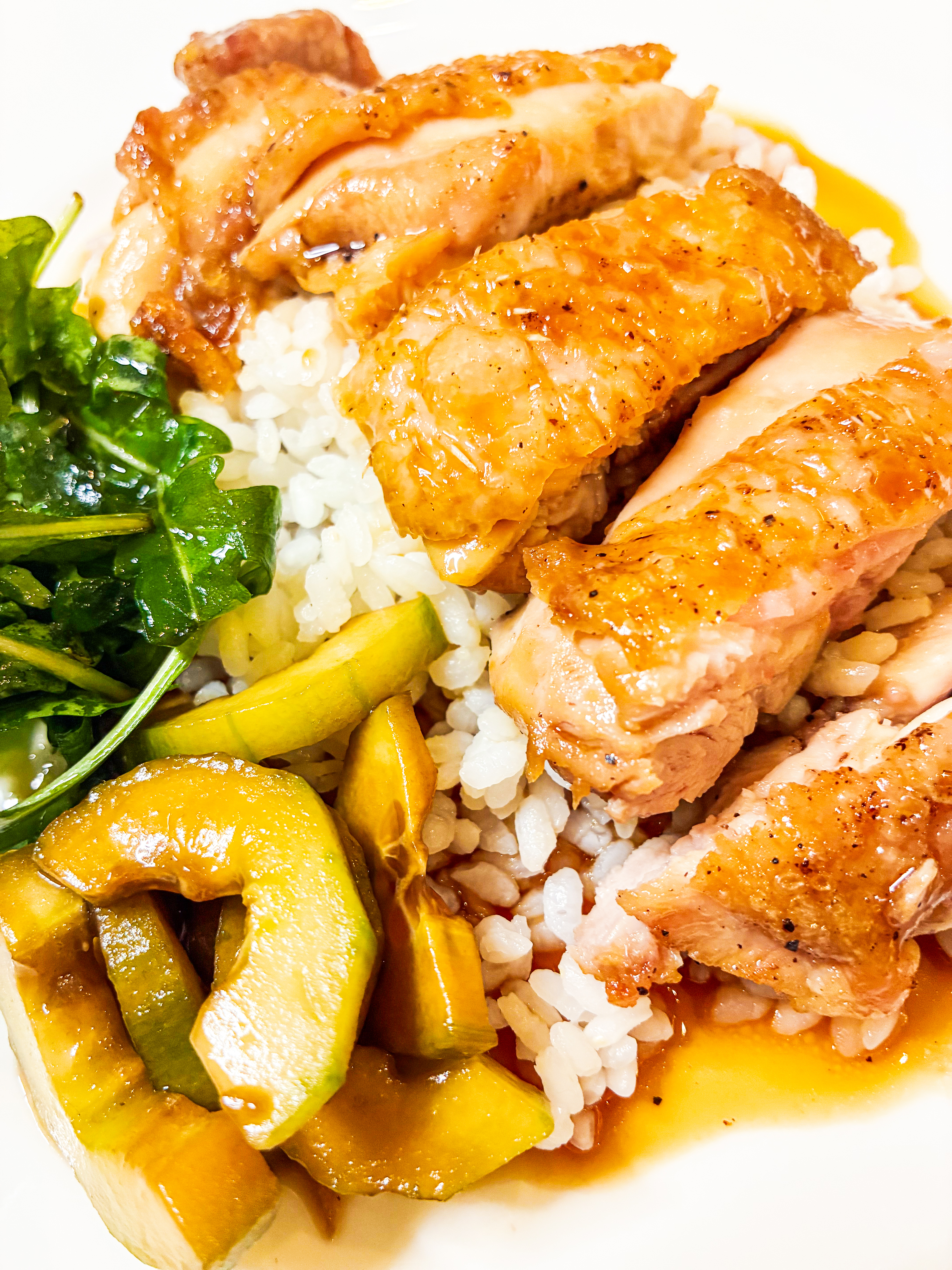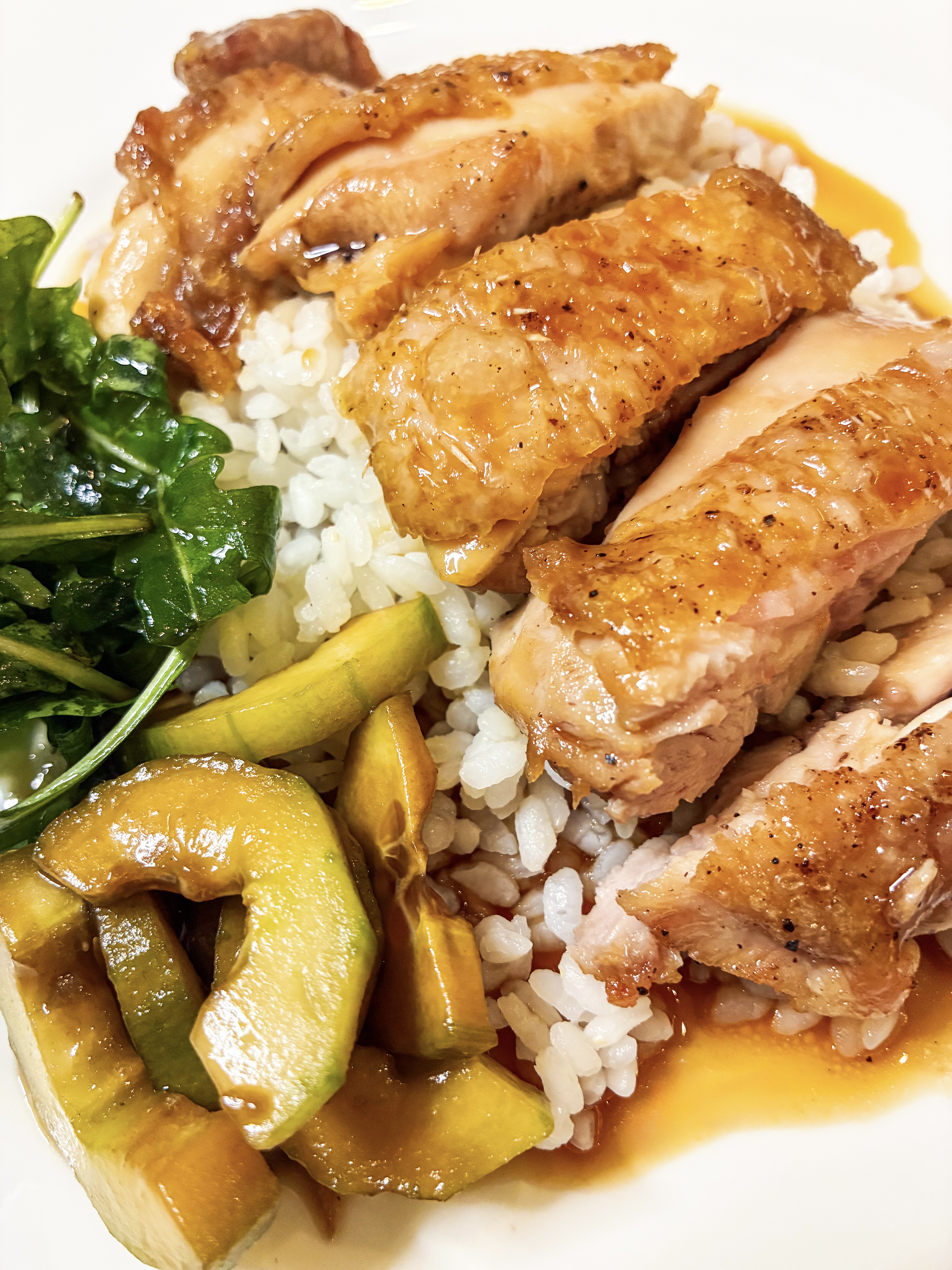 - Slice the chicken into slices (if you like, you can use a blow-torch to give a crispier sear to the skin).