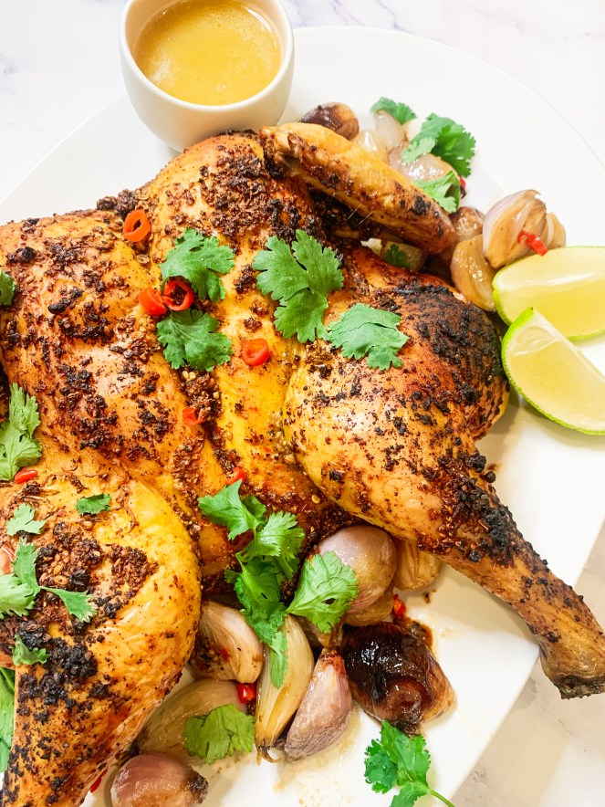- Combine all the marinade ingredients in a blender and blitz to a paste. Rub it generously over the chicke, front and back. Place in a large container, cover and marinate for at least 1 hour, ideally overnight.