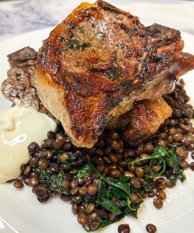 Pan-Fried Lamb Chops with Balsamic Puy Lentils, Herbs and Crème Fraiche (Serves 4)