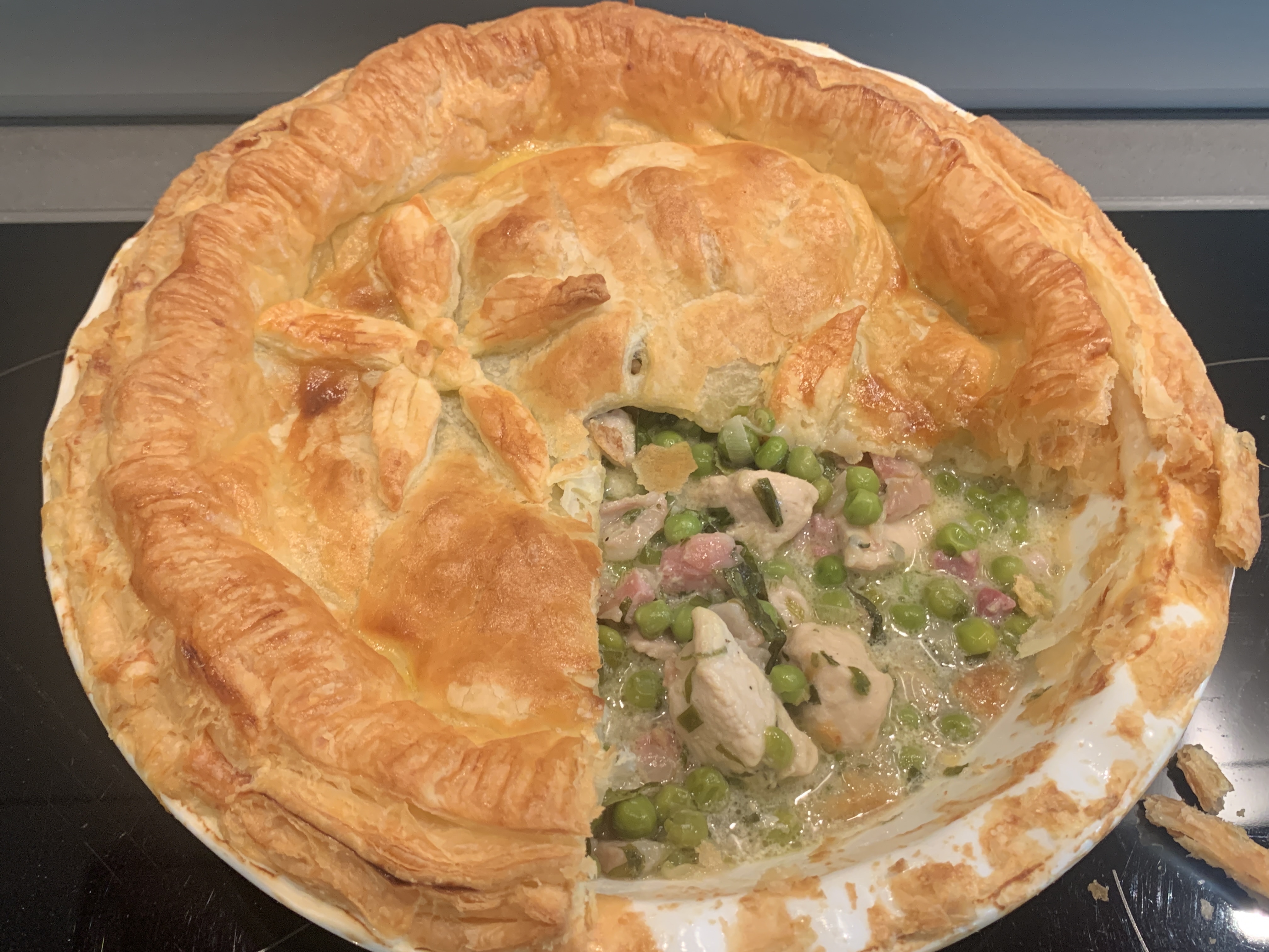 This is an absolute favourite in our house and one which Felix insists that I cook when he is back from university! It is a recipe that I picked up from a magazine years ago and have tweaked over the years. I’m gluten free, so unfortunately these days I can’t eat the pastry, but the filling is a treat in itself. I usually serve this with buttered new potatoes. I use ‘Jus Rol, Ready Rolled Puff Pastry’, they have started to make a gluten free puff pastry, I haven’t tried it, but I have heard mixed reviews and so for the moment I will continue to be an unselfish ‘head cook’ and stick to the normal pastry that both Nick and Felix love! I prefer to use fresh chicken stock, but you could use a stock cube.