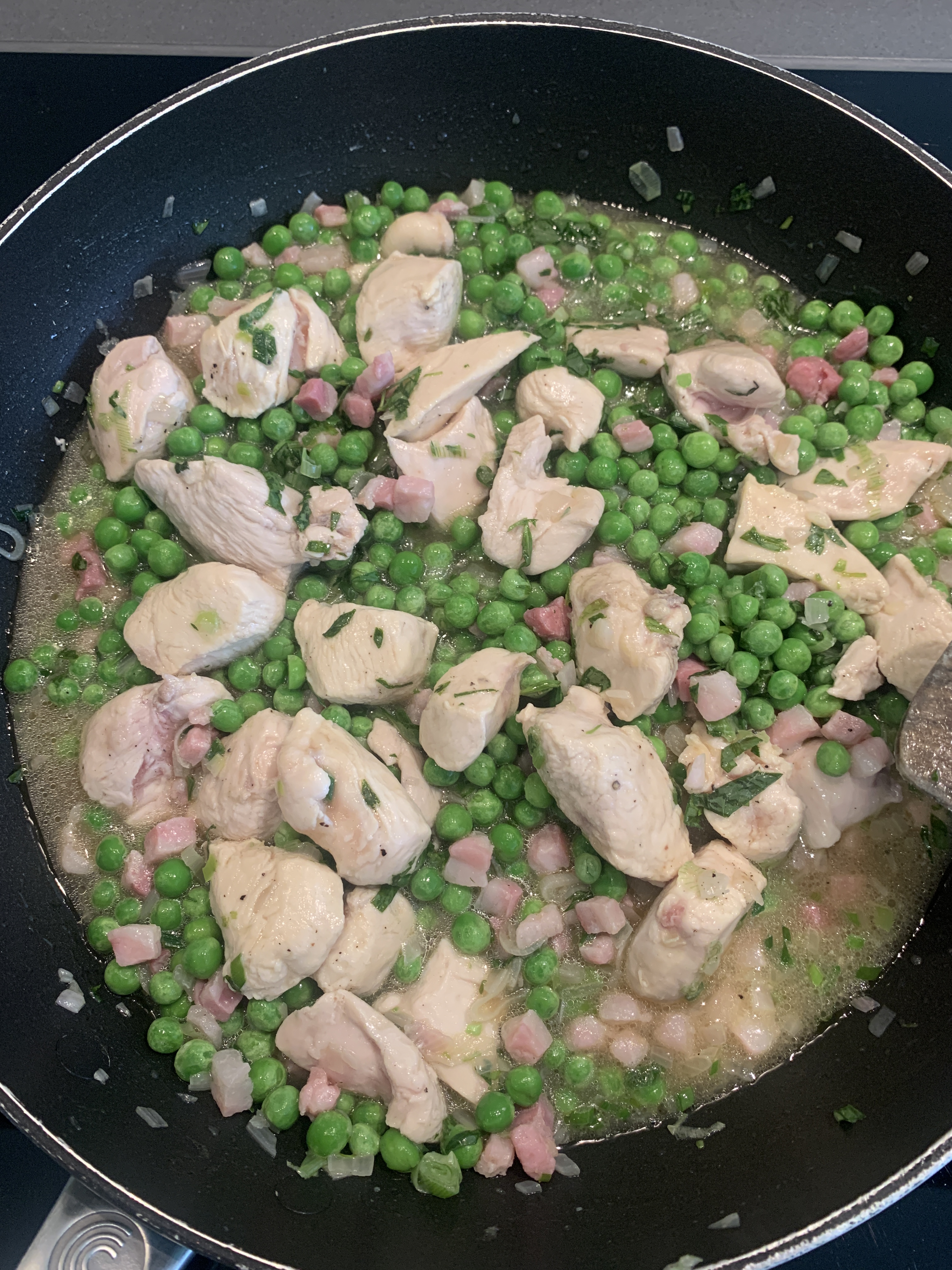 - Pour in the chicken stock and peas, bring to a simmer, and add the chopped leaves of 6-7 of the sprigs of tarragon. Cook for 5 minutes until the peas are tender.