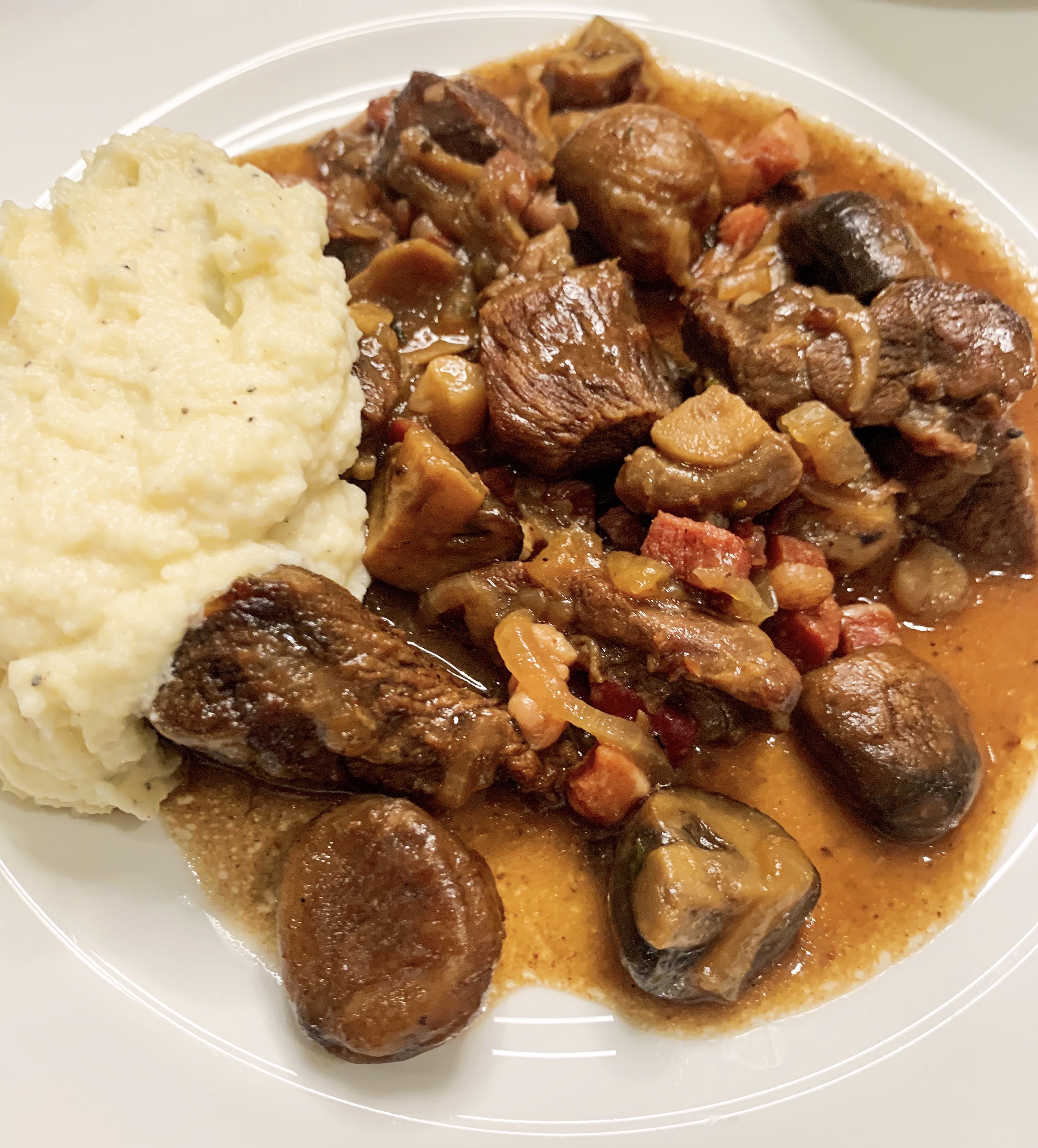Venison Casserole with Madeira, Chestnuts & Mushrooms served with Potato & Celeriac Purée with Garlic (Serves 4)