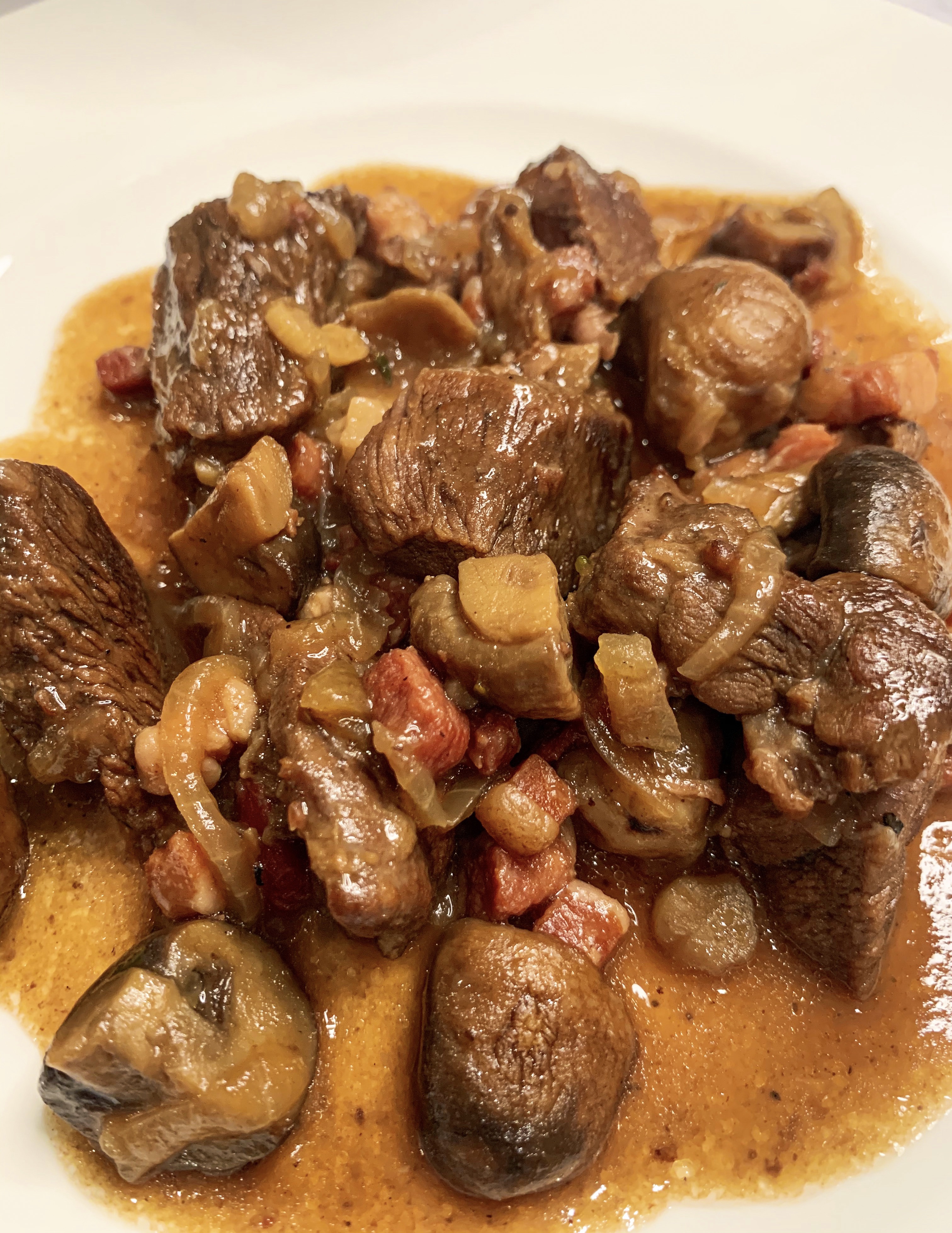 - Finally, add the fresh mushrooms to the casserole and toss in the hots juices for another minute or so, then return the venison, pancetta and onions to join them in the pan. Stir well, adding a seasoning of salt and pepper and the flour.
