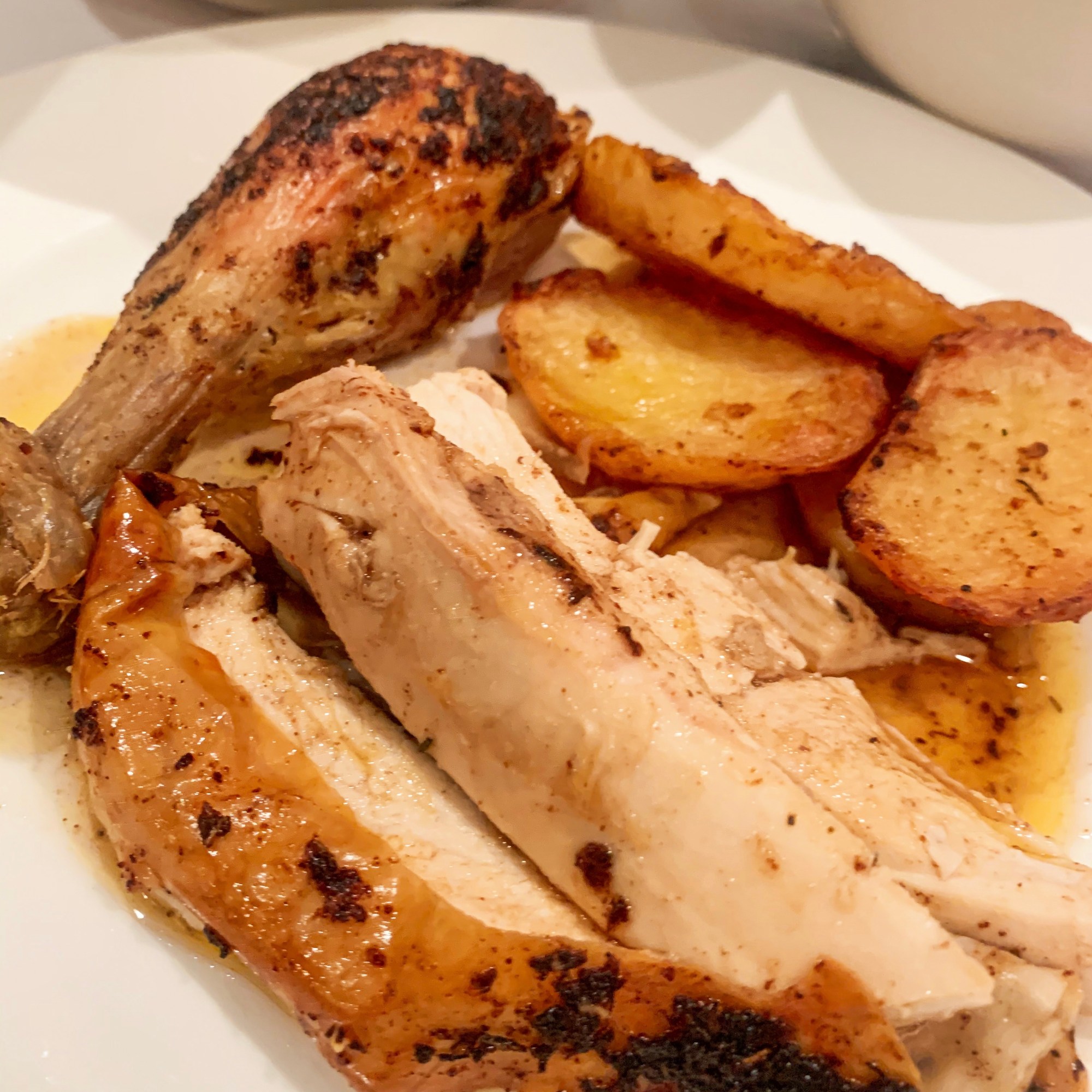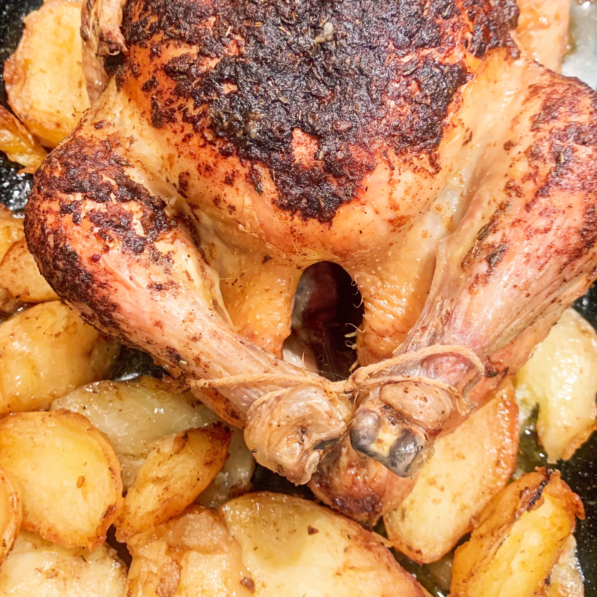 - Roast in a preheated oven, 130’c fan, for around 2½ hours. Baste the chicken and potatoes a few times during the cooking time.