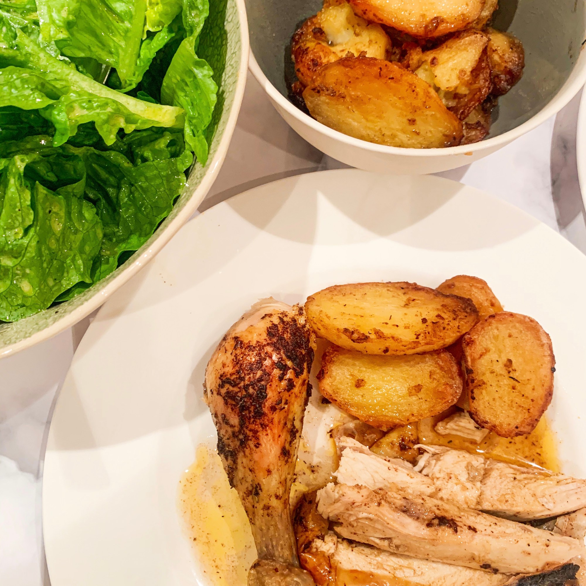 - Serve the carved chicken with the potatoes and pan juices spooned over. It is delicious with a simple green salad with a classic vinaigrette (recipe here) and a beetroot salad (recipe below).