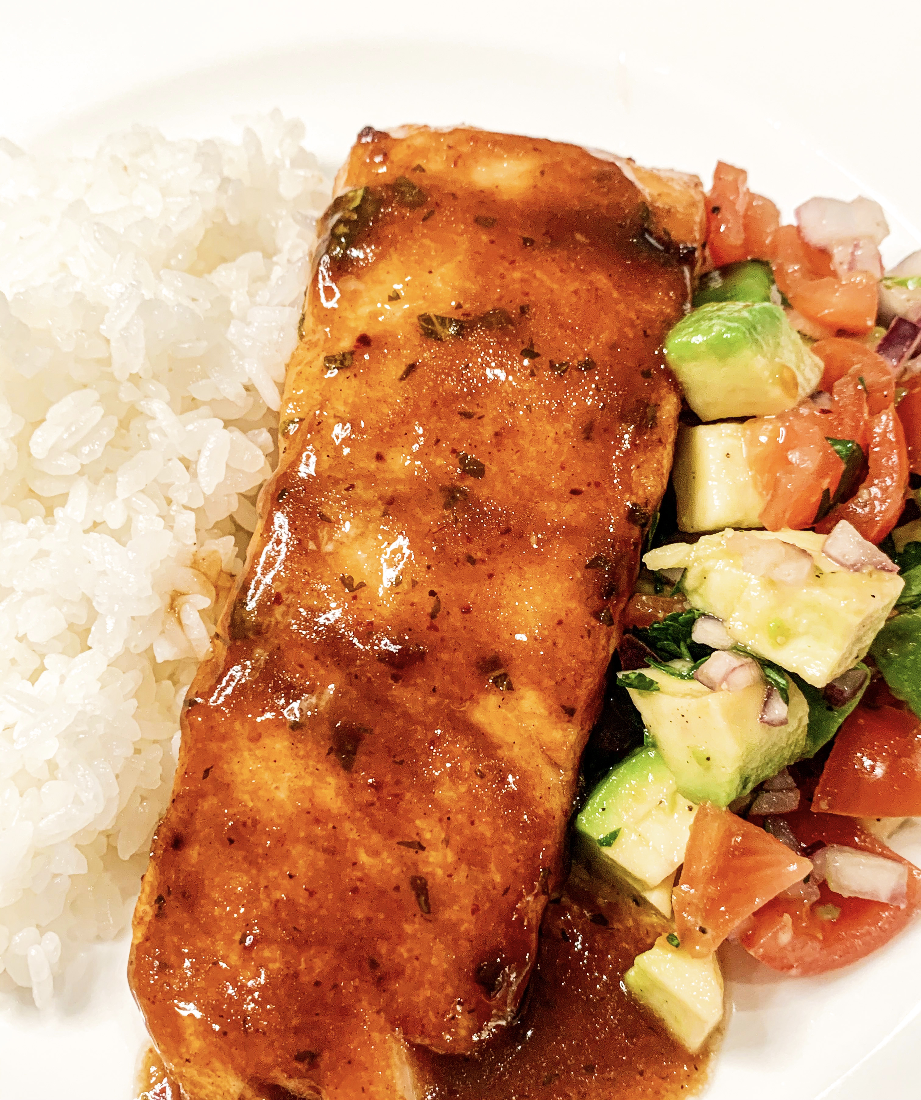 Grilled Salmon in Sweet, Smokey Tamarind Sauce with Avocado Salsa (Serves 4)