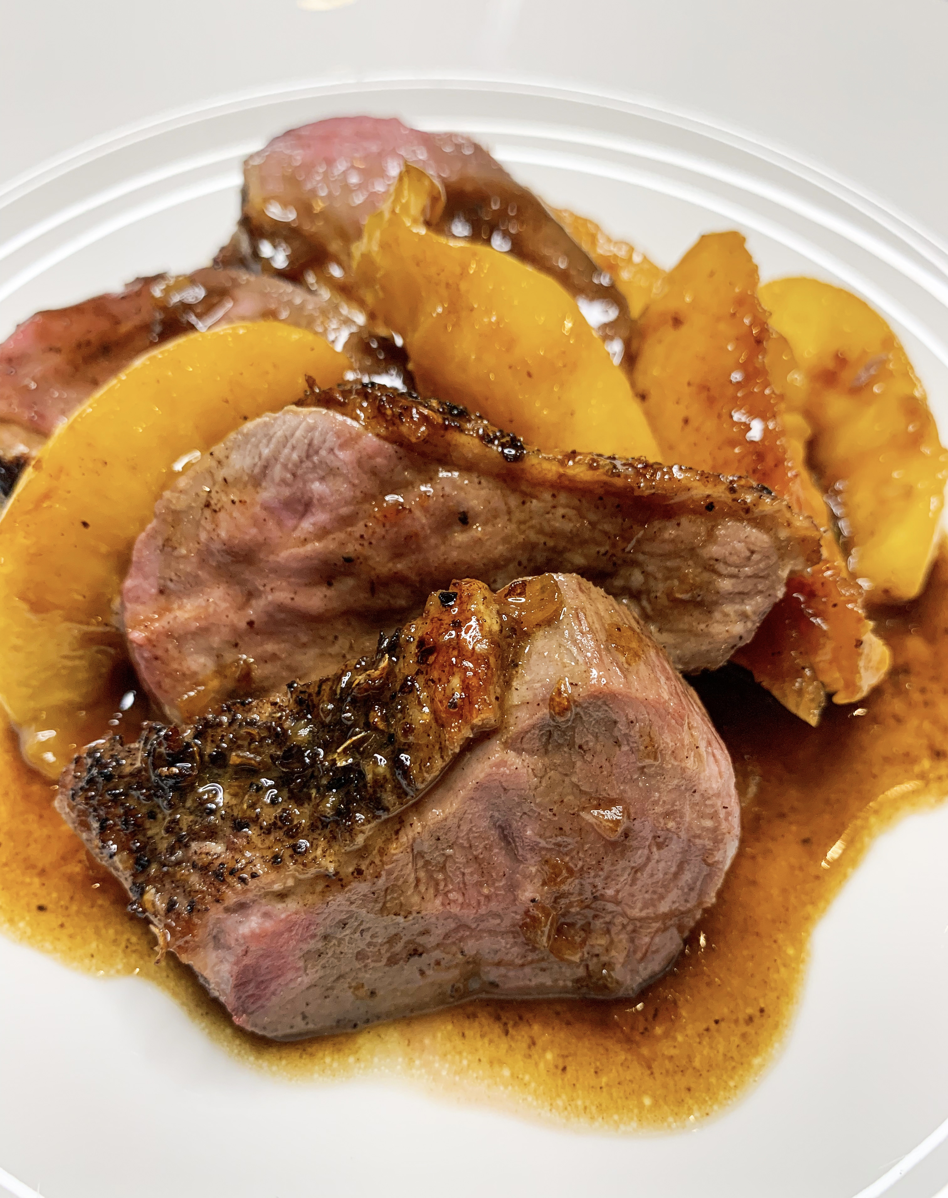 Pan-Roasted Duck Breast with Spiced Peaches (Serves 4) – Served with Sautéed Spinach and Concetta’s Potatoes