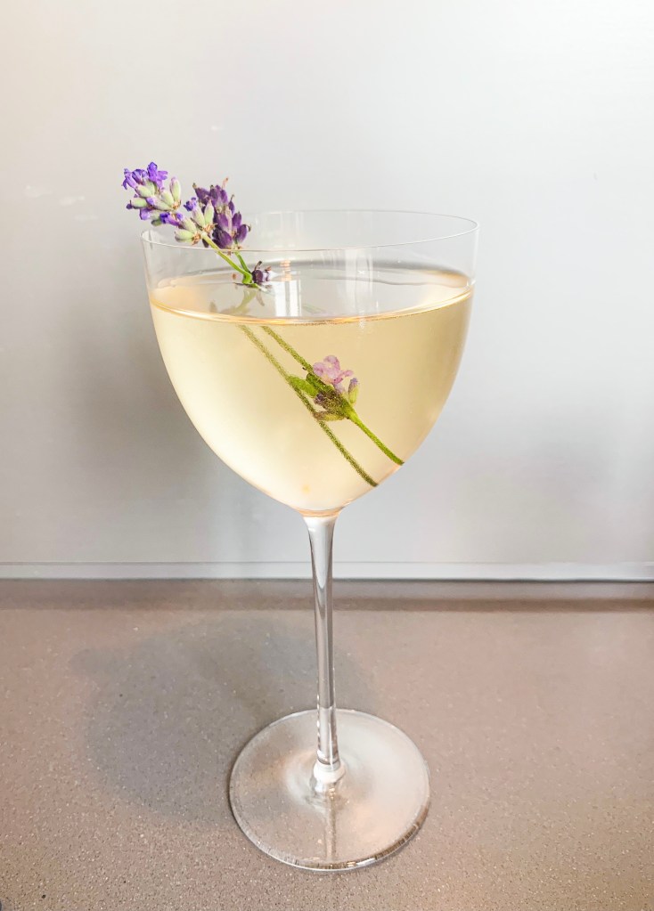 - Strain into a cocktail glass and decorate with a sprig of lavender (if using)