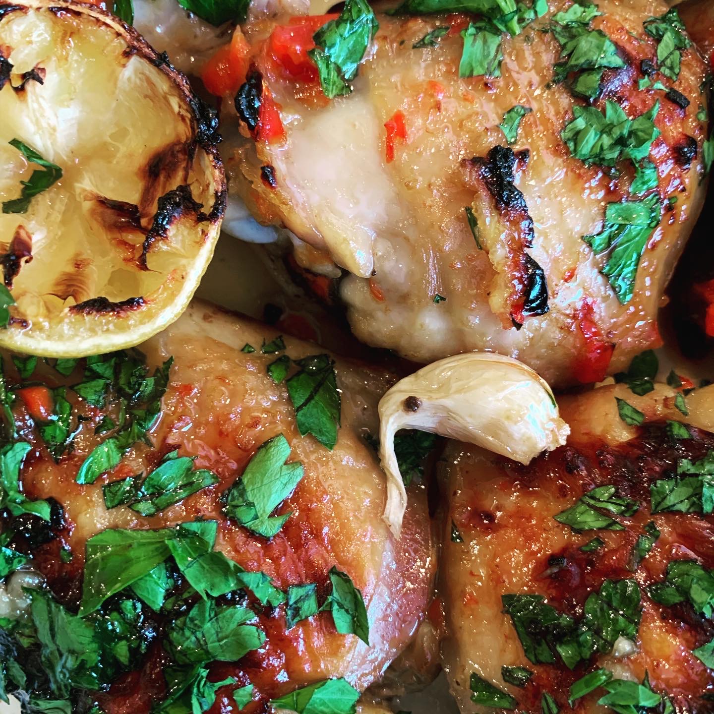 - Skin and crush two of the garlic cloves, mix them with the lemon juice, chillies, the honey and seasoning. Stir well and pour over the chicken, pack the lemon halves around the chicken. Cover and leave to marinate in the fridge overnight (see note above), turning once or twice.