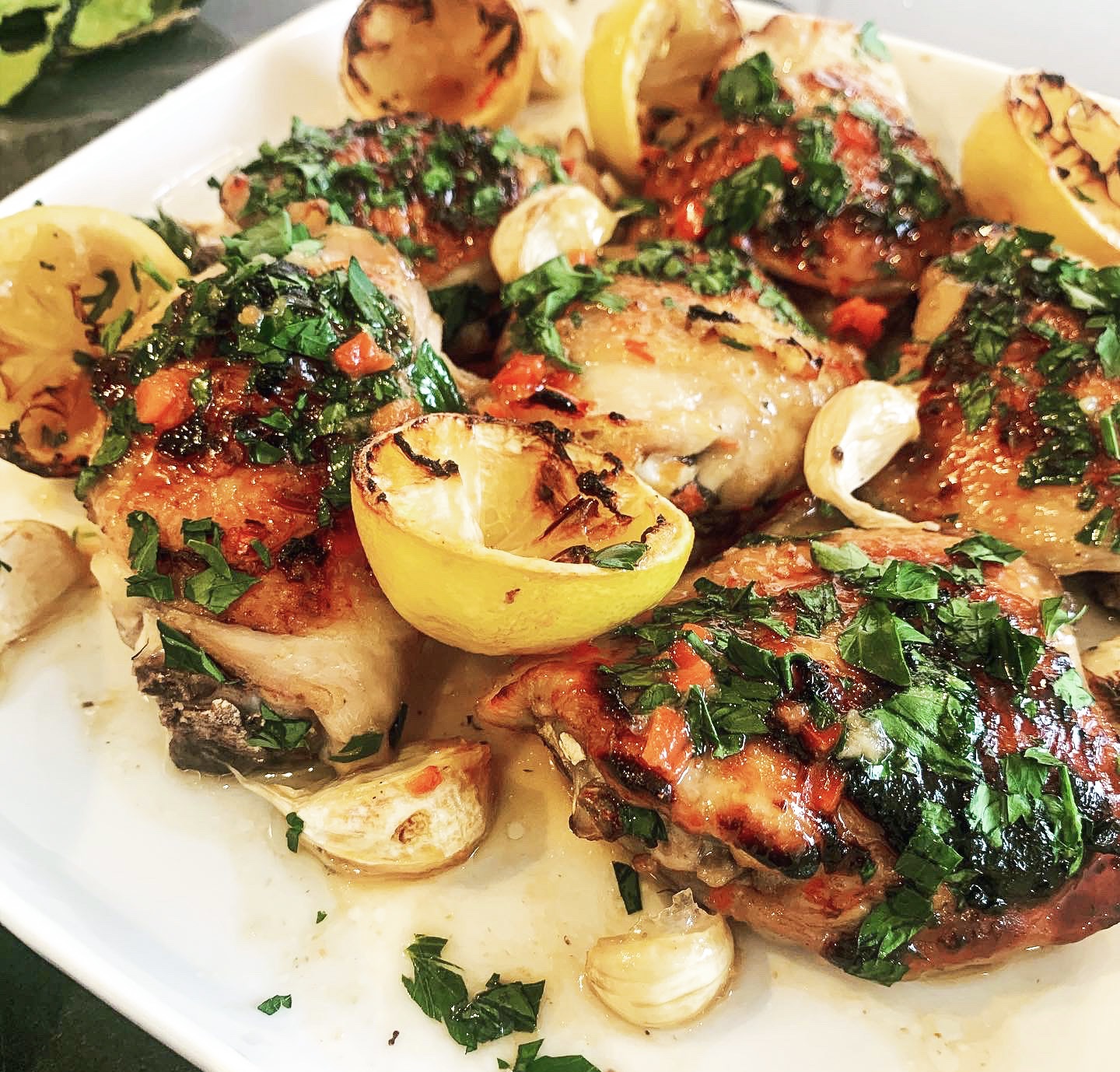 - Scatter over the parsley; serve with the lovely pan juices and the garlic cloves which will now be beautifully soft, ready to be popped out of their skins! (you can use the lemon halves for decoration).