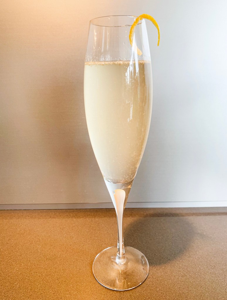 - Simply top off the glass with champagne, garnish with a twist of lemon and serve!