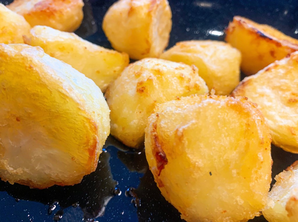 - Place the fat in the roasting tin and place in the oven, 190’c fan, on the highest shelf so that the oil preheats whilst you prepare the potatoes.