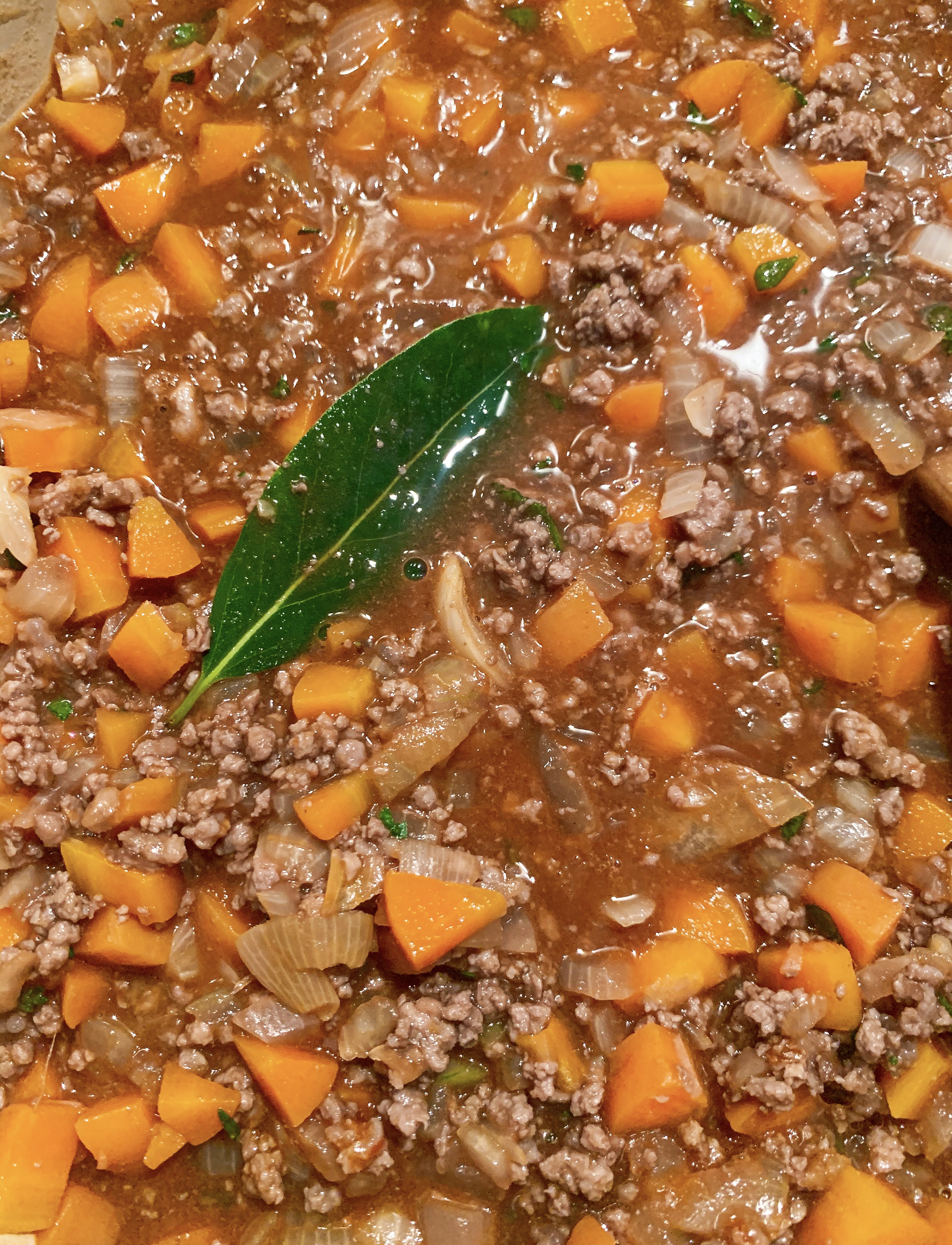 - Return the mince to the casserole, add the flour stirring well and cook for 2 minutes. Stir in the tomato purée and cook for a minute, then add the stock, red wine, redcurrant jelly, bay leaf and fresh herbs.