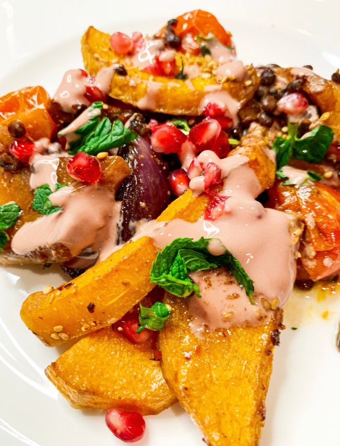 Staple Side Dish: Roasted Squash, Crispy Lentils, Pomegranate & Dukkah (Serves 4)