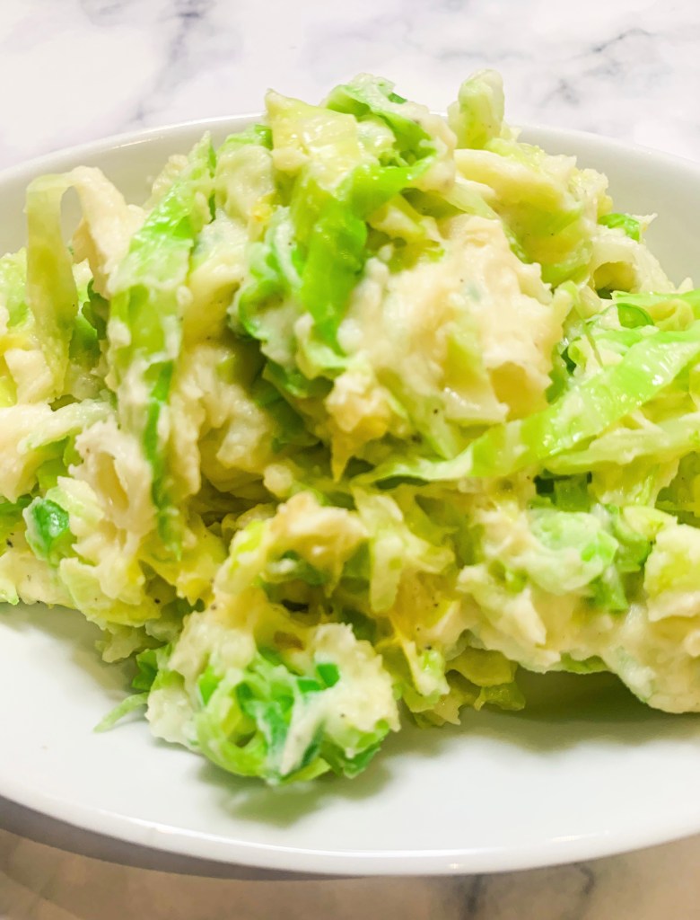 - Add a grating of fresh nutmeg, the cream and remaining butter to the potatoes and use an electric hand whisk until light and fluffy, seasoning with salt and pepper. Finally, stir in the cabbage and spring onions. Serve with or without extra melted butter.