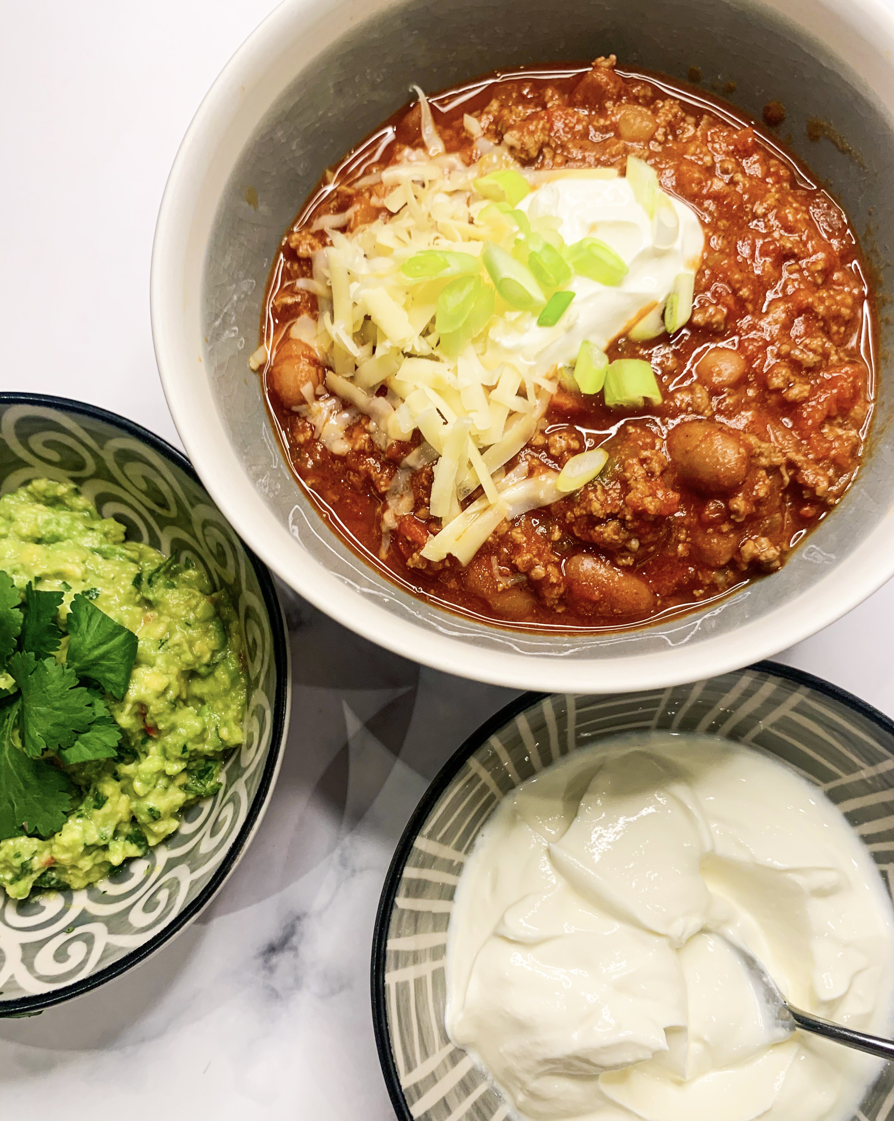 - Serve bowlfuls of chilli topped with sour cream, grated cheddar and spring onions plus, on the side, cornbread (recipe below) and/or guacamole (recipe here).