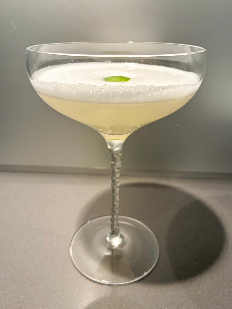 - Shake again without the ice (dry shake) and strain into a chilled coupe glass and garnish with a piece of lime.