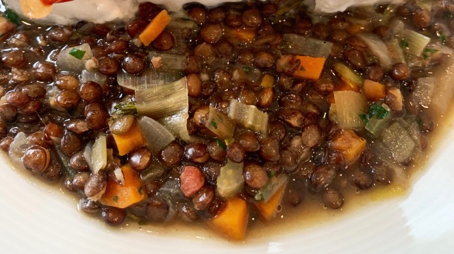 - If you have time and remember, soak the lentils in cold water for an hour before you cook them. The recipe calls for this, but these days most puy lentils (I use ‘Merchant Gourmet’) don’t require soaking, but there is a theory that they are more digestible if soaked?!…