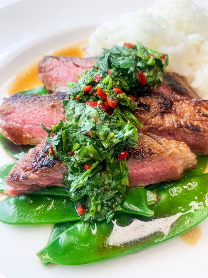 - Remove the steaks to a plate to rest for 5 minutes. Slice each steak into 1 cm slices, top with a little relish and serve with the mangetout, steamed rice and more coriander relish on the side.