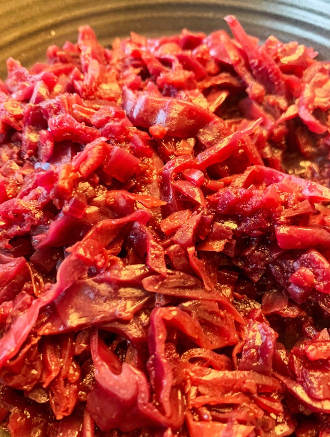 - In a fairly large casserole arrange a layer of shredded cabbage, season with salt and pepper, then add a layer of chopped onions and apples with a sprinkling of garlic, spices and sugar. Continue to alternate layers until everything is used up (I like to make up three layers).