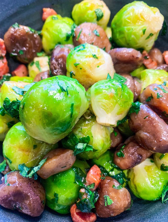 Brussel Sprouts with Chestnuts, Pancetta & Marsala (Serves 8-10)