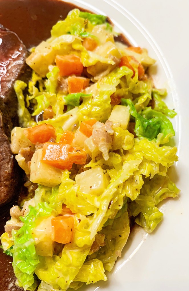 This is a wonderfully luxurious way of serving cabbage, the flavours of the celeriac and carrots are fantastic alongside the cream. It goes well with beef and game dishes. You could prepare it up to stage 2 and leave it to one side, then reheat when needed, adding the cabbage and cream just before serving – this makes it an easy dish to serve to guests.