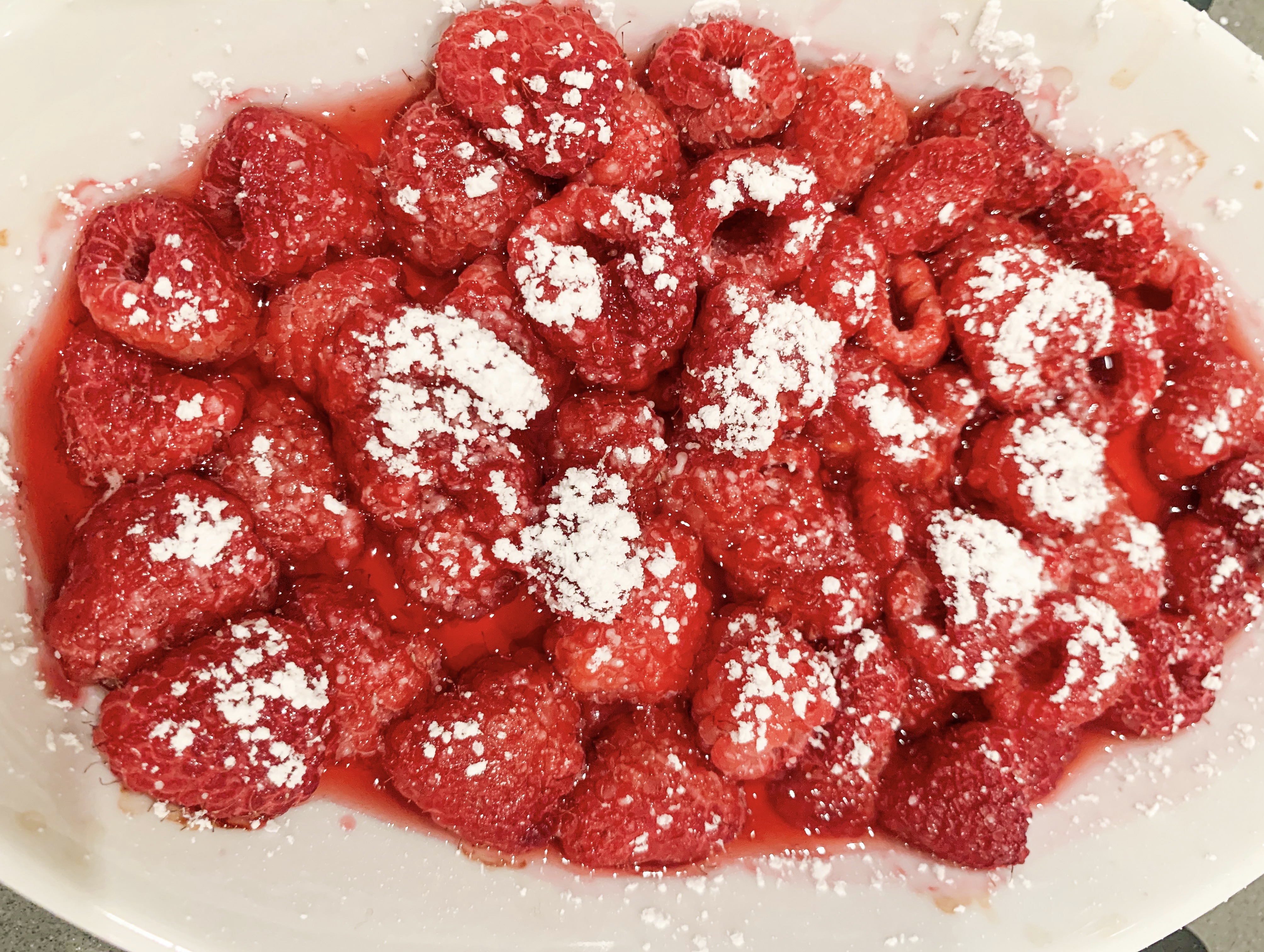 - Put the raspberries in an ovenproof dish. Cook in a preheated oven, 200’c fan, for about 15 minutes until the juices have come out of the raspberries but they are still keeping their shape.