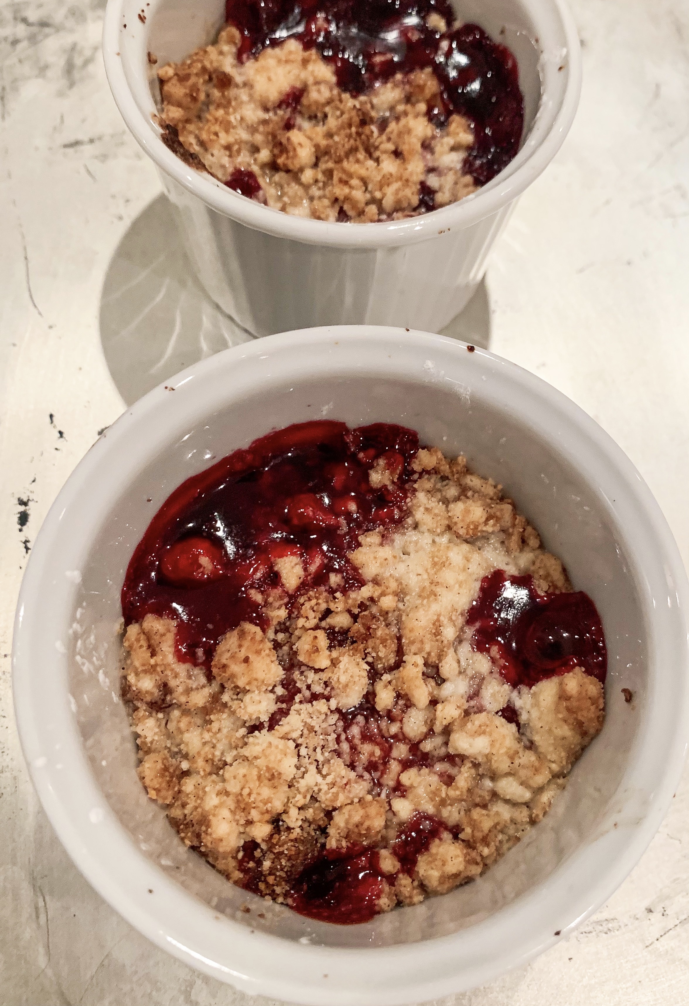 Ok, we all need a homemade sweet treat now and again, and this one is perfect for student life as not only is it easy to prepare but it can be cooked straight from the freezer. It is a great recipe idea that I have taken from Nigella Lawson’s cookbook, ‘Nigella Express’. The idea is to freeze the crumble topping and some summer berries, then at any given time you can quickly make up a ‘Berry Crumble in a Cup’! You just need to cook them from frozen for 15 minutes! I have changed the recipe slightly; I make my crumble topping with the addition of ground almonds as I think it improves the flavour. You can either make the crumbles in a cup/small mug or in a ramekin, the measurements of the ingredients will differ slightly depending on which you choose – see below