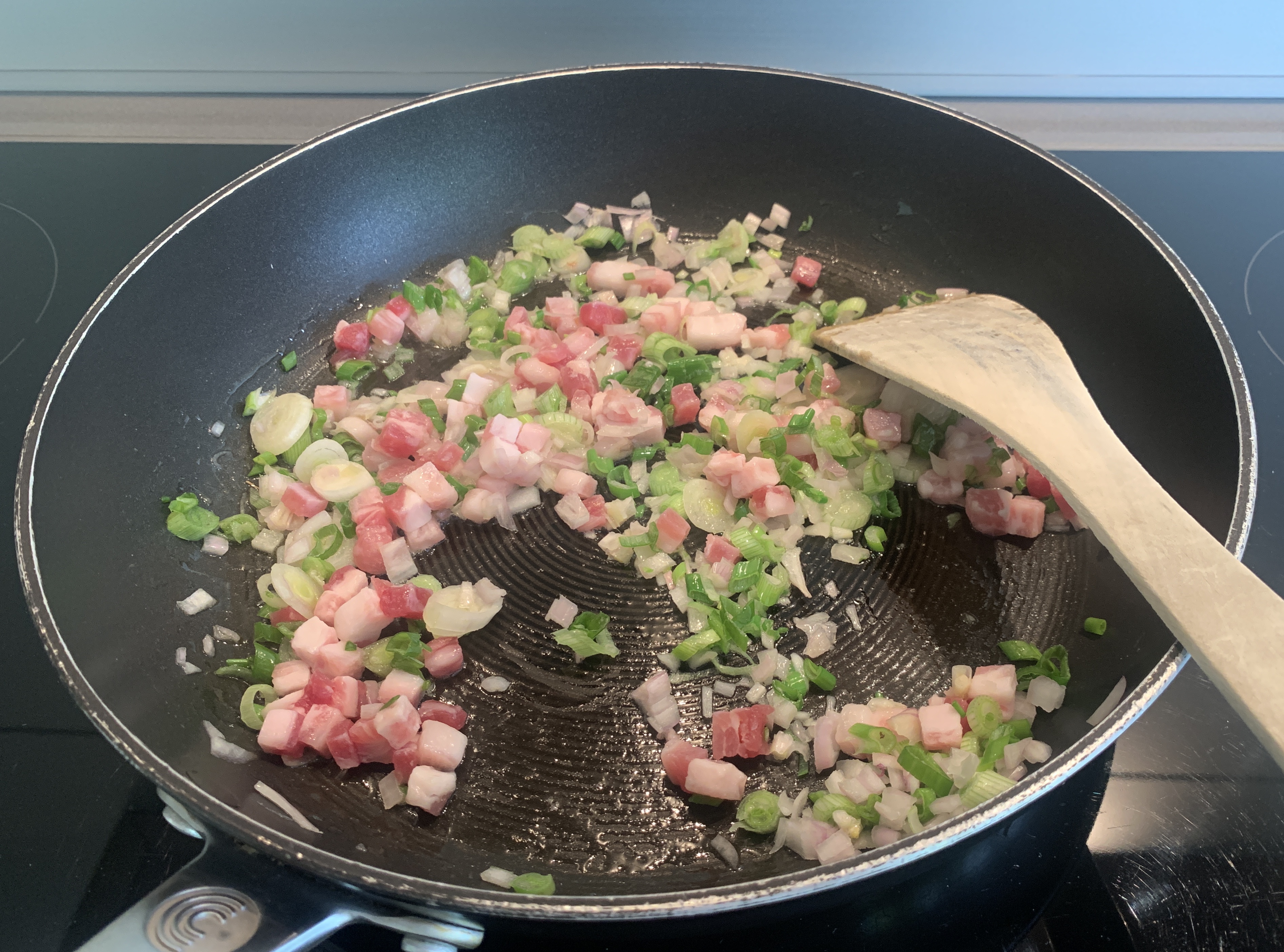 - Heat the oil and butter in a large frying pan, add the spring onions, shallots and pancetta, fry for 2-3 minutes.