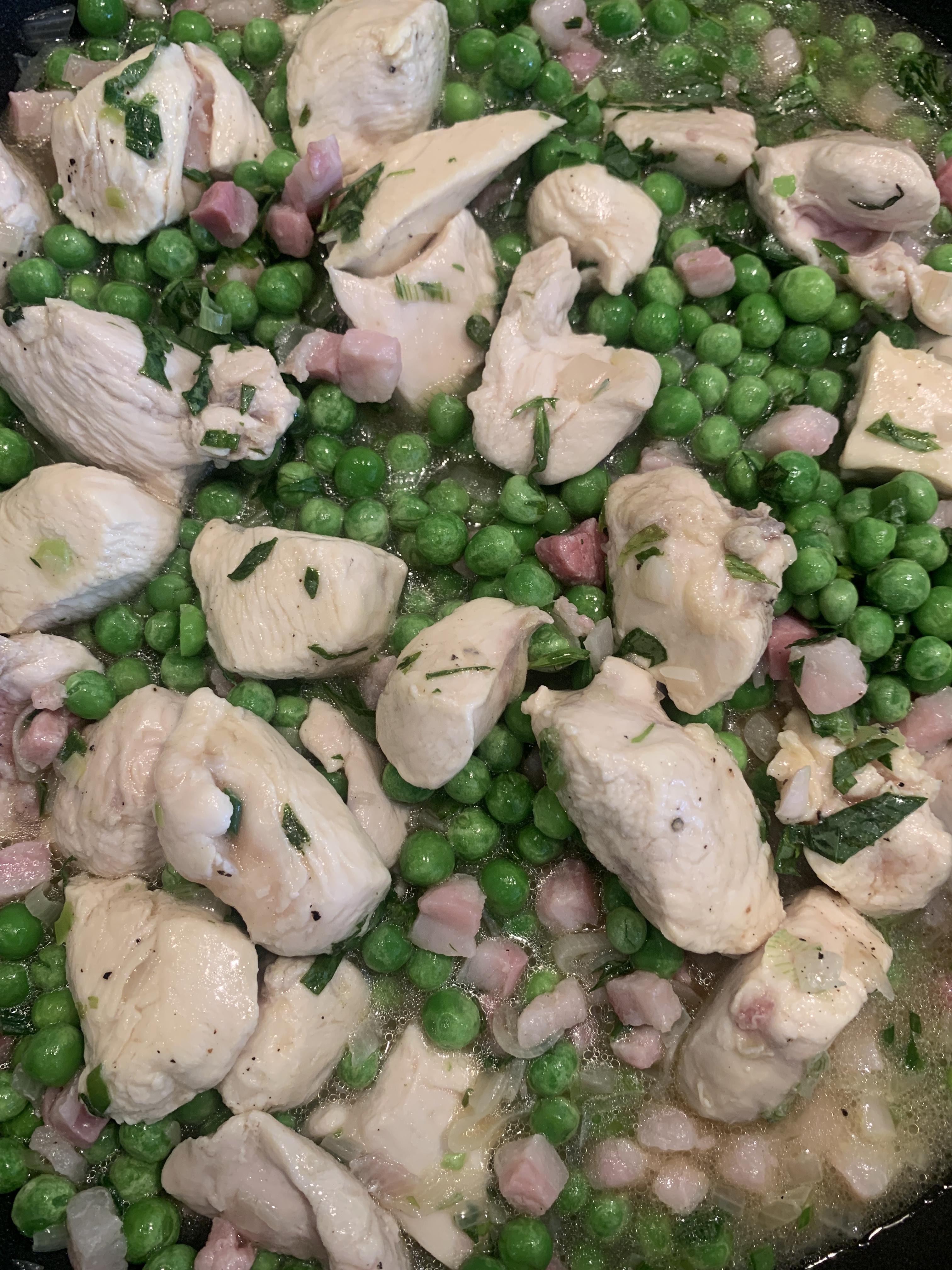 - Pour in the chicken stock and peas, bring to a simmer, and add the chopped leaves of 6-7 of the sprigs of tarragon. Cook for 5 minutes until the peas are tender.