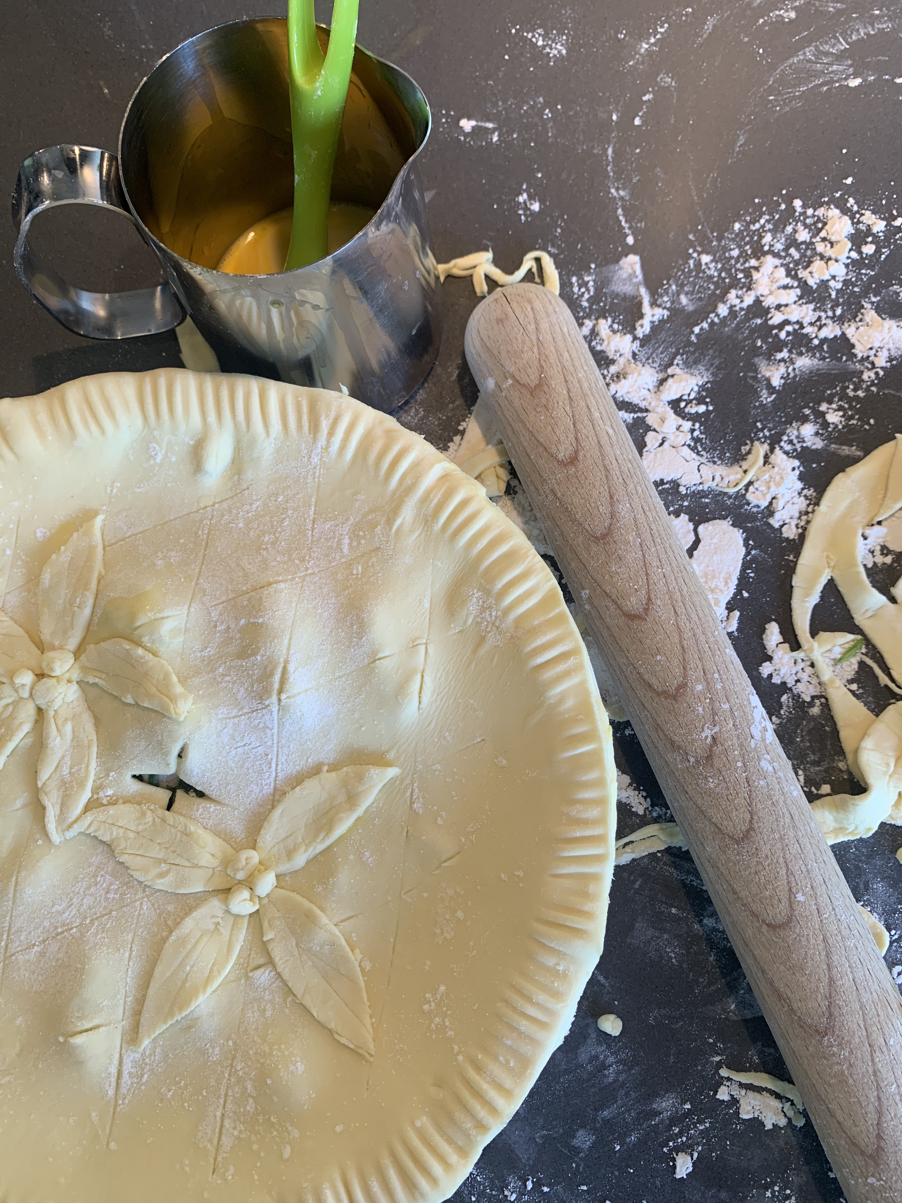 - For the pastry top, gently lay out the pastry. Cut it into a circular shape to top the pie dish. I find that by cutting strips of the remaining pastry, pressing them around the rim of the pie dish and then topping with the pastry top, helps the pastry rise – see photo. I also cut out a few leaves for decoration, but obviously, this doesn’t affect the flavour so if you’re in a hurry I’d leave this out! Lightly score the pastry with a criss-cross pattern to help it rise and make sure you cut out a deep cross in the centre to allow the steam to escape during cooking. Brush over with the egg and milk glaze.