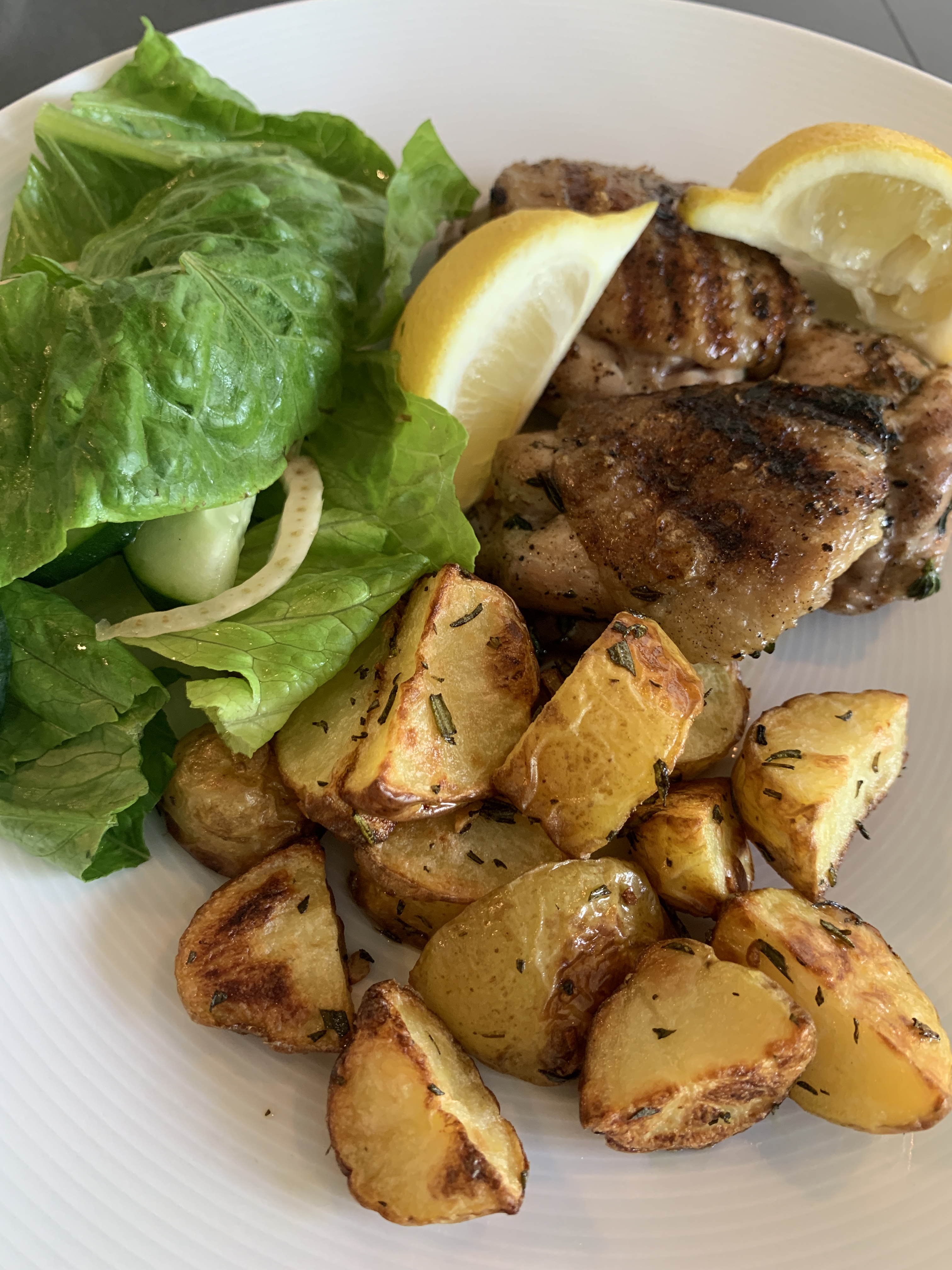 It is important to marinate the chicken before cooking it as it really does improve the flavour – overnight would be the best option. I prefer to cook the chicken on a griddle pan as it gives a lovely crispy, chargrill effect however if you don’t have one, a regular frying pan works. I would serve this dish with baby roast potatoes and a salad with a lemon dressing – you can find these recipes on my Recipes Pages. On the day you’re eating it, start by cooking the baby roast potatoes and preparing the salad/dressing, then 10-15 minutes before the potatoes are ready, cook the meat. This recipe is from Diana Henry’s ‘ Pure, Simple Cooking’.