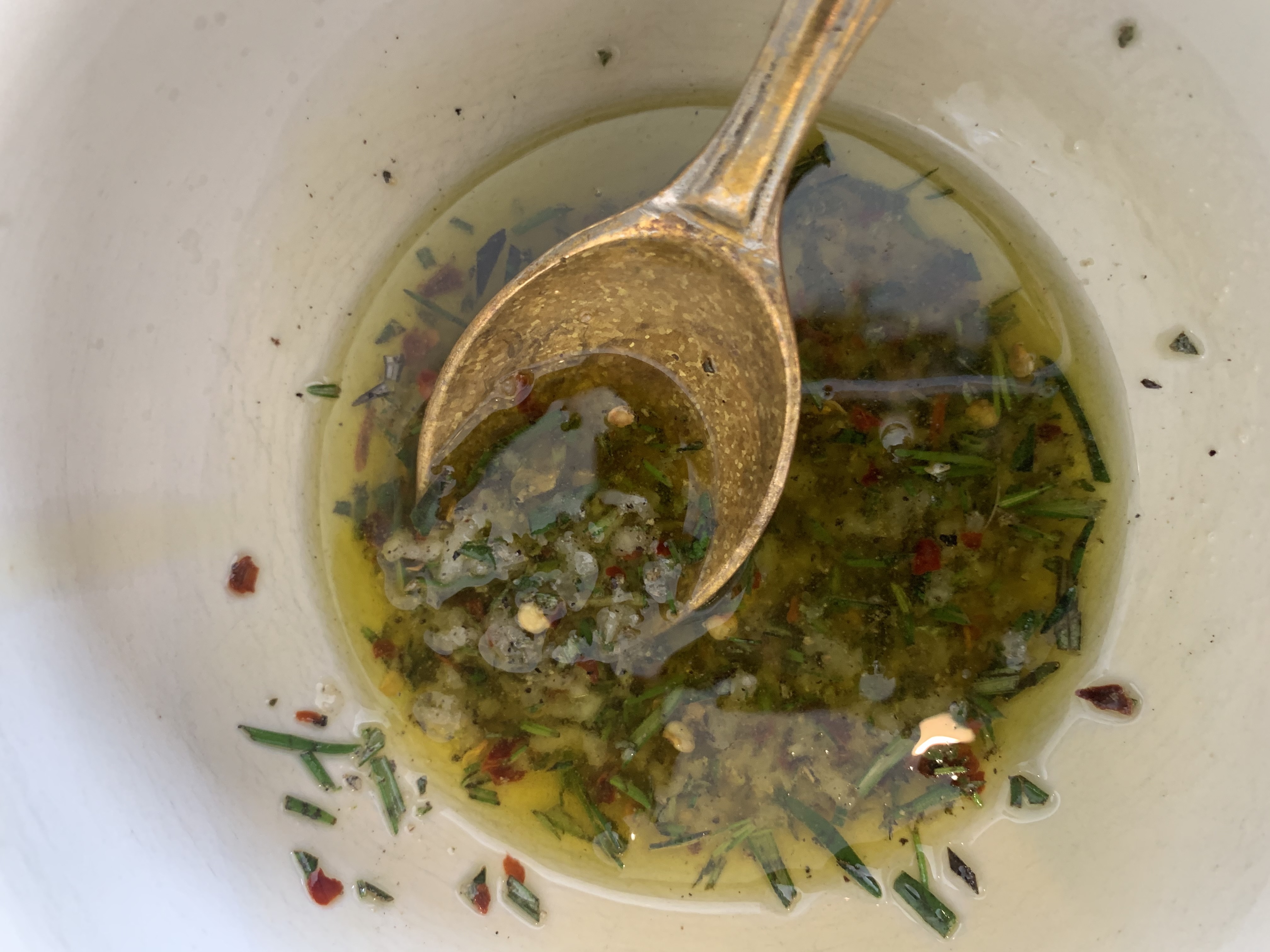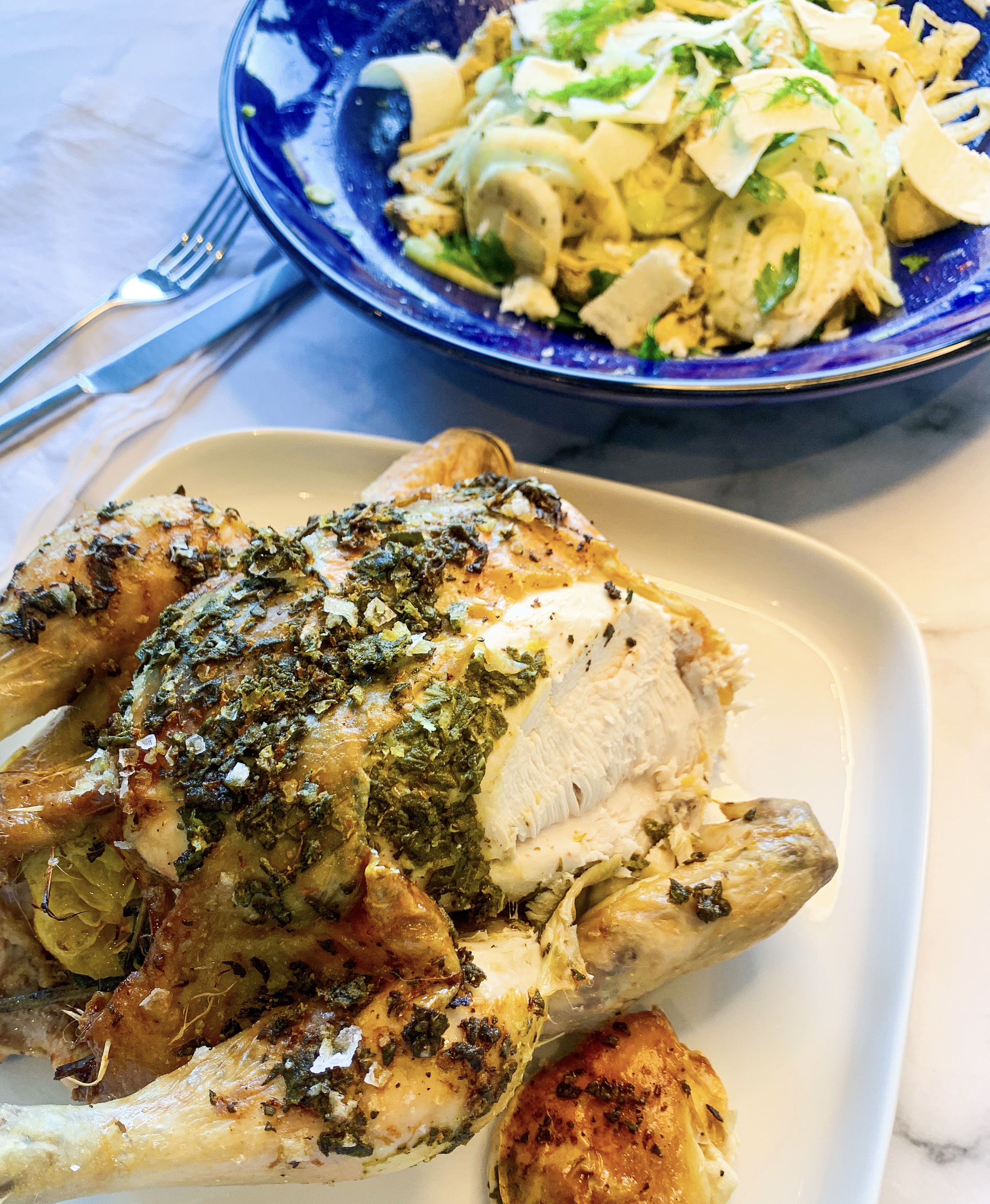 Spatchcock Chicken is a great way to roast a chicken – it enables the chicken to cook quicker and is a lot easier to carve. The rosemary, garlic and chilli oil in this recipe, is a particular favourite of mine, it is a tasty and a very simple way of seasoning the chicken. A great accompaniment to this chicken is the Cantaloupe, Artichoke and Walnut Salad which you can find here. If you get your chicken from your butcher, ask him to spatchcock it for you, alternatively it is very easy to do yourself…