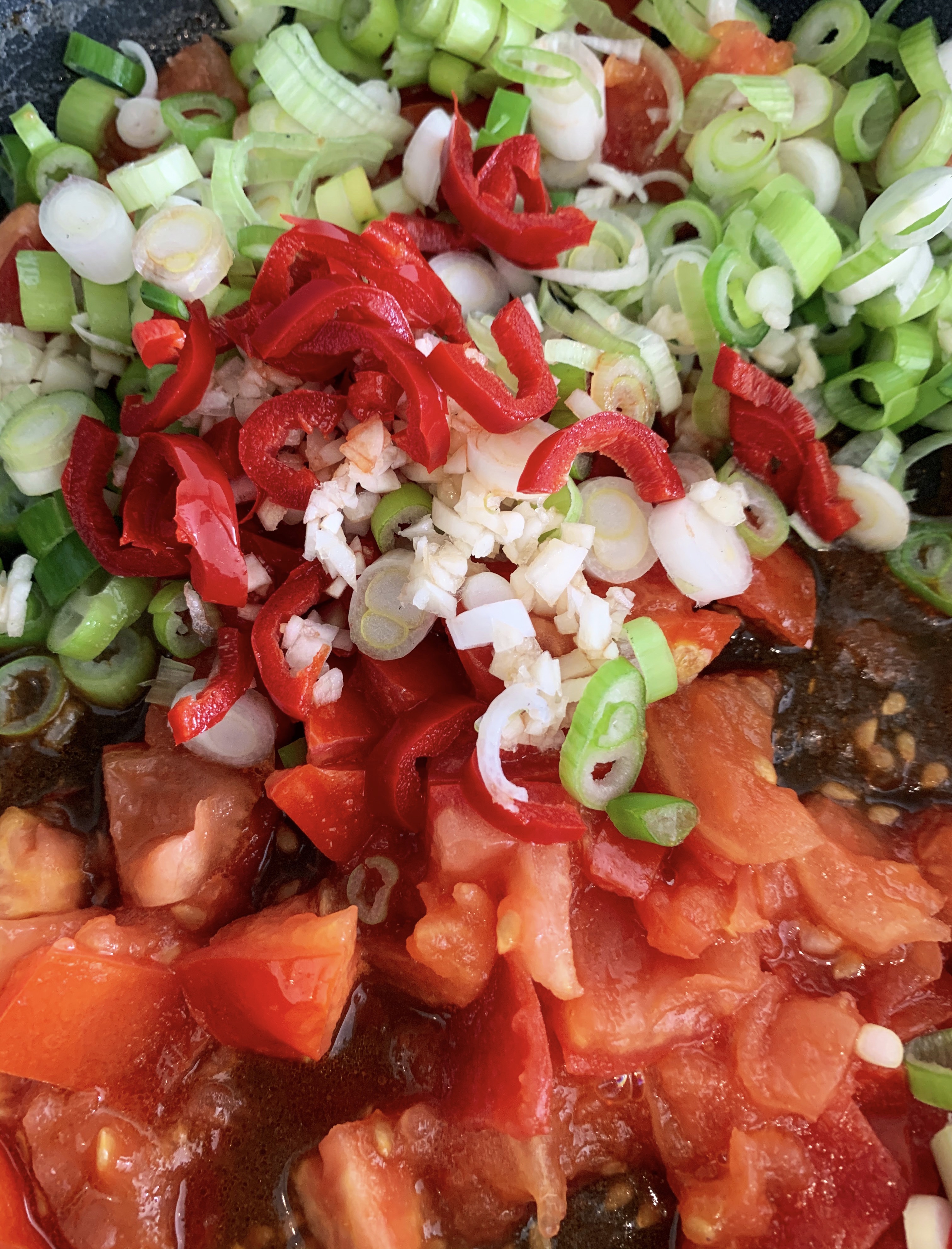 - Meanwhile in a frying pan heat 1 tablespoon of oil and cook the tomatoes for about five minutes, then add the garlic, spring onions, chillies, oregano and cumin. Remove from the pan and keep warm.