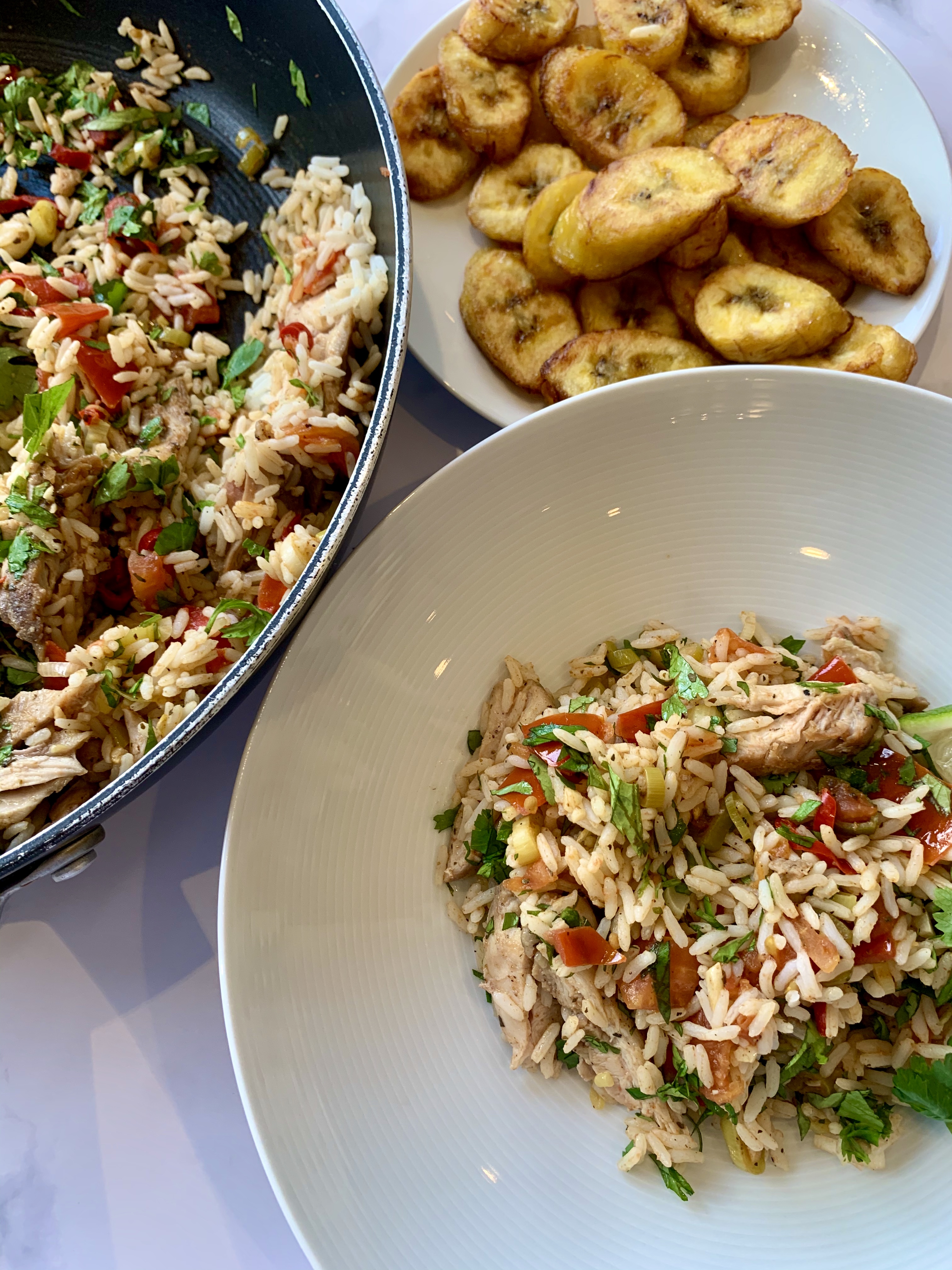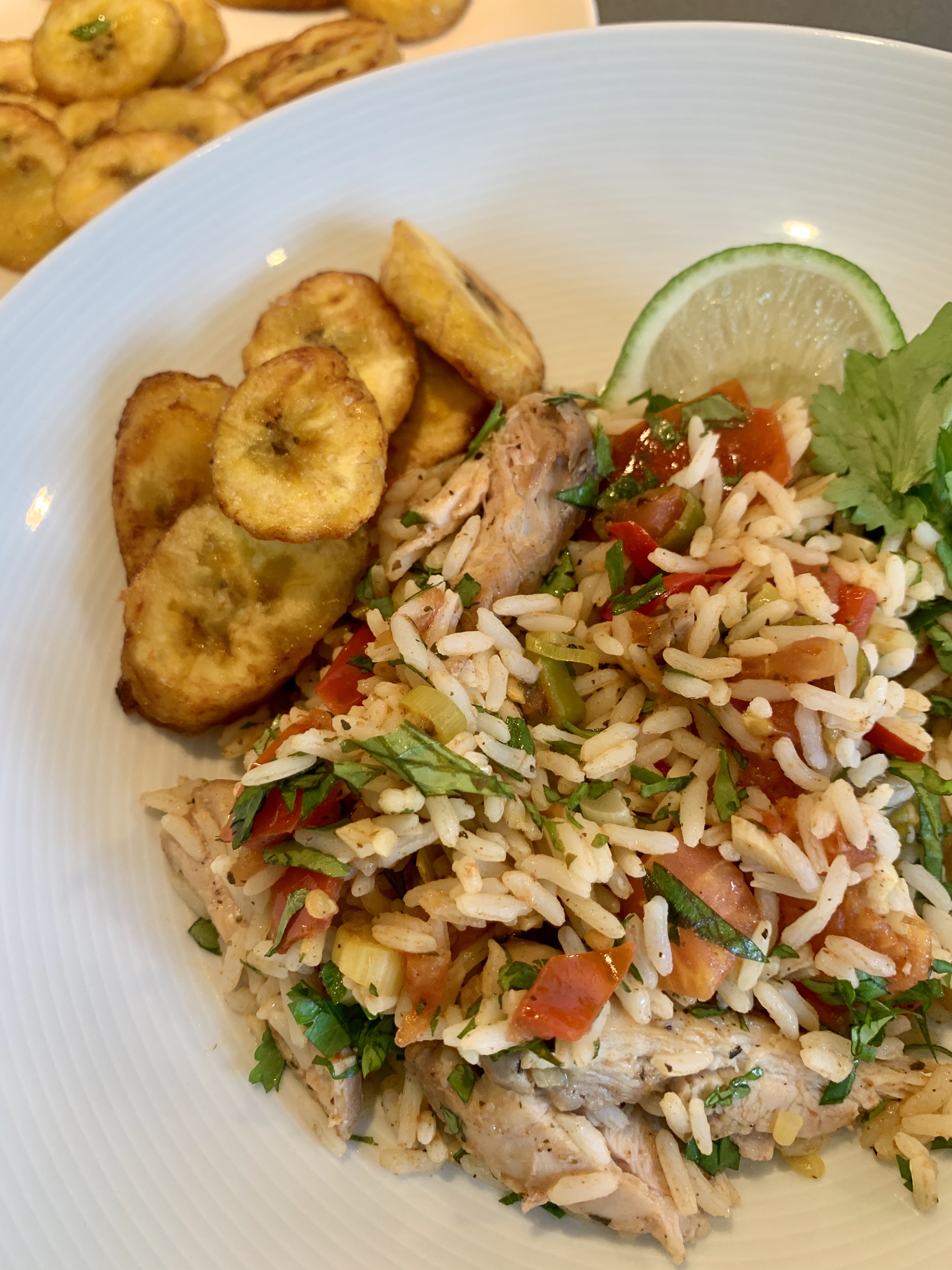 - Serve the chicken rice with the sliced plantain, the remaining limes, quartered and, if desired, some hot pepper sauce on the side.