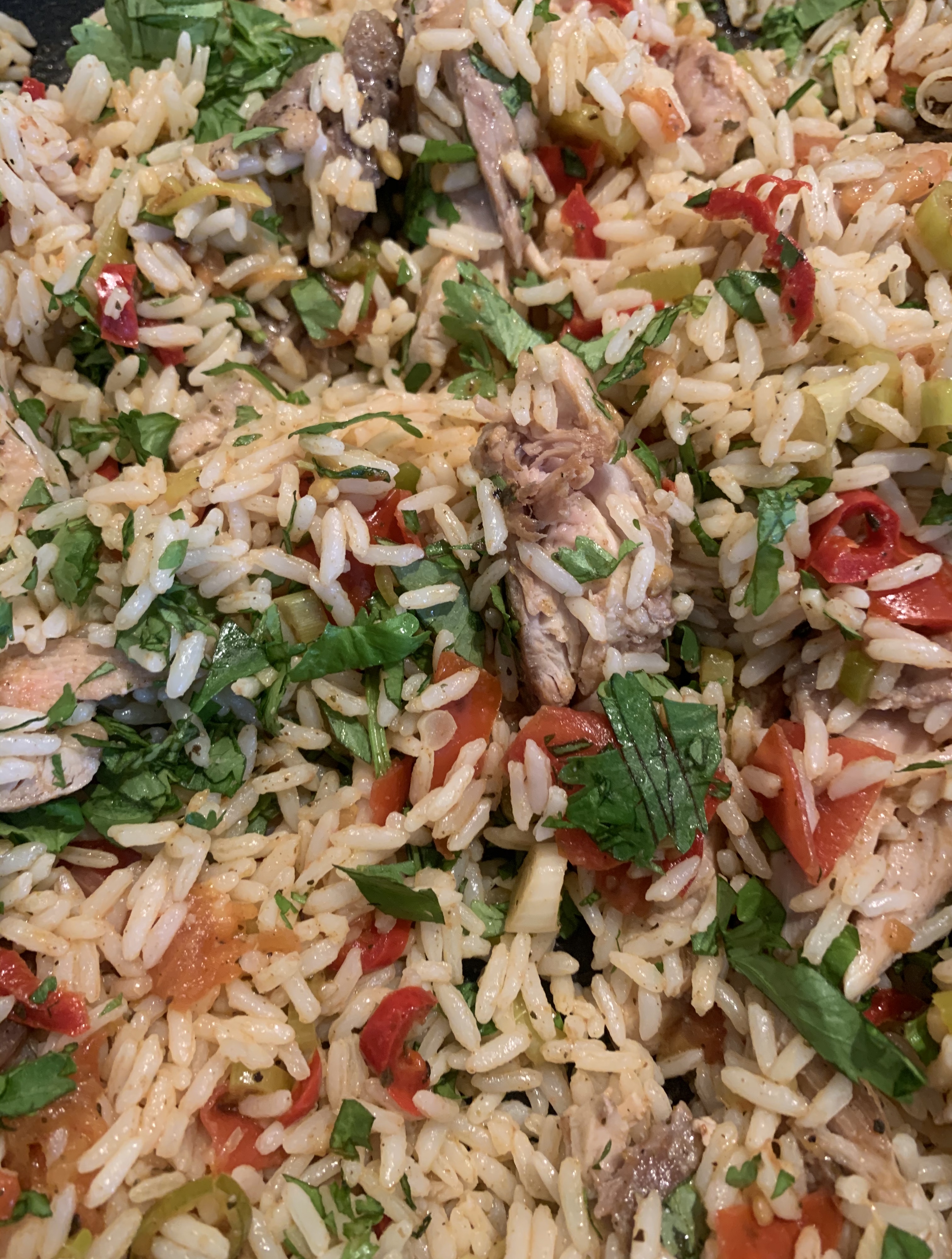 - Finally, add the rice, chicken and tomato mixture to a clean frying pan and gently heat through. Stir through the chopped coriander, and about 2 tablespoons of lime juice, season with salt and pepper to taste.