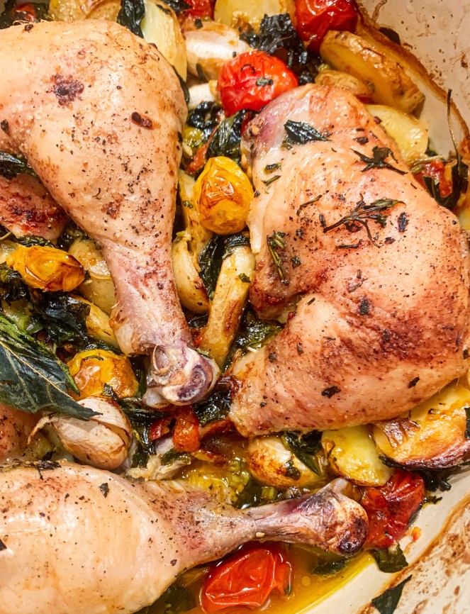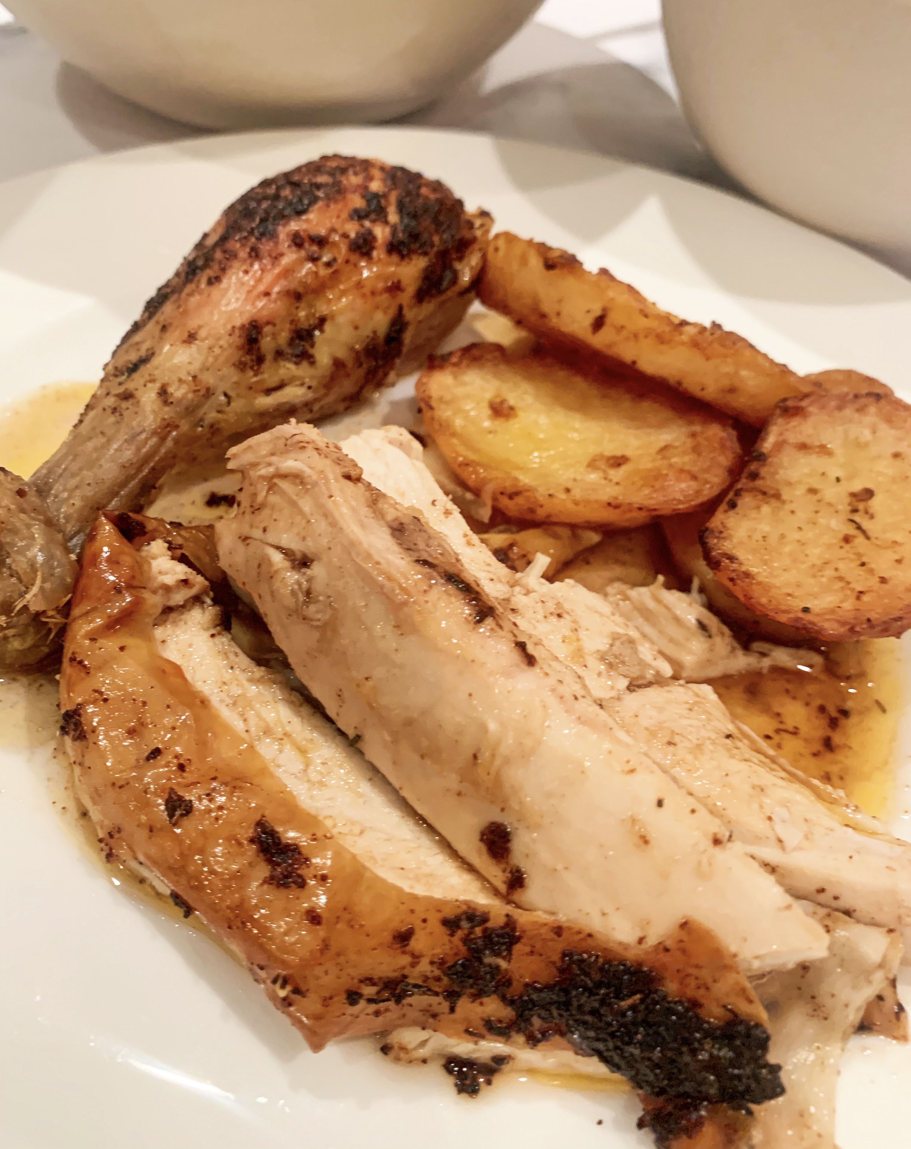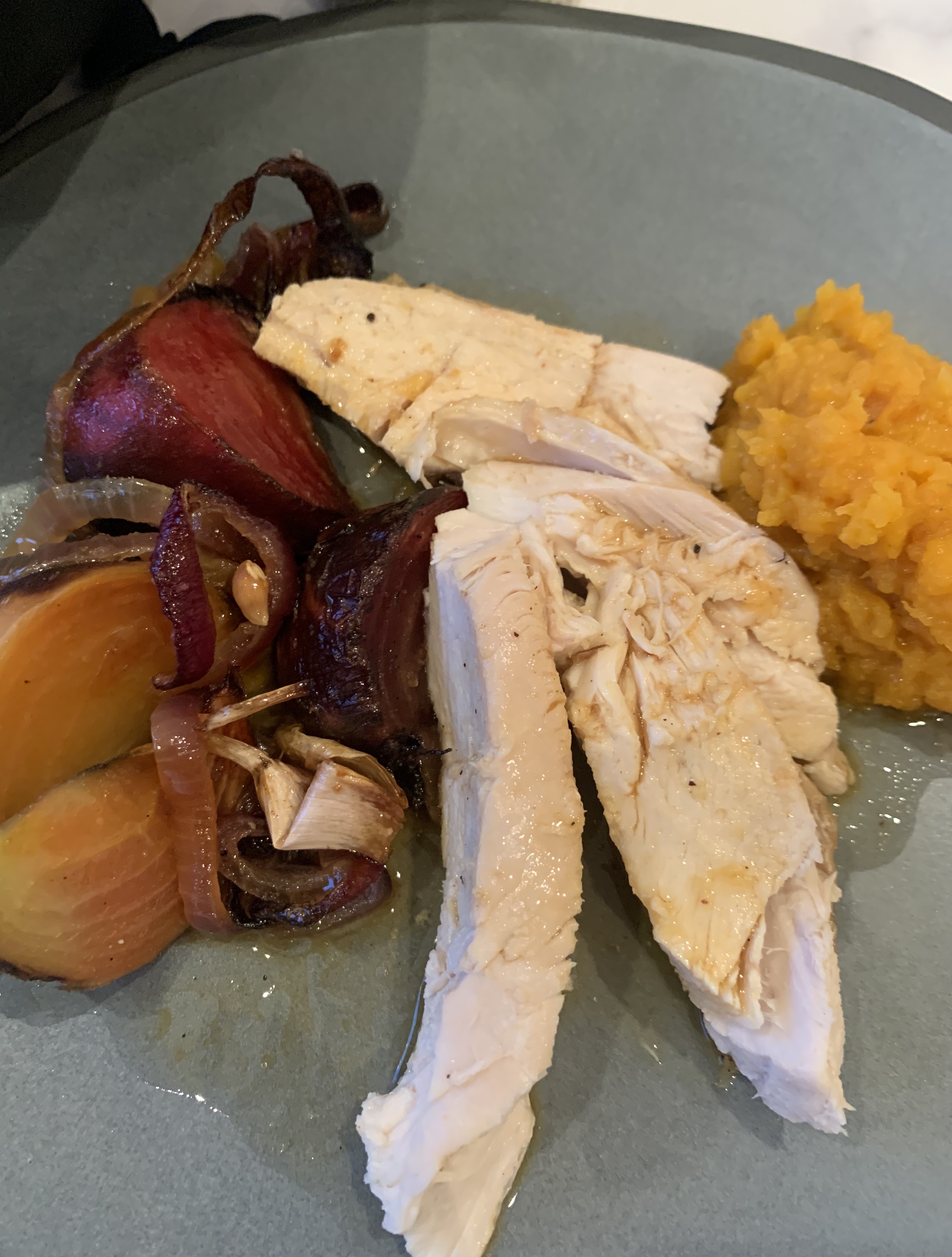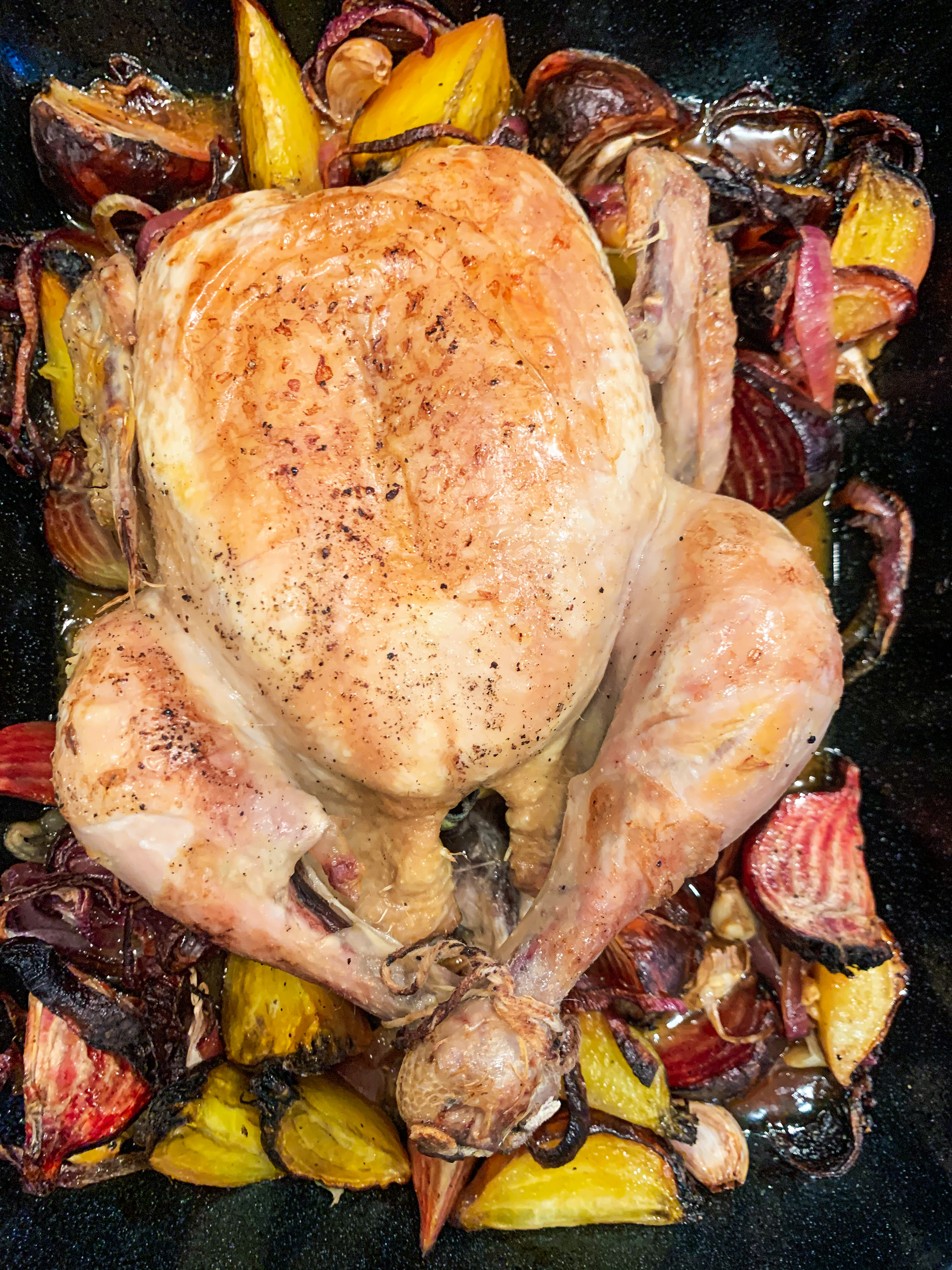- Serve the chicken and it’s wonderful cooking juices with the roast vegetables on the side.