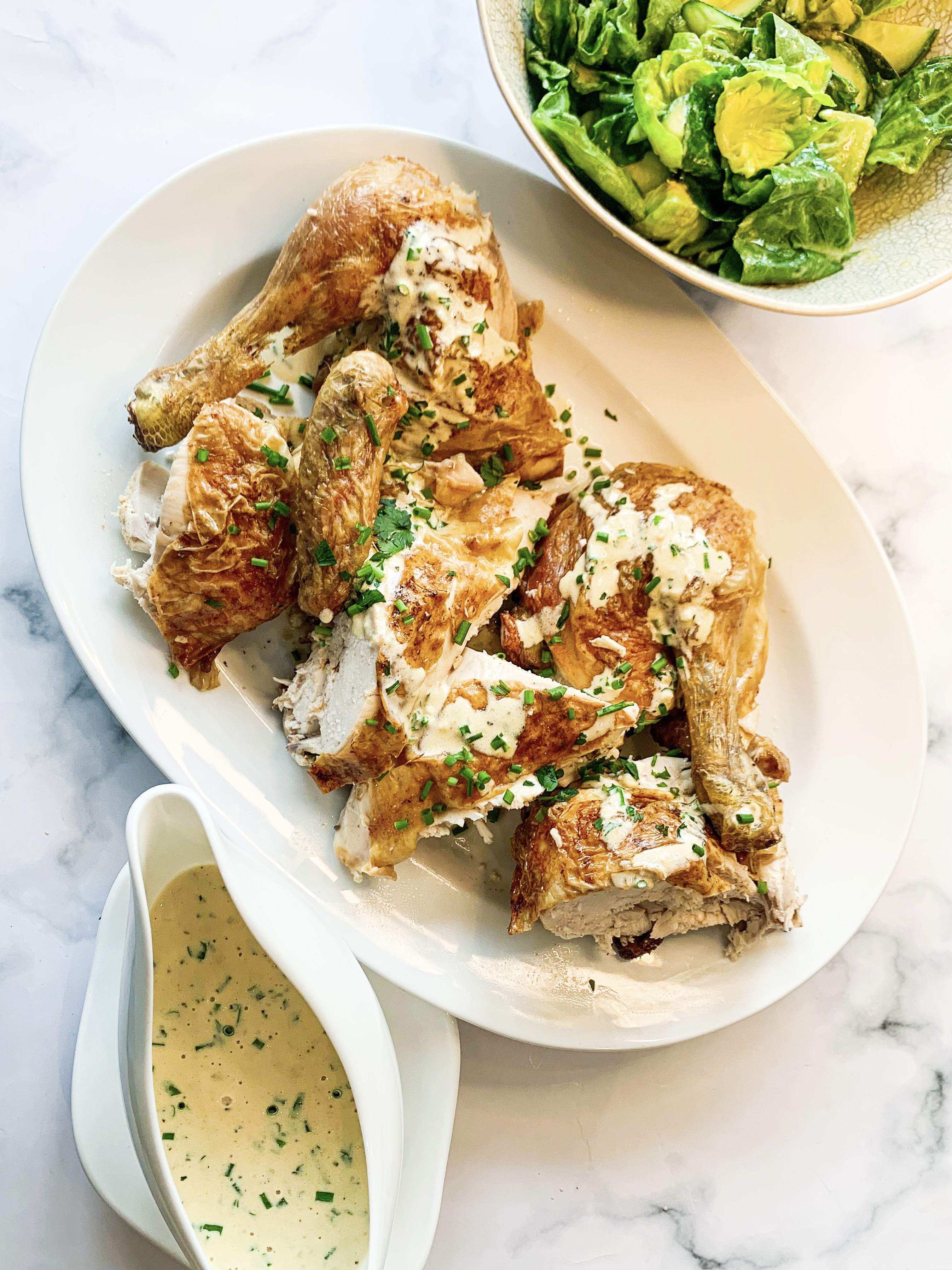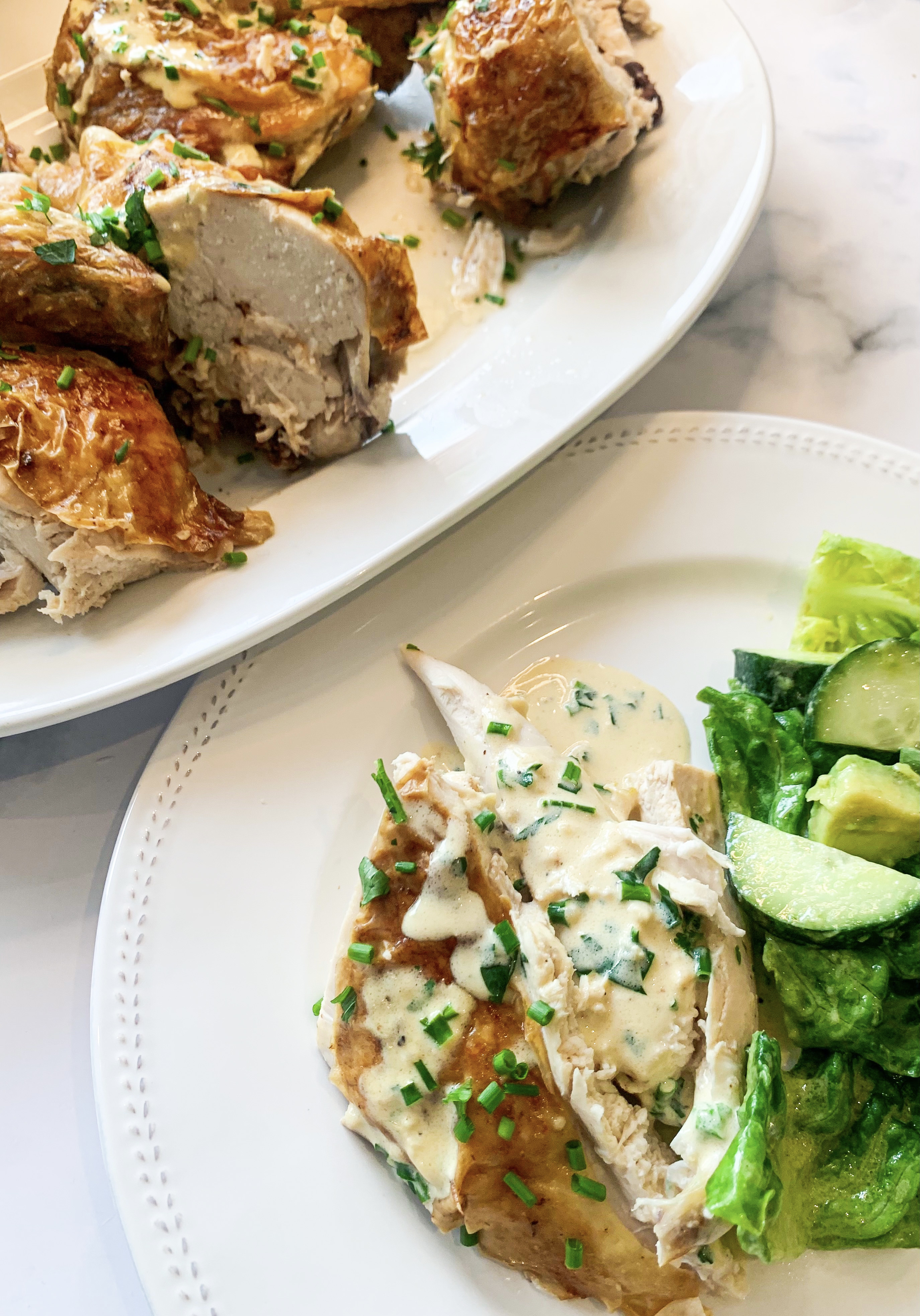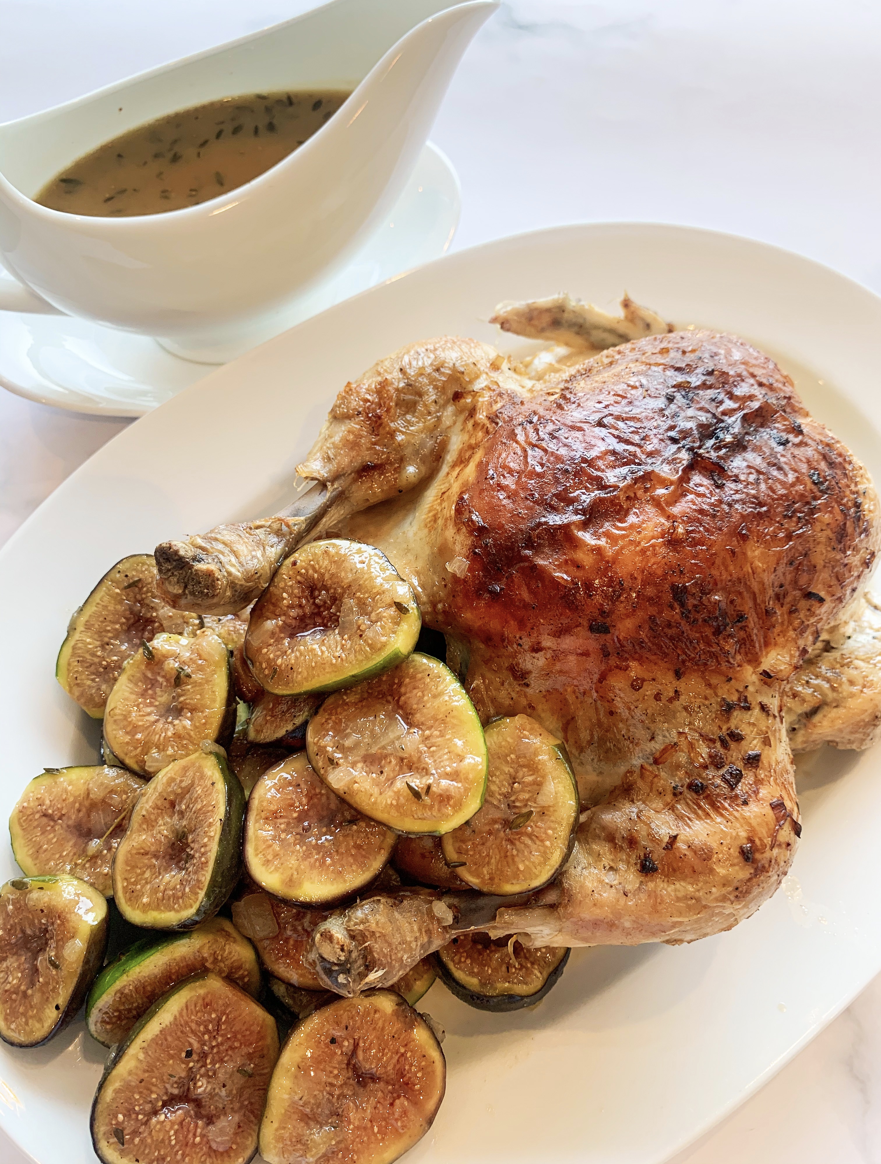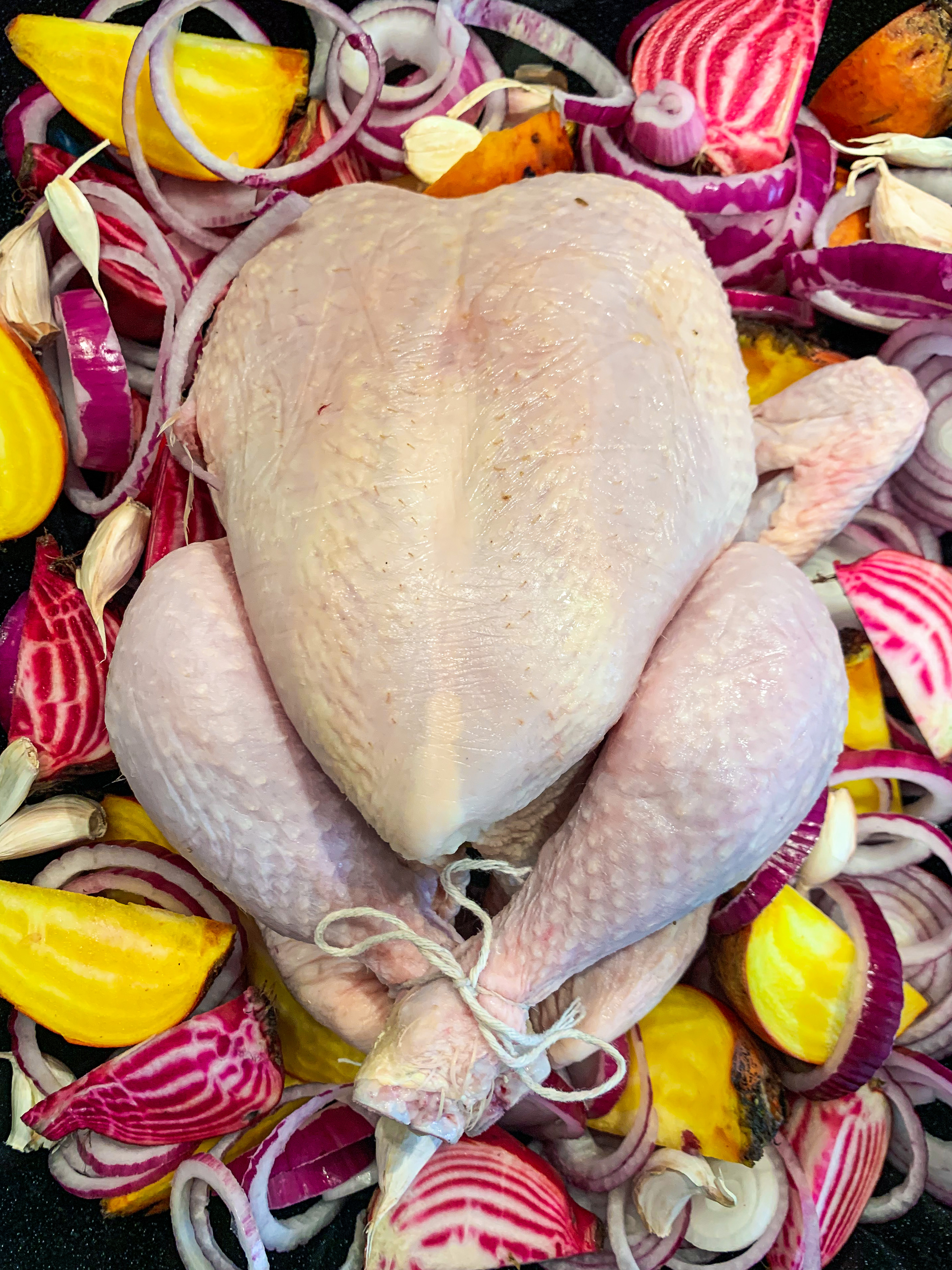 - Serve the chicken and it’s wonderful cooking juices with the roast vegetables on the side.