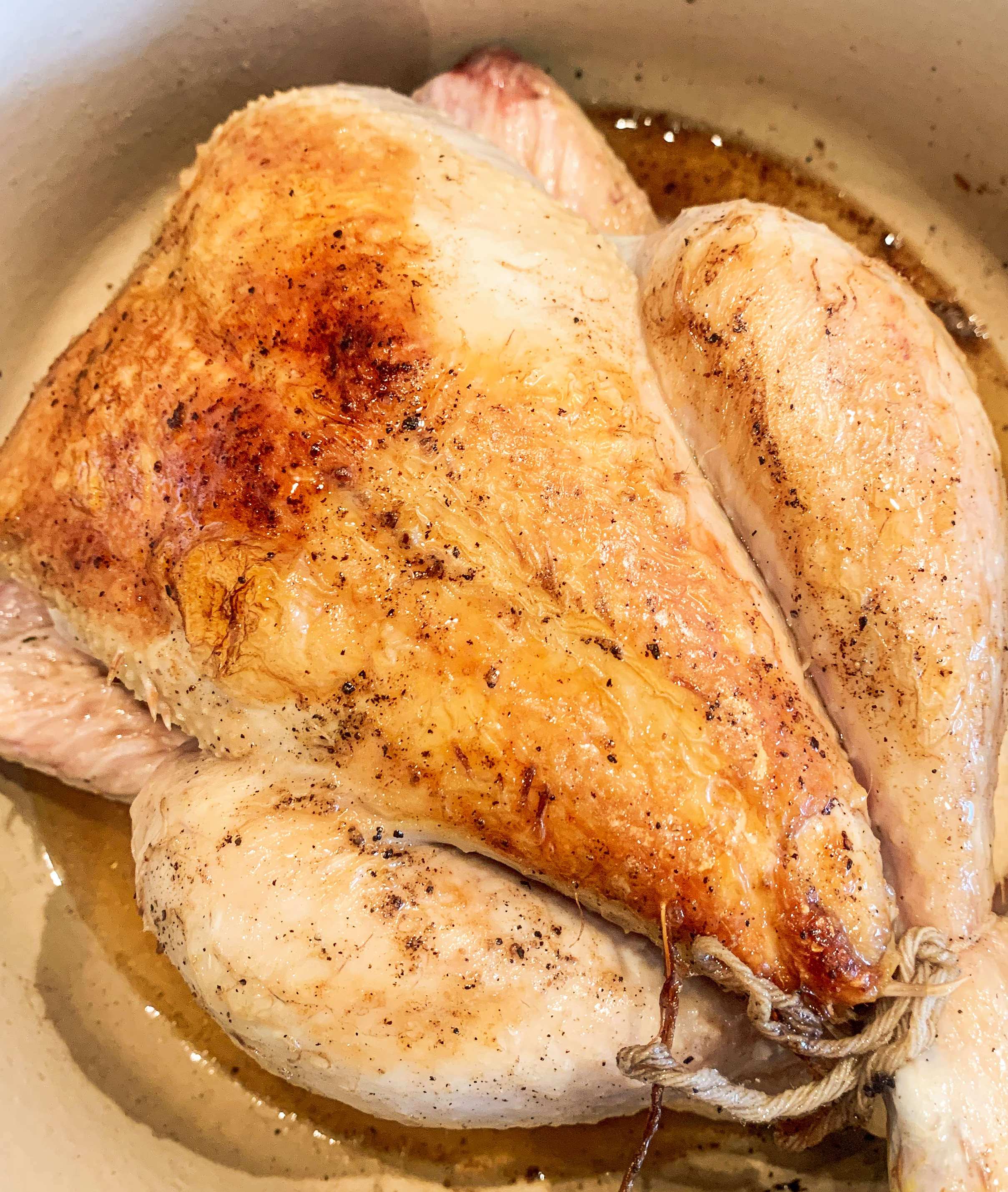 - Remove the lid and carefully turn the chicken over. At this point I also remove the vegetables (see note above) to a separate roasting tin together with 2 tablespoons of the cooking juices.