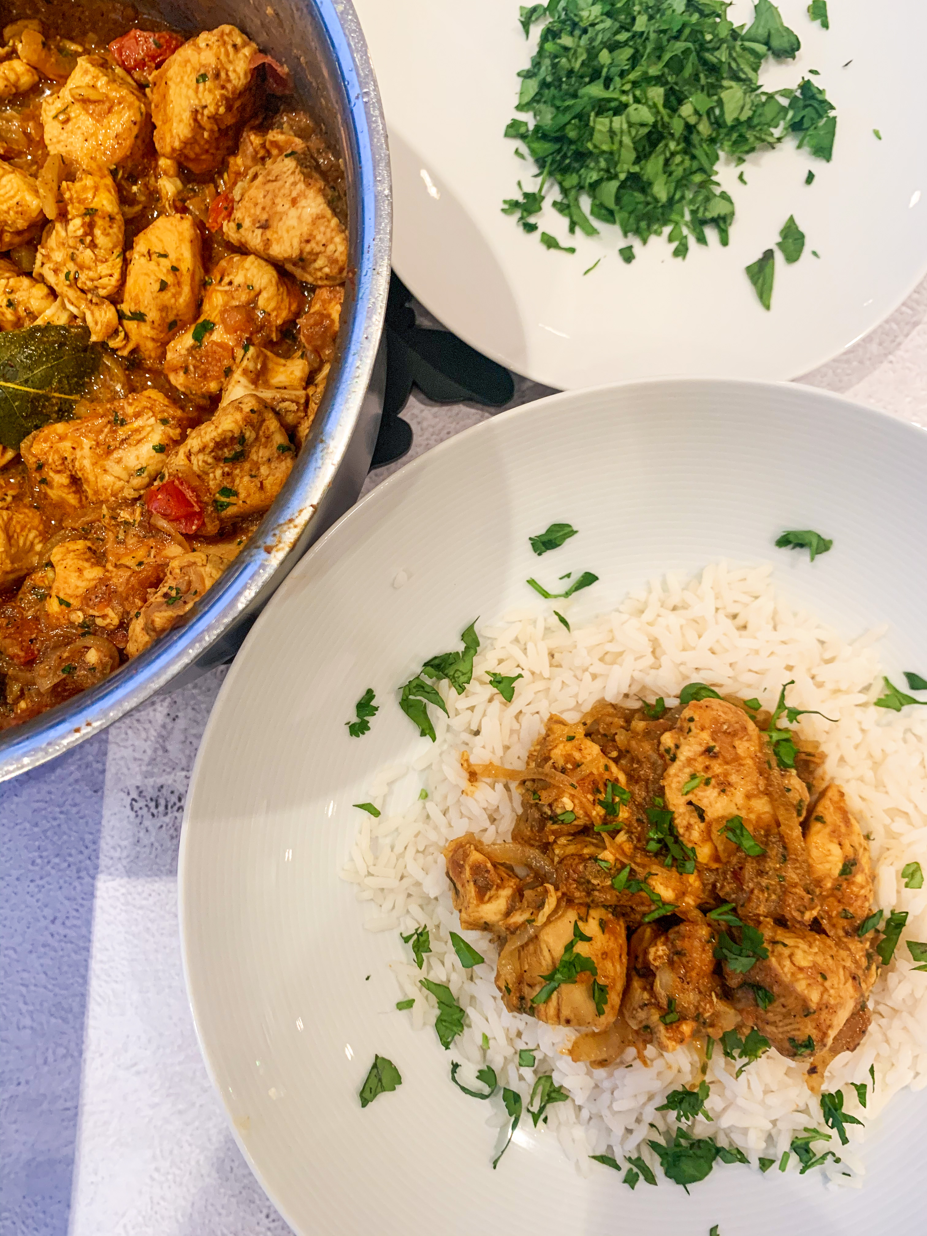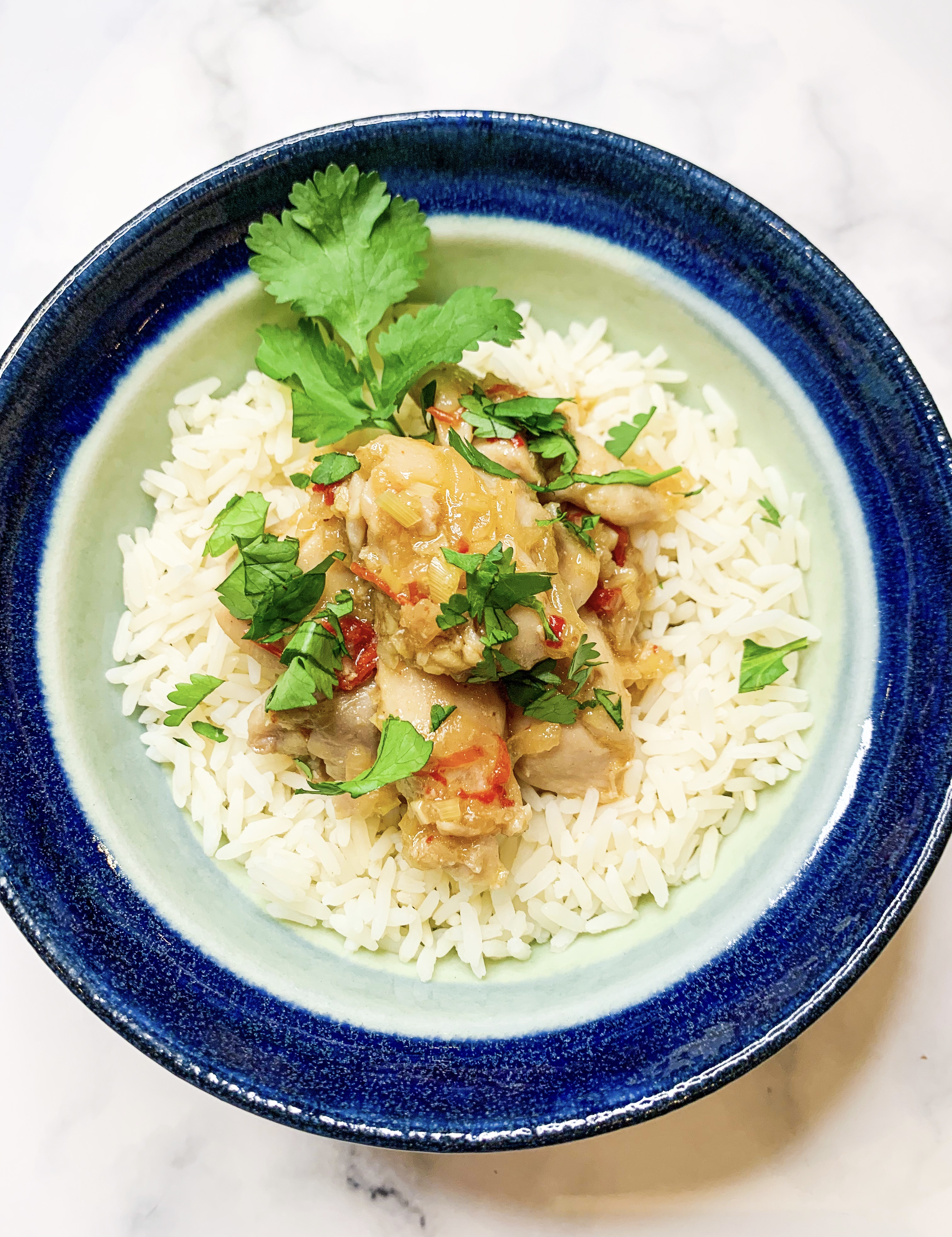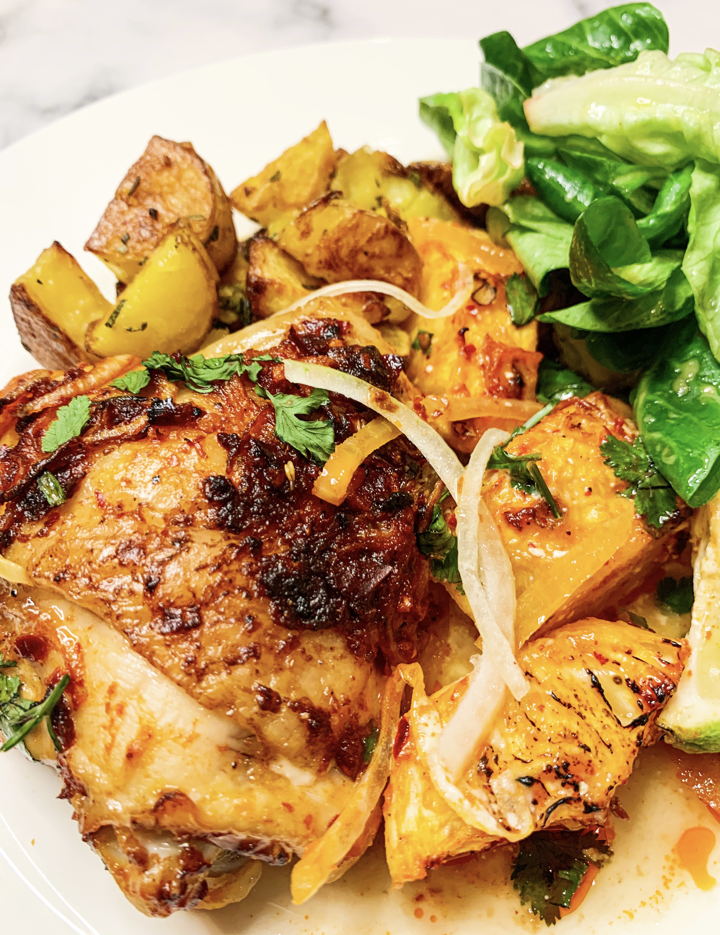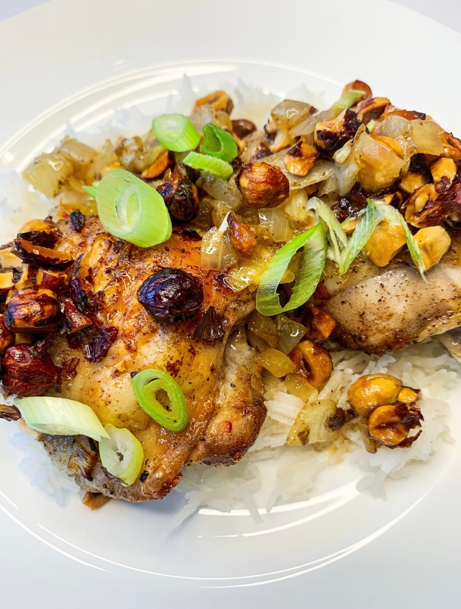 This chicken dish is very simple to prepare, it’s a one-pan recipe from Rukmini Iyer’s cookbook ‘A Roasting Tin Around the World’; it’s the ultimate traybake! The rich coconut aromas of this roast will make your kitchen smell wonderful. It’s incredibly moreish and mild enough for younger taste buds – serve some fresh, sliced chilli on the side for more daring adults. You can simply serve with rice or in addition, I’ve discovered that this roast and its spices go particularly well with a salad that I found in the cookbook ‘Agak Agak’ by Shu Han Lee (recipe here); it’s a Singaporean recipe which complements the Malaysian flavours of the chicken – the combination is a delicious Southeast Asian dream!