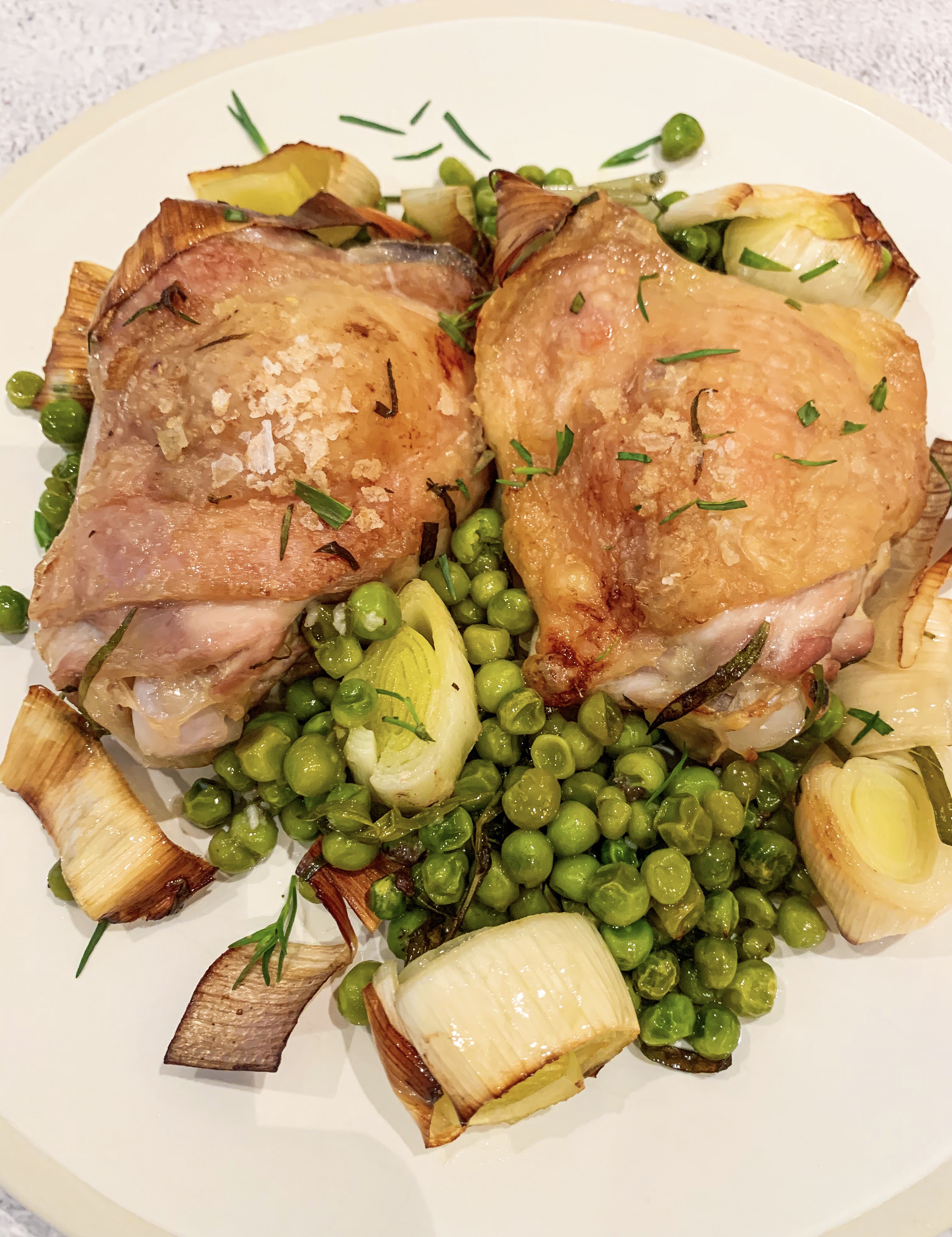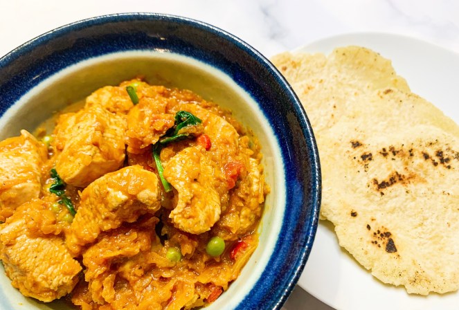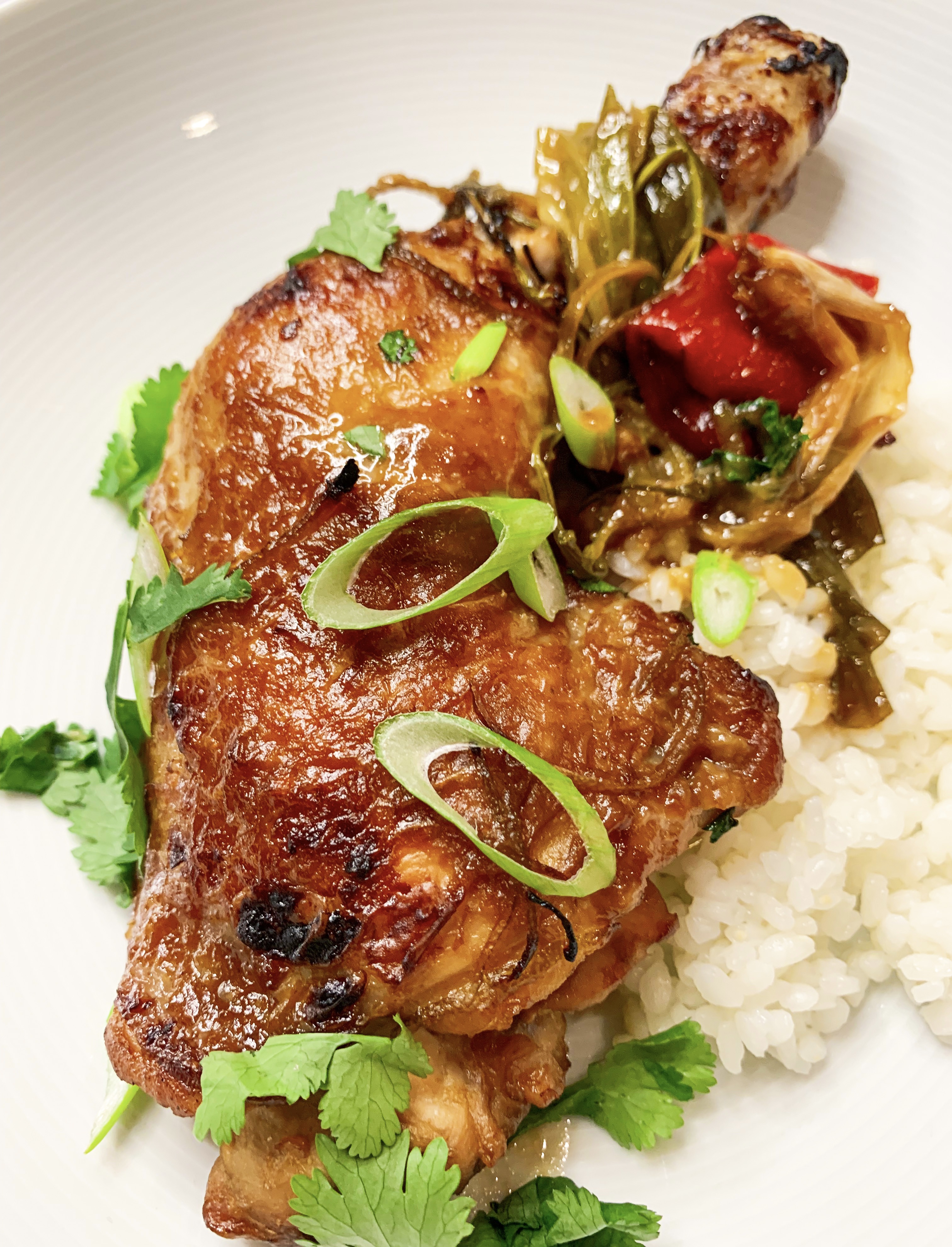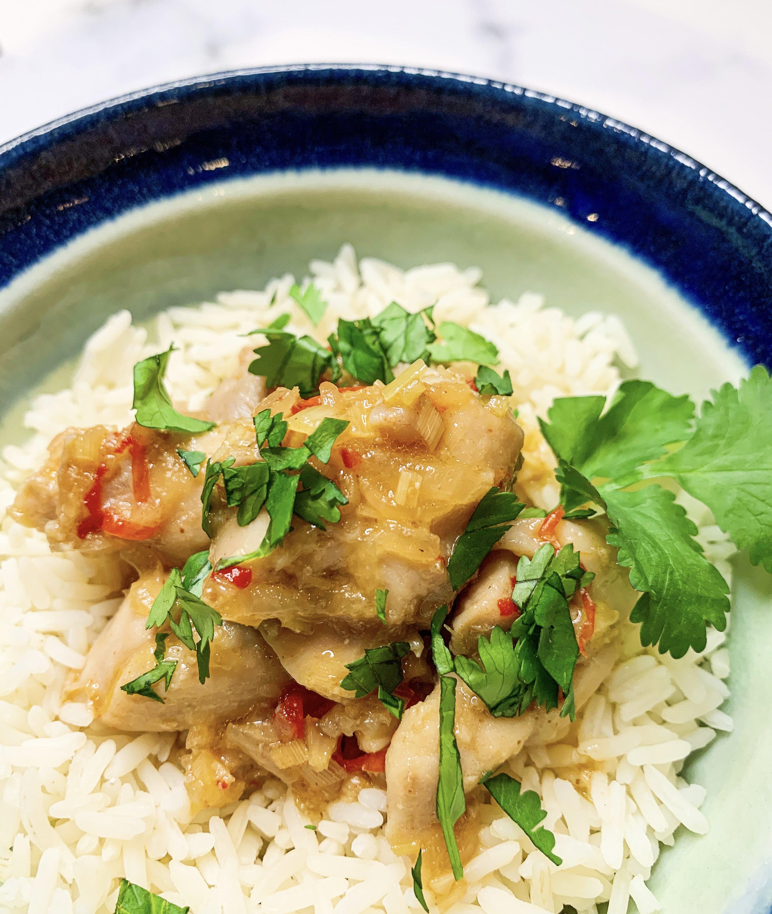 This chicken dish is very simple to prepare, it’s a one-pan recipe from Rukmini Iyer’s cookbook ‘A Roasting Tin Around the World’; it’s the ultimate traybake! The rich coconut aromas of this roast will make your kitchen smell wonderful. It’s incredibly moreish and mild enough for younger taste buds – serve some fresh, sliced chilli on the side for more daring adults. You can simply serve with rice or in addition, I’ve discovered that this roast and its spices go particularly well with a salad that I found in the cookbook ‘Agak Agak’ by Shu Han Lee (recipe here); it’s a Singaporean recipe which complements the Malaysian flavours of the chicken – the combination is a delicious Southeast Asian dream!