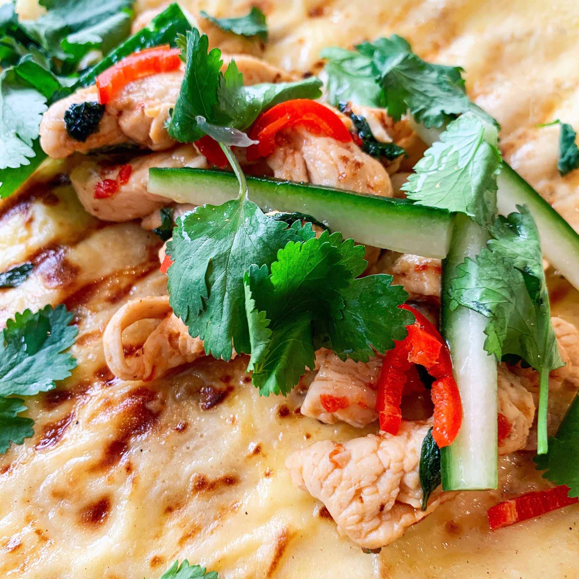 - Whilst the chicken is cooking, peel the cucumber, cut it in half and deseed, then cut into slices the thickness of a pound coin.