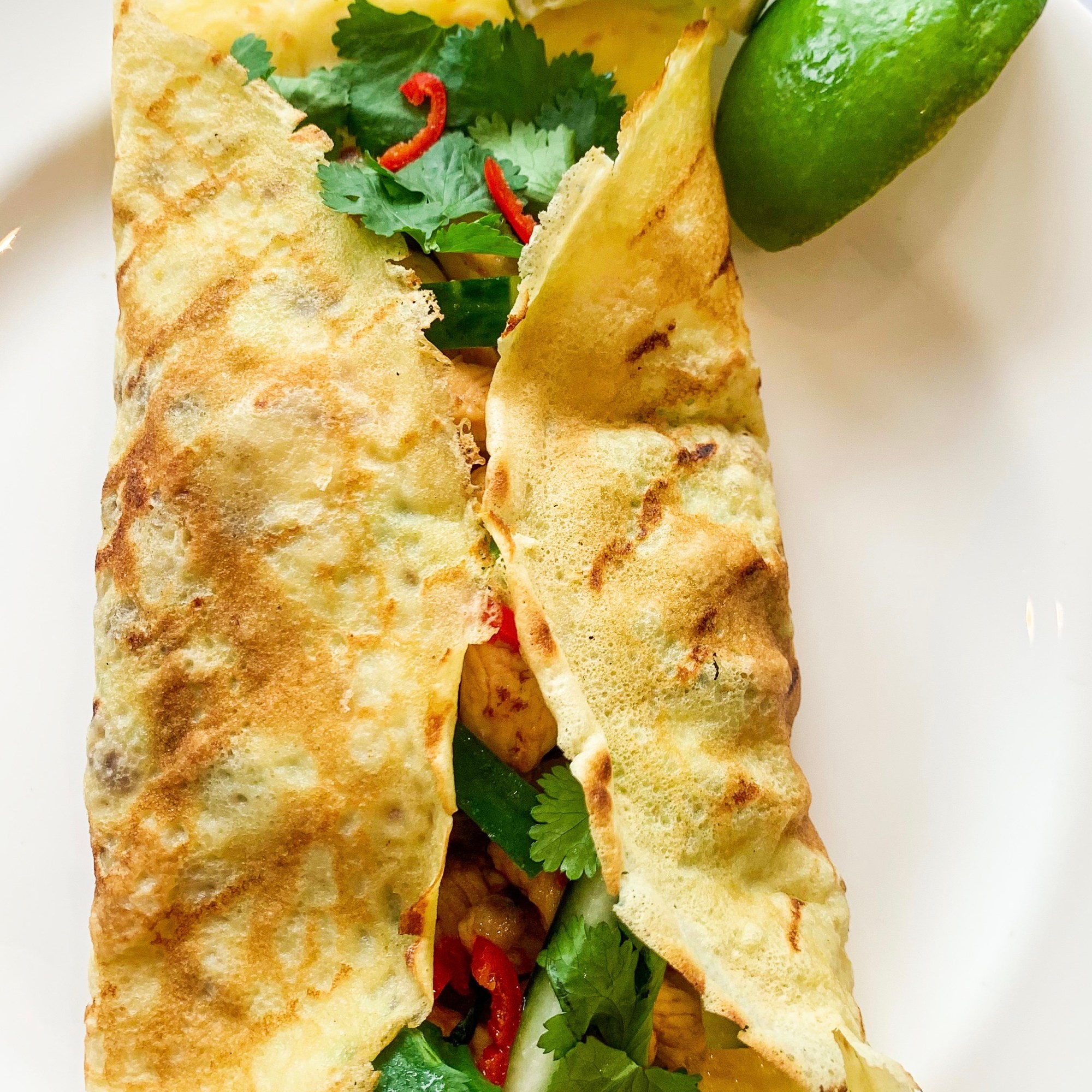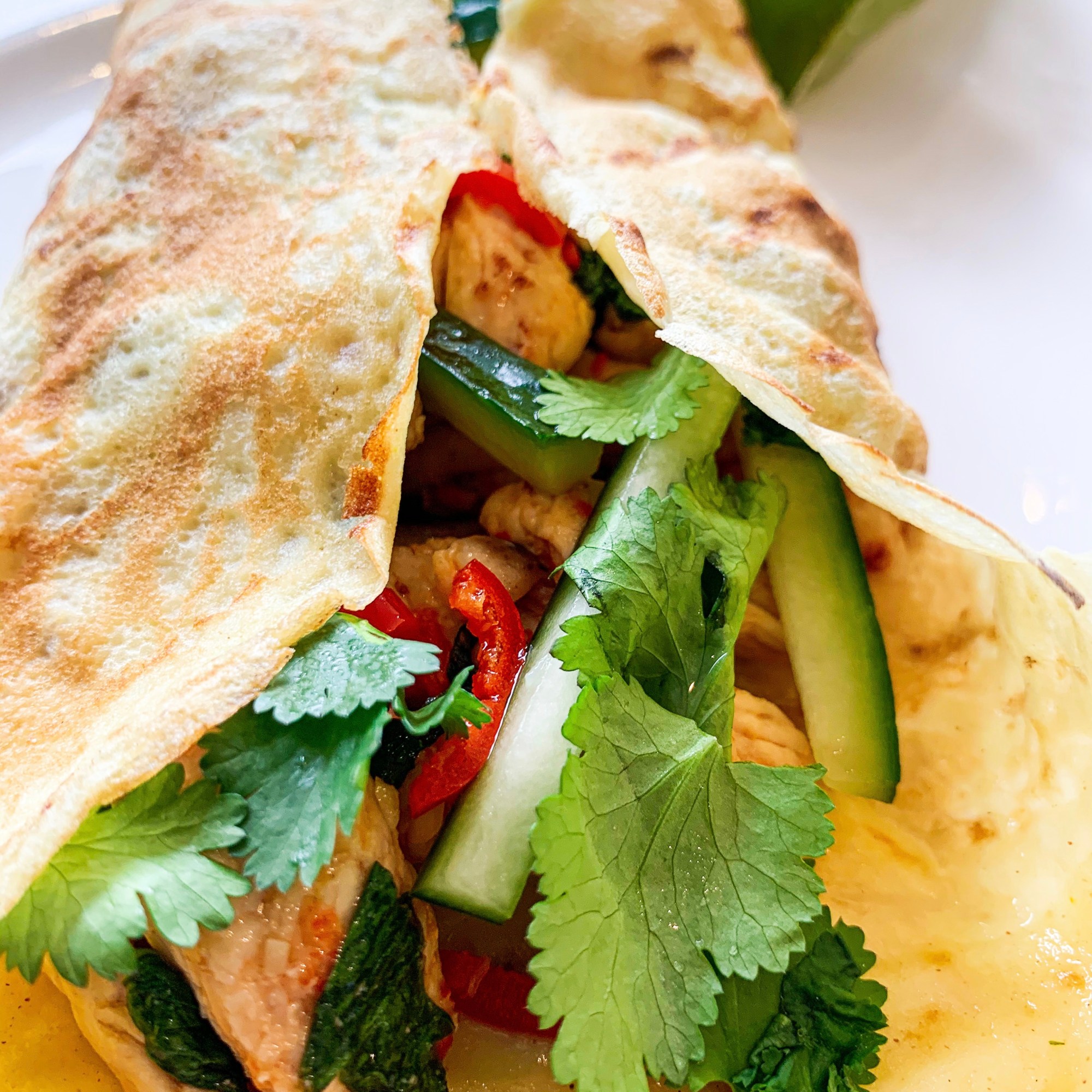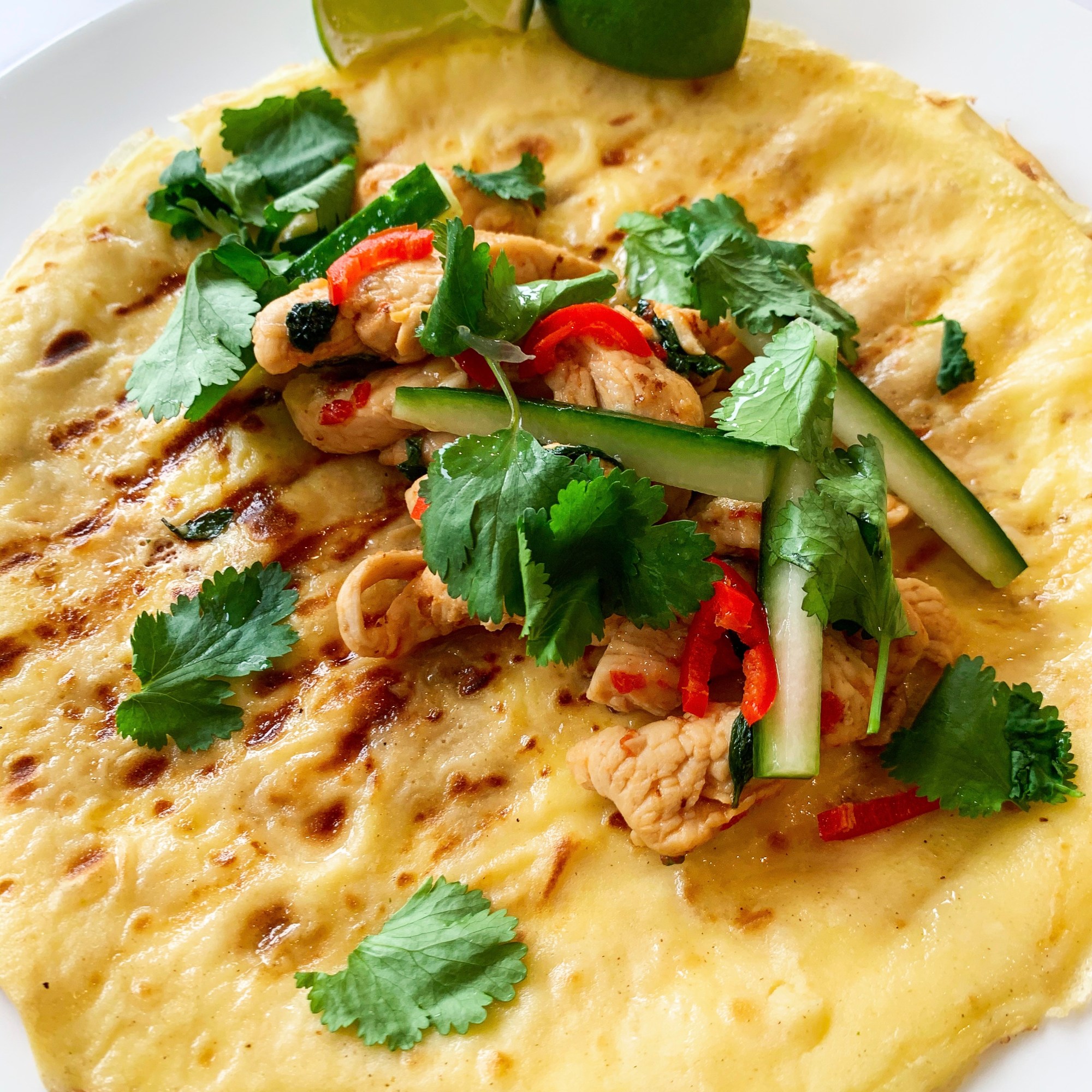 - Wipe clean the frying pan and heat another 2 tablespoons of oil, season the chicken thighs and fry on both sides until cooked – a total of about 9 minutes. Once cooked cut into strips and keep warm.