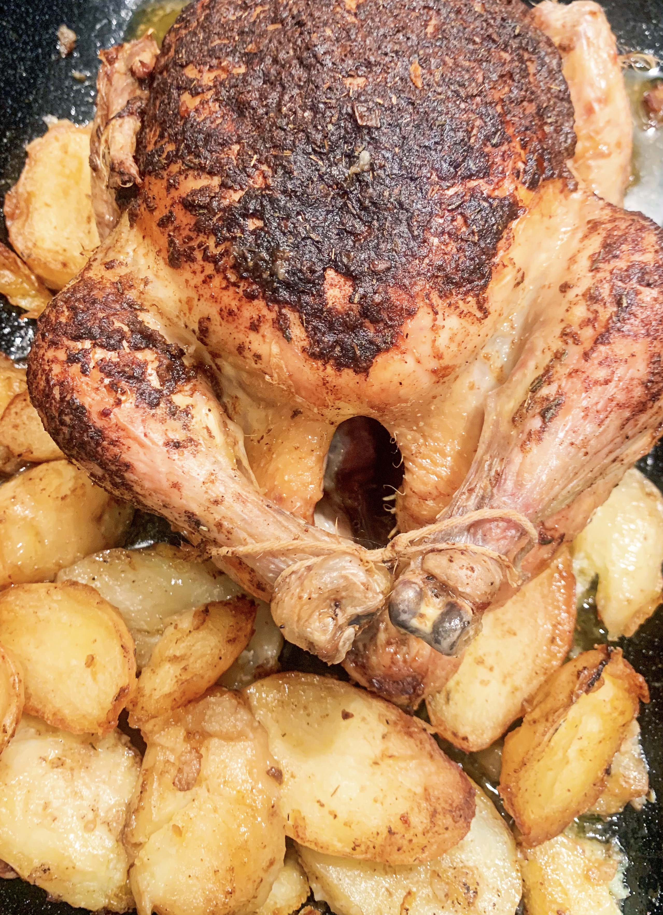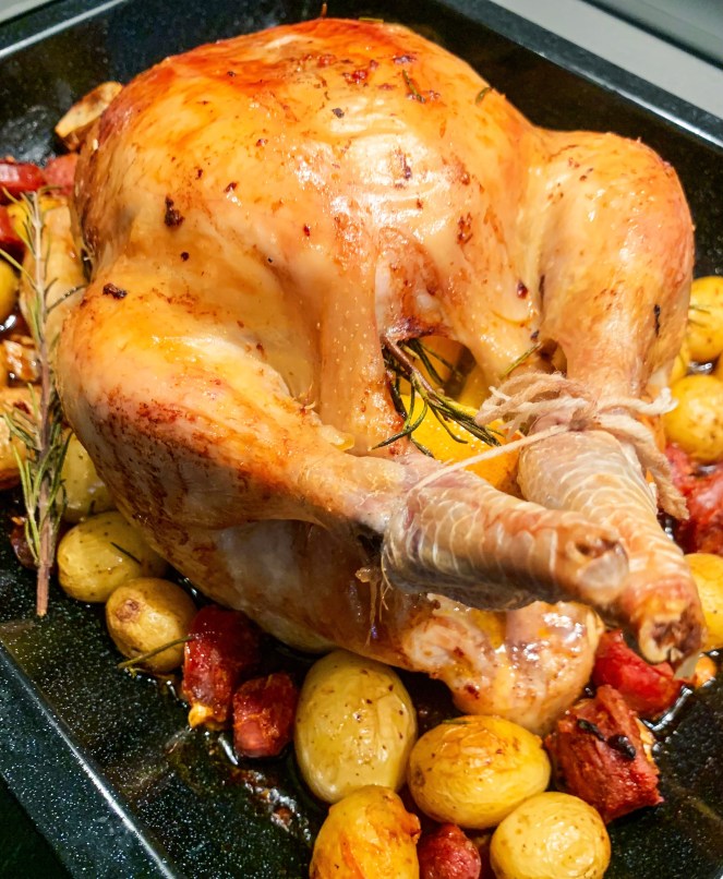 - Place in a preheated oven, 180’c fan, for 45-50 minutes, depending on the size of your chicken.