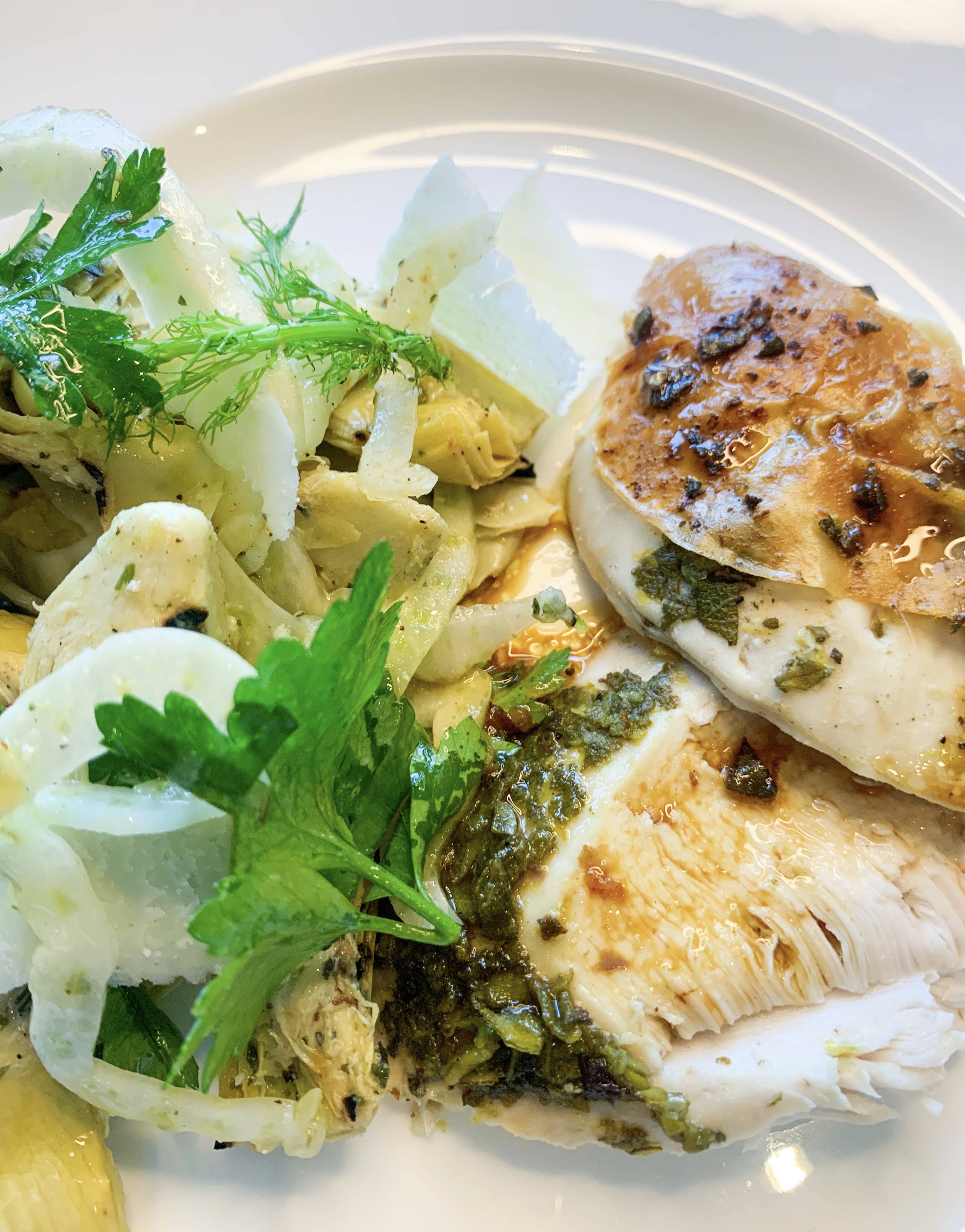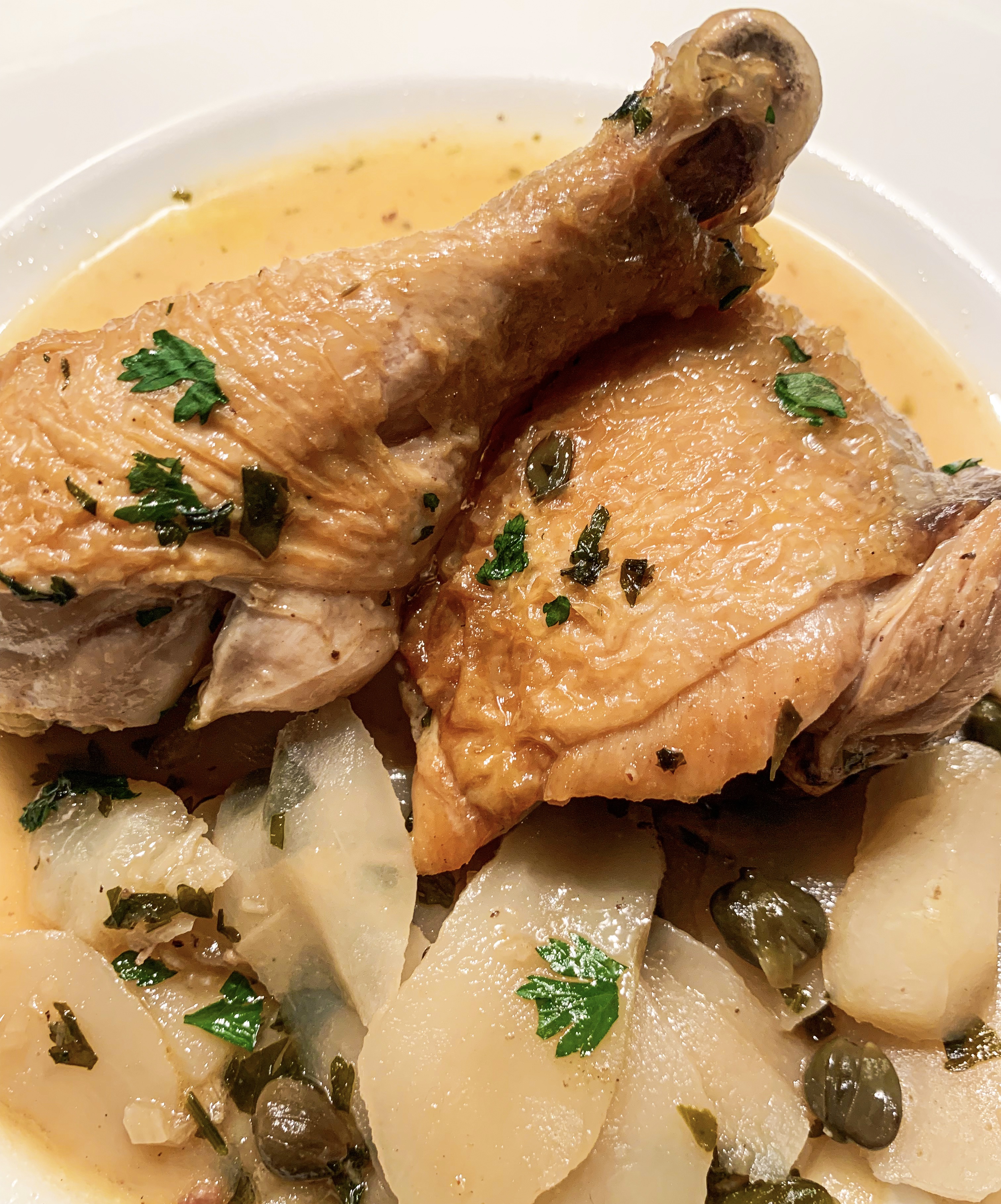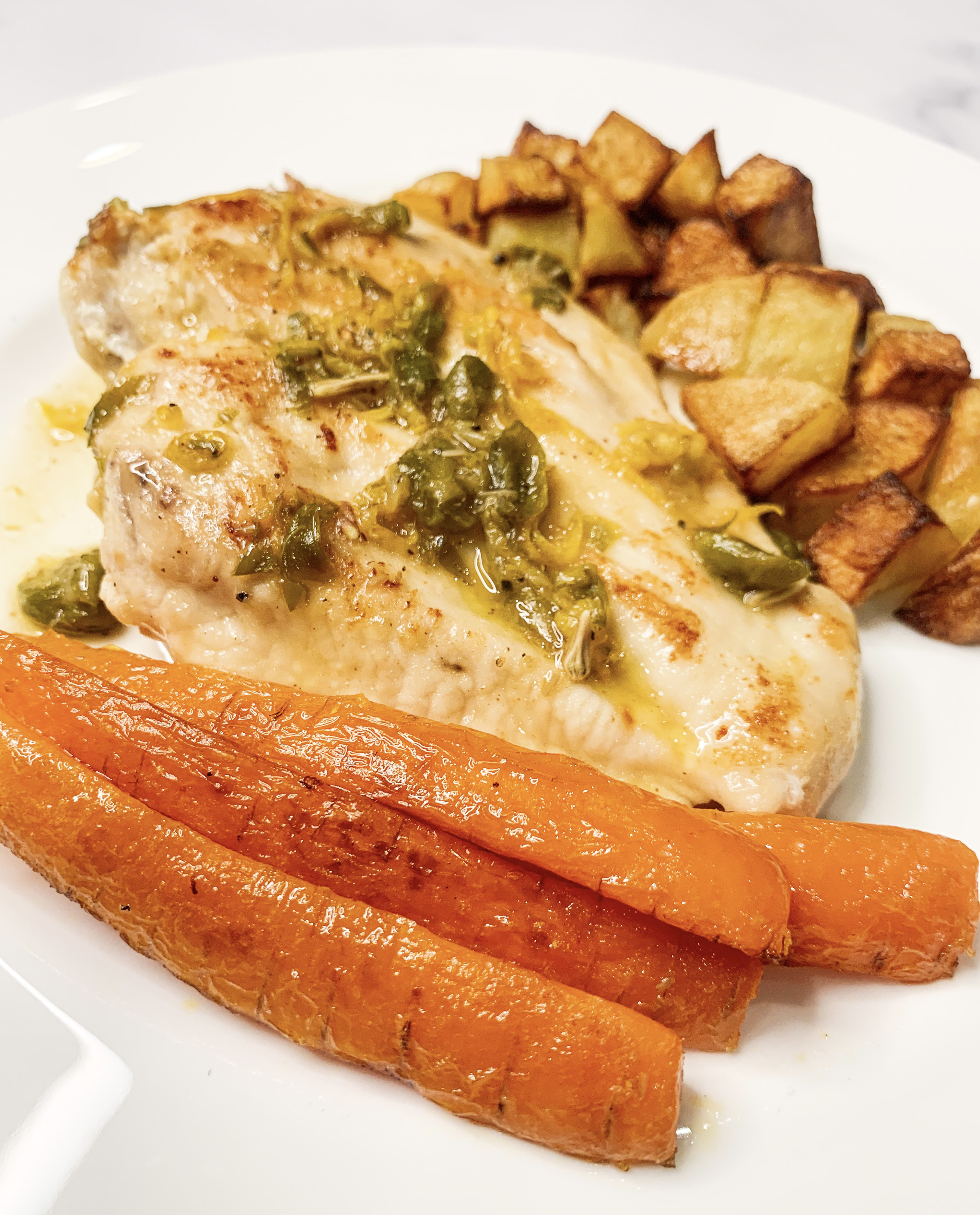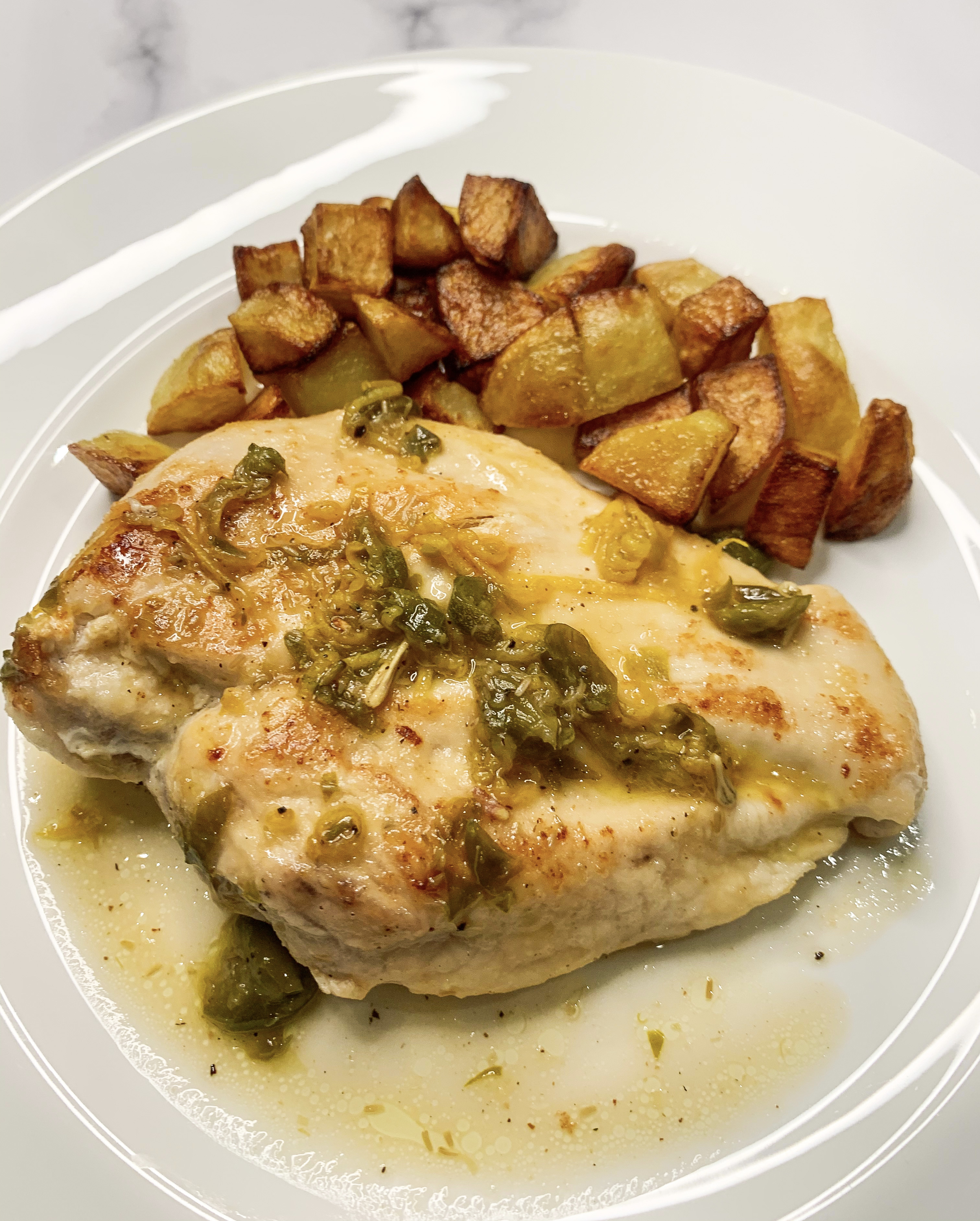 I adore the sweet, nutty flavour of Jerusalem Artichokes and when they’re in season (from October to March) I always plan to cook with them more, this recipe is the perfect way to do so. It’s a one-pan stovetop dish, the texture and nutty flavour of the Jerusalem artichokes complement the tartness of the capers; they both give this chicken dish a wonderful elegance – a treat for both friends and family!