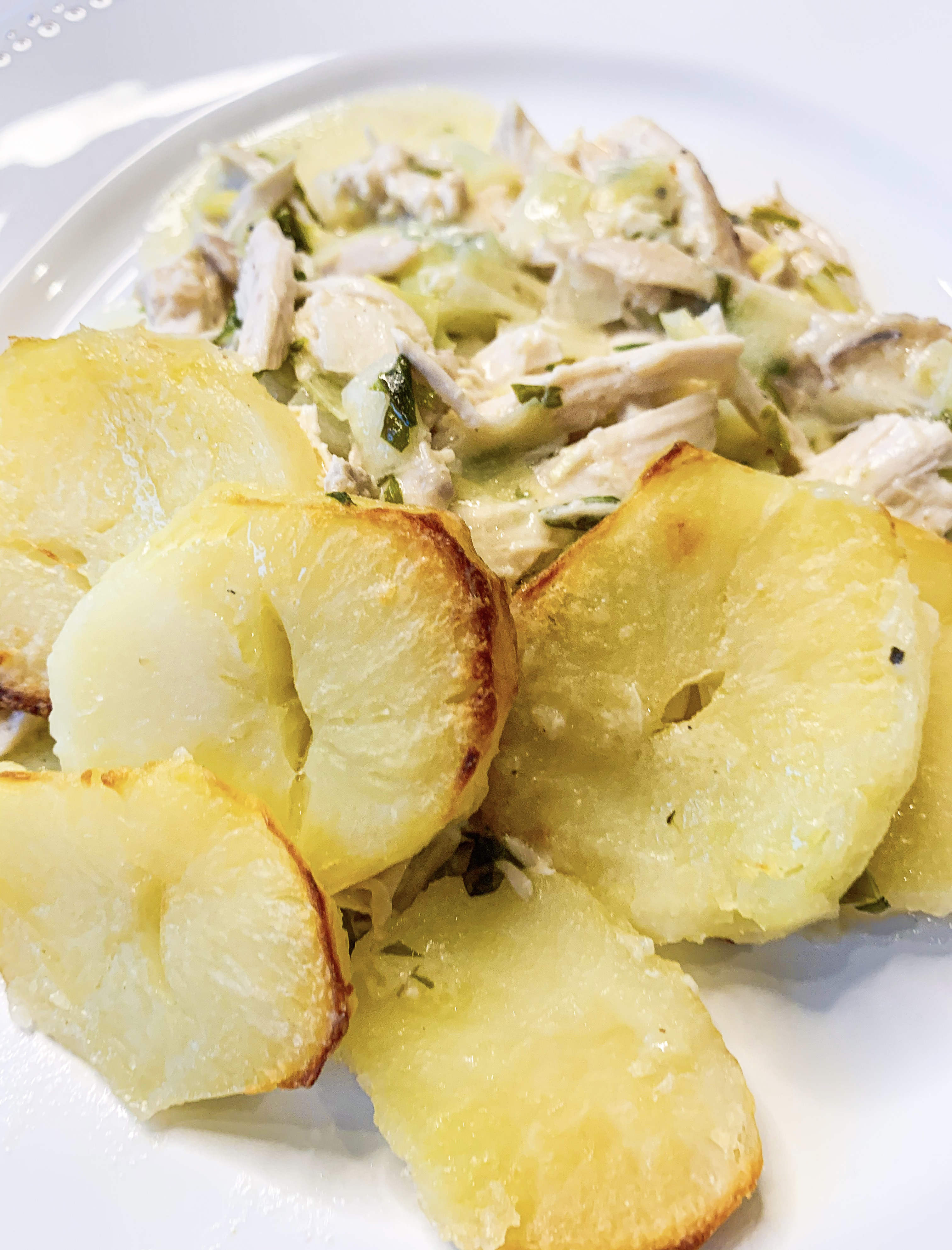 I must admit that I had not come across cucumber cooked in a sauce before finding this recipe in a magazine, but it was a revelation, you must try it! It really adds a special dimension to a simple chicken breast recipe. I like to serve it with simple, fine green beans and with ‘Concetta’s Potatoes’, these are named after our Italian friend (and chef), who gave me the recipe many years ago; they are sliced baked potatoes with garlic, rosemary and sage, alternatively steamed new potatoes go very well with this dish.