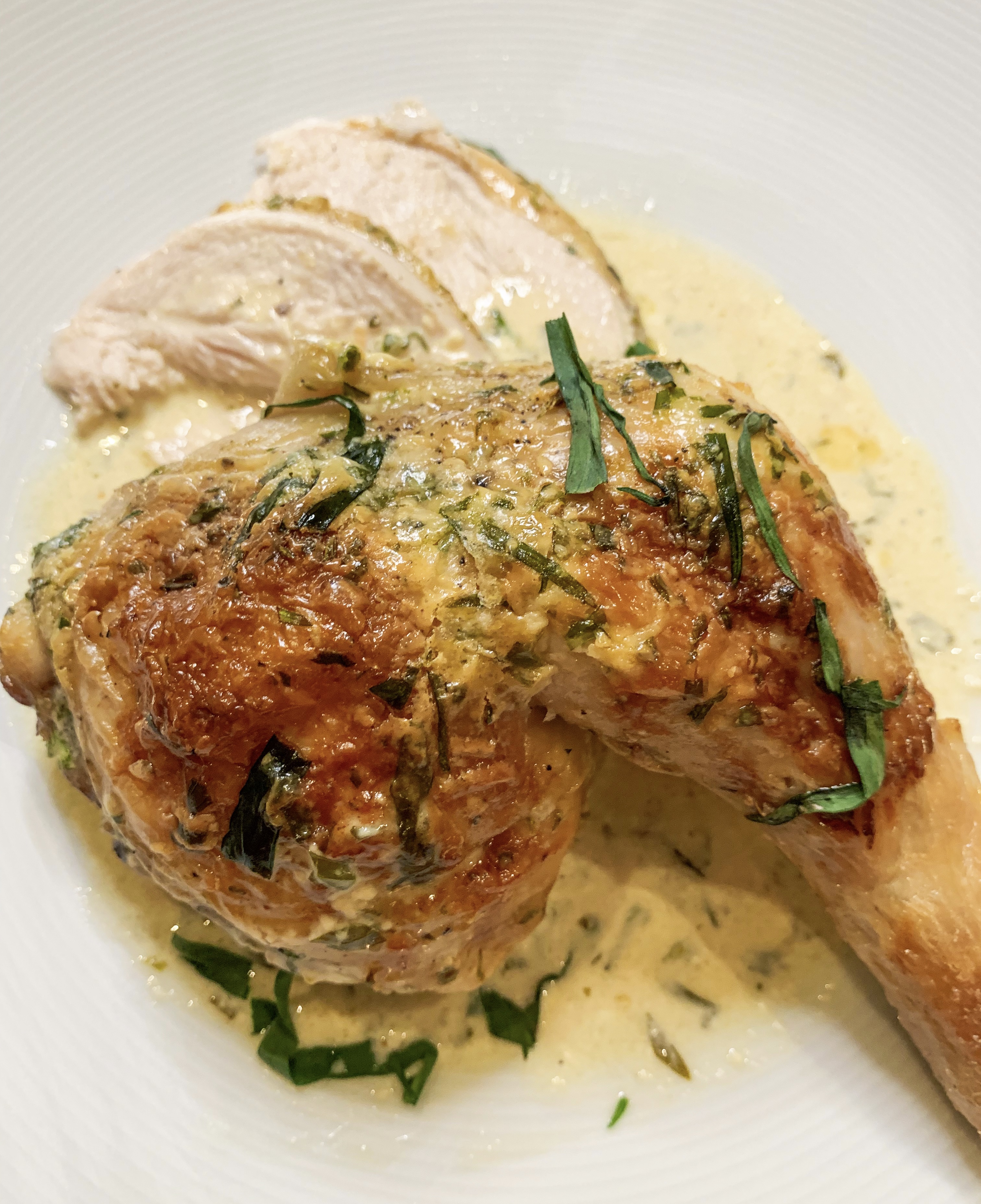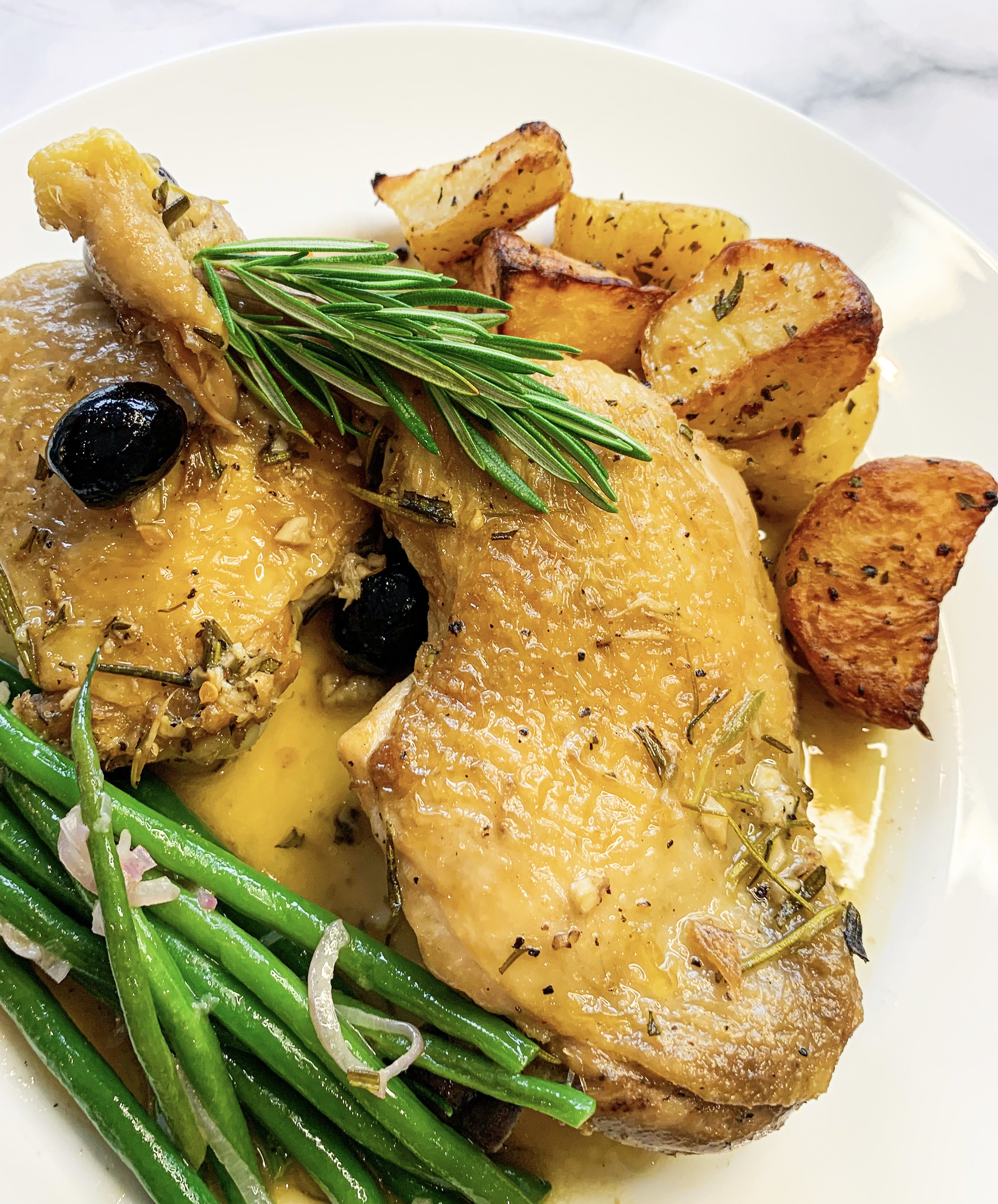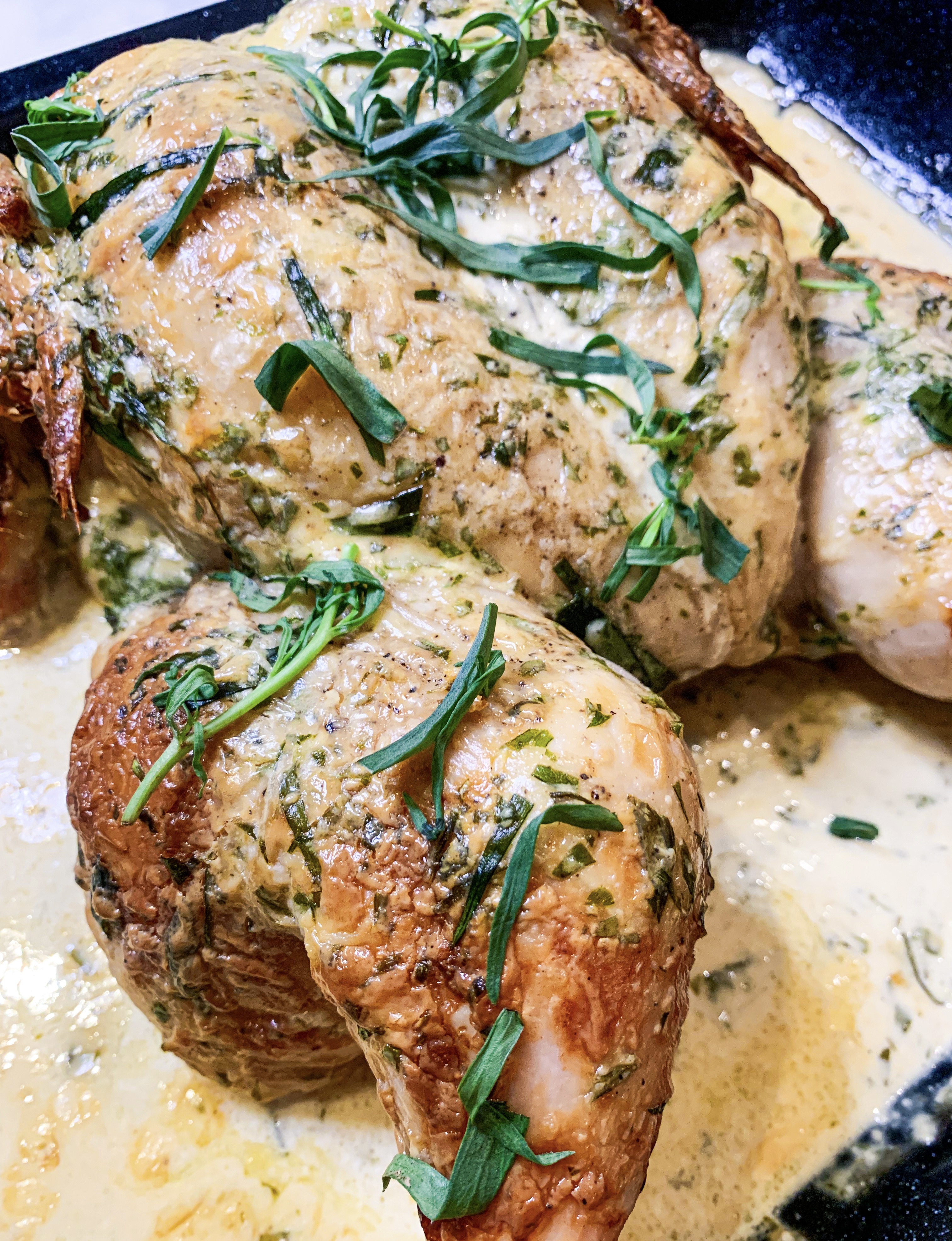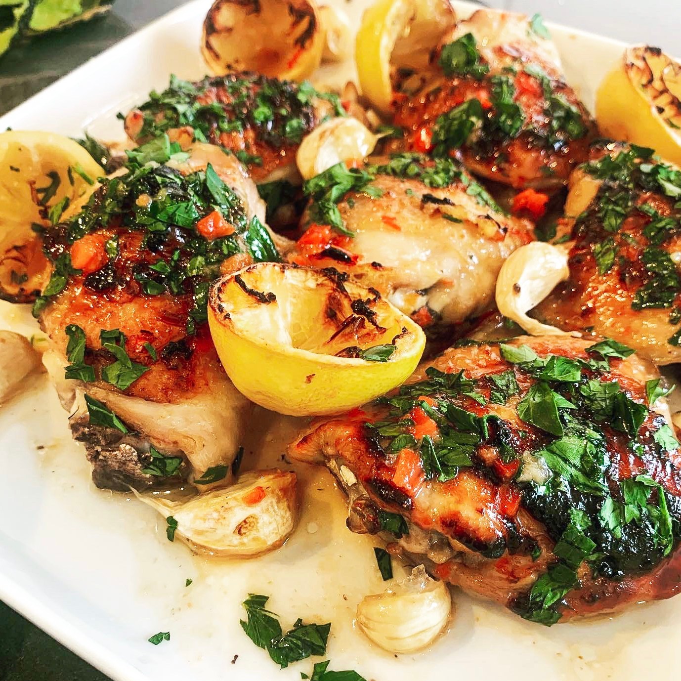 - Scatter over the parsley; serve with the lovely pan juices and the garlic cloves which will now be beautifully soft, ready to be popped out of their skins! (you can use the lemon halves for decoration).