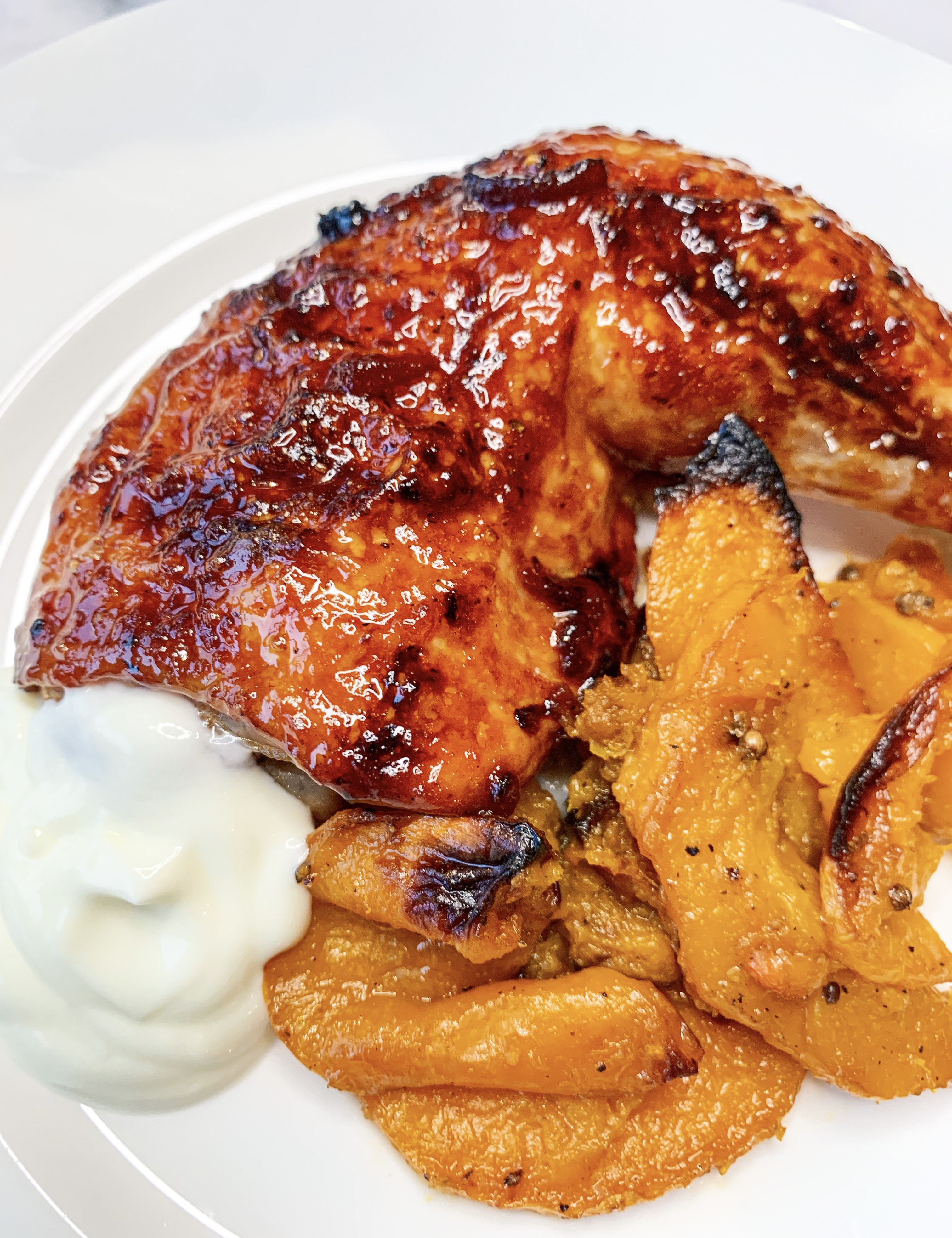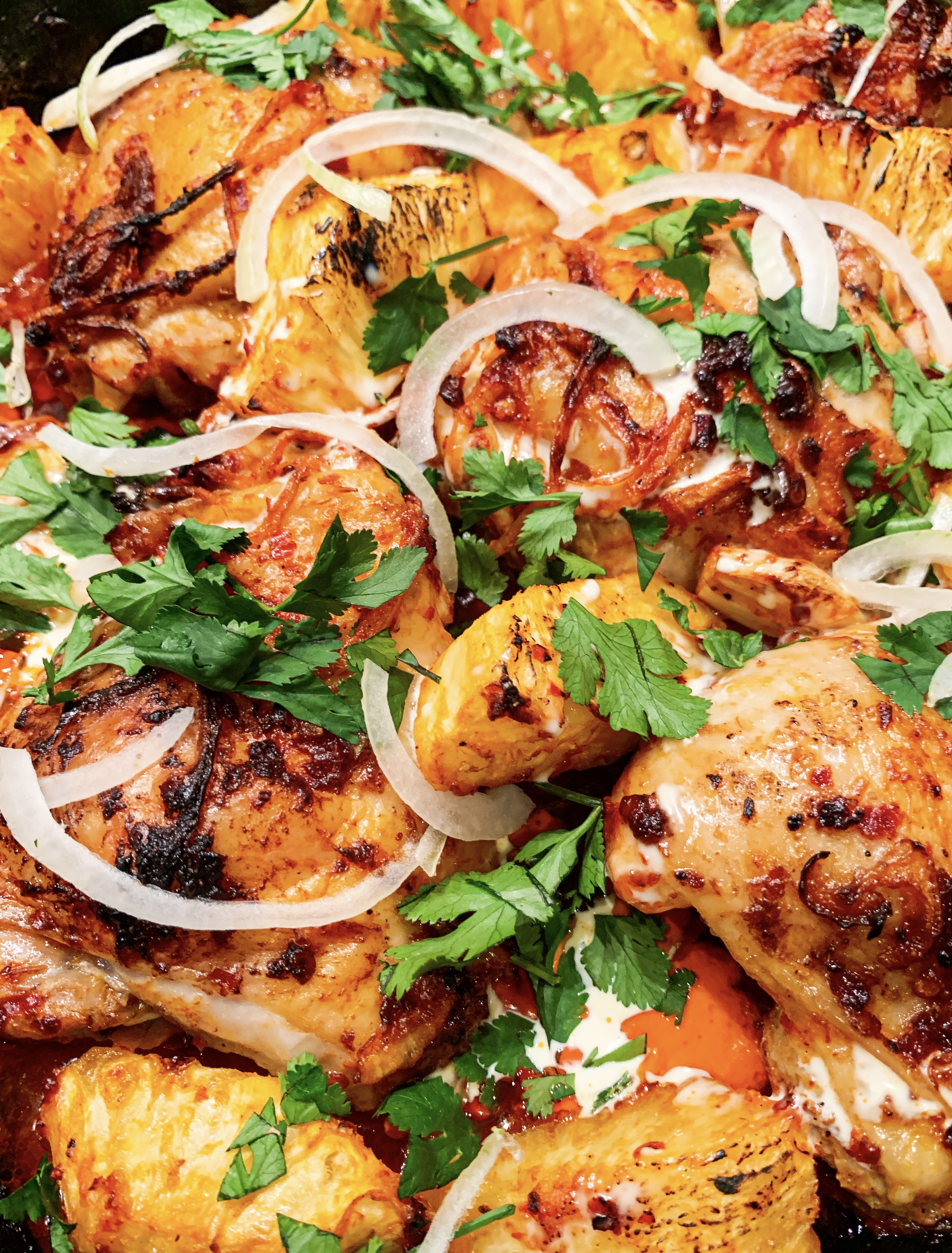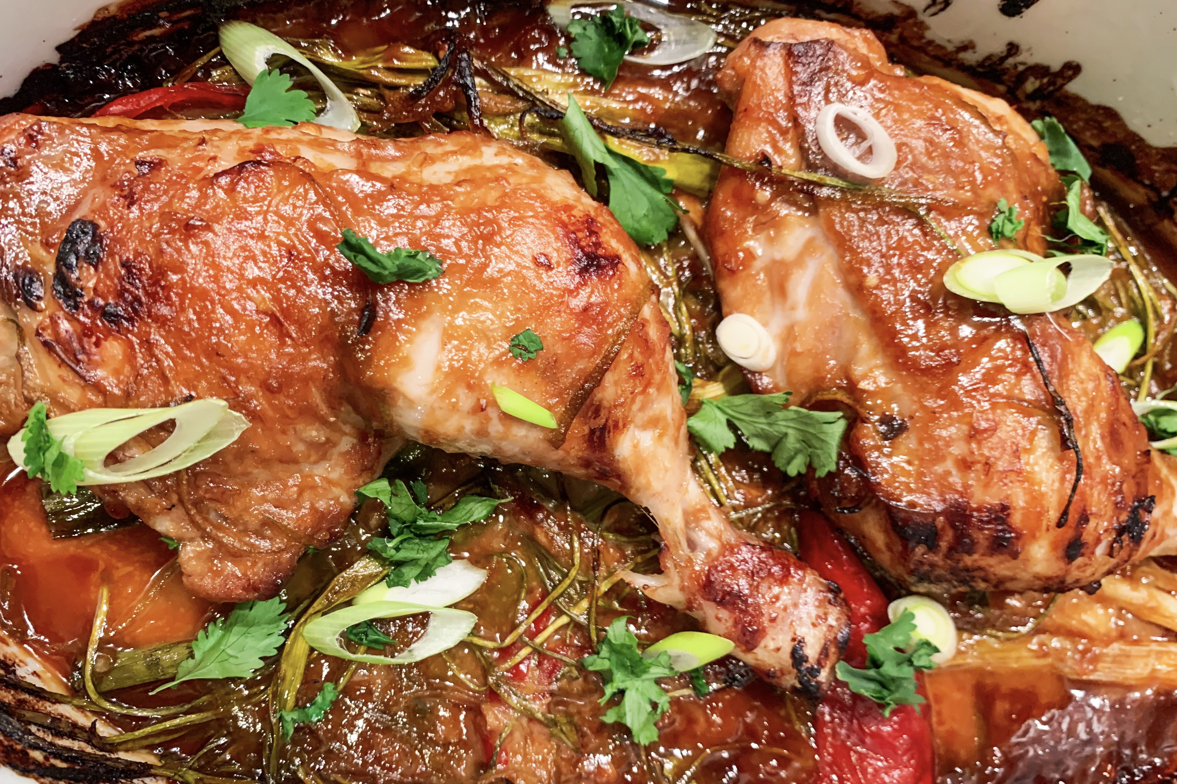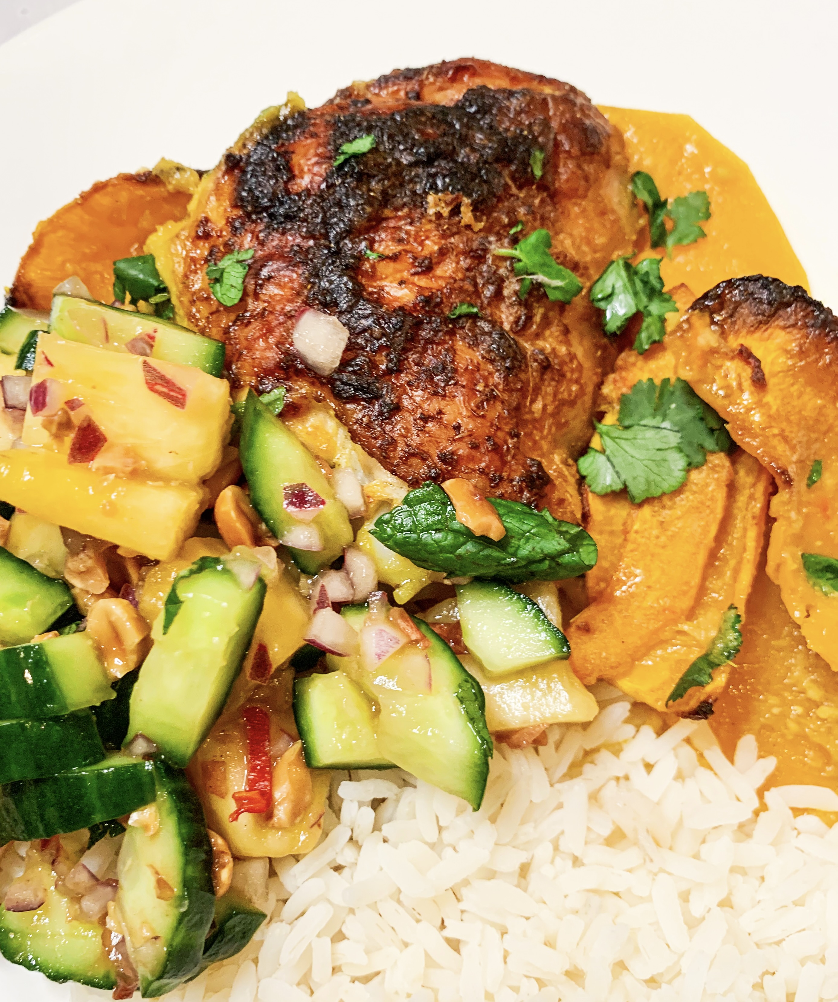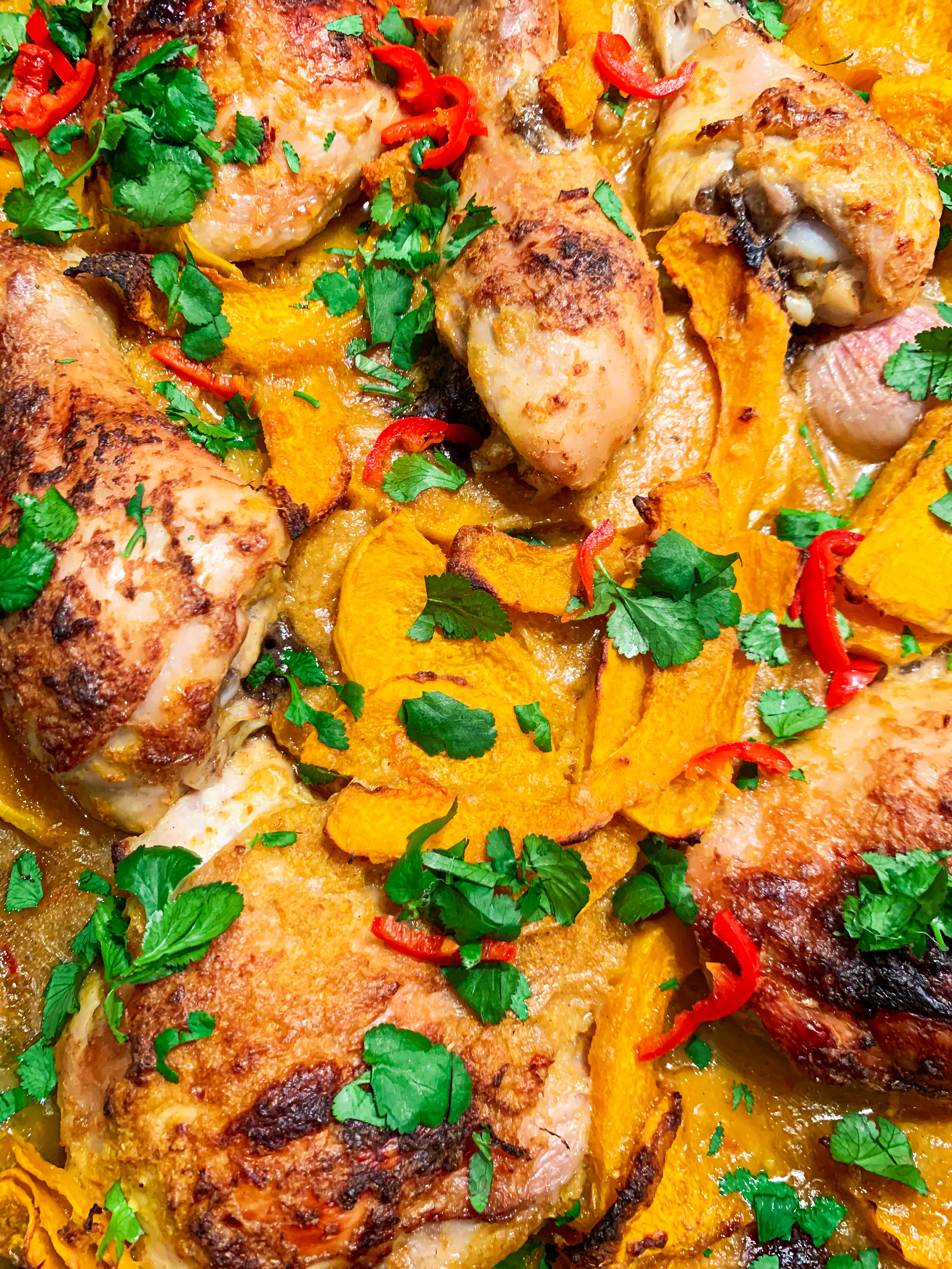 - Transfer to a preheated oven, 180’c fan, and roast for 1 hour, until the chicken is golden brown and cooked through and the squash is soft. Scatter over thinly sliced chilli and chopped coriander. Serve with rice and/or ‘Cucumber, Pineapple & Peanut Rojak’ (recipe here).