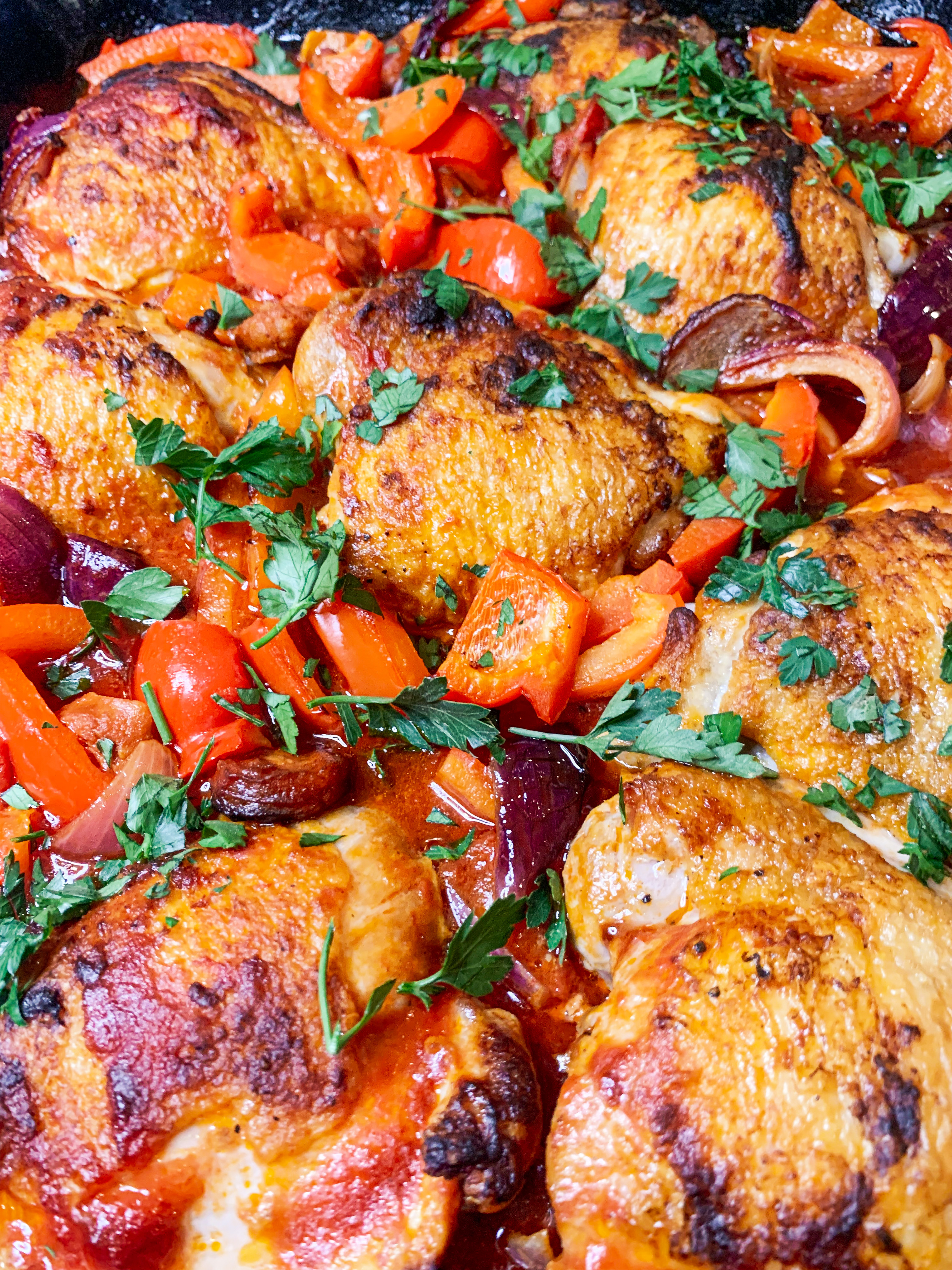 My son, Felix, discovered this recipe. When he cooked it for me I was so impressed by its fantastic flavours that I knew straight away that it would be a recipe that I would have to share with you. Not only is it delicious but incredibly simple to cook – a one pot roast which would be easy to cook any day of the week. This recipe is by Jamie Oliver who is renowned for his simple yet tasty dishes but I think he’s excelled himself with this one!